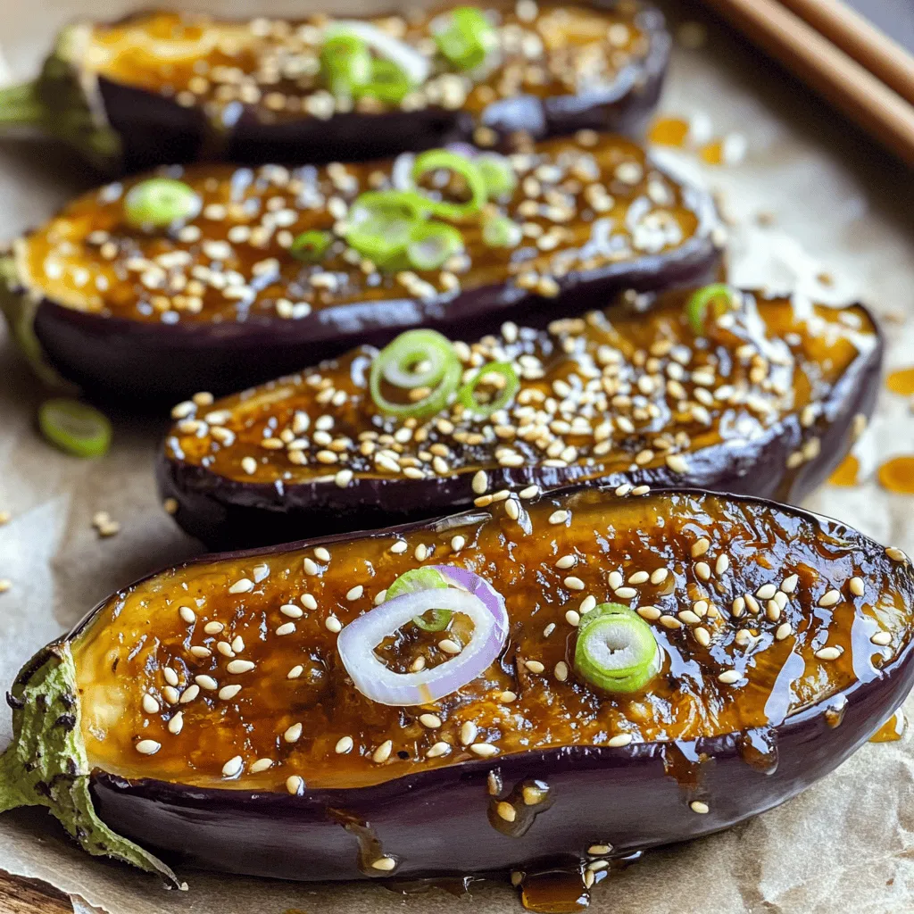 ![To make miso glazed eggplant, gather these items: - 2 medium eggplants - 3 tablespoons white miso paste - 2 tablespoons maple syrup or honey - 1 tablespoon sesame oil - 2 tablespoons soy sauce (or tamari for gluten-free) - 1 teaspoon rice vinegar - 1 tablespoon grated fresh ginger - 2 cloves garlic, minced - 1 tablespoon sesame seeds (for garnish) - 2 green onions, finely sliced (for garnish) These ingredients work together to create a rich and savory glaze. The eggplant absorbs the flavors well, making each bite delicious. You can add a few items to boost the taste: - Chili flakes for heat - Fresh herbs like cilantro or basil - A splash of citrus juice for brightness These extras can take your dish to the next level. Even small tweaks can add exciting flavors. When picking eggplants, look for these signs: - Choose firm, shiny skins without blemishes. - The color should be deep purple or glossy black. - Smaller eggplants tend to be less bitter and more tender. Fresh eggplants will make your dish taste great. Always check for quality before buying. Start by preheating your oven to 400°F (200°C). This ensures the eggplants cook evenly. Next, take your medium eggplants and slice them in half lengthwise. Make sure to cut all the way through the flesh but not the skin. A crisscross pattern works best. This allows the glaze to soak in well. Place the eggplant halves on a cutting board, cut side up, and get ready for the glaze. In a medium bowl, mix 3 tablespoons of white miso paste with 2 tablespoons of maple syrup or honey. The sweetener balances the salty miso. Add 1 tablespoon of sesame oil for a nutty flavor. Then, pour in 2 tablespoons of soy sauce and 1 teaspoon of rice vinegar. These ingredients enhance the glaze's depth. Finally, add 1 tablespoon of grated fresh ginger and 2 cloves of minced garlic. Whisk everything until it is smooth. This creamy glaze will add tons of flavor to the eggplant. Now it’s time to bake! Brush the miso glaze generously over the cut sides of the eggplant halves. Make sure the glaze seeps into the scored flesh. Place the eggplant cut side up on a lined baking sheet. Bake them for about 25 to 30 minutes. This will make them tender and caramelized. Halfway through, take them out and brush on any remaining glaze. Once done, let them cool a bit before serving. For the final touch, sprinkle sesame seeds and sliced green onions on top. Enjoy this flavorful dish! You can check the [Full Recipe] for more details. To get the best texture, choose medium eggplants. They should feel firm and heavy. Next, score the flesh lightly. This step helps the glaze soak in well. Bake them until tender but not mushy. The eggplant should have a slight bite for great texture. Some eggplants can taste bitter. To reduce bitterness, sprinkle salt on the eggplant after cutting. Let them sit for about 20 minutes. This process draws out extra moisture and bitterness. Rinse them well with water and pat dry with a paper towel to remove excess salt. You can prepare the miso glaze in advance. Mix the miso paste, maple syrup, sesame oil, soy sauce, rice vinegar, ginger, and garlic in a bowl. Store the glaze in the fridge for up to a week. Just remember to stir it before using. This way, you save time on busy cooking days. For the full recipe, check out the details above. {{image_2}} Miso glazed eggplant is already a great choice for both vegetarians and vegans. The main ingredient, eggplant, adds rich flavor. The miso glaze provides umami, making it tasty and satisfying. If you want a vegan twist, use maple syrup instead of honey. You can also add more vegetables. Try bell peppers or zucchini alongside the eggplant. They will soak up the glaze and add more color. When serving miso glazed eggplant, think about what to pair it with. It goes well with rice or quinoa for a hearty meal. The grains soak up the glaze and balance the dish. You can also serve it with a fresh salad to add crunch. For a complete meal, add some protein, like tofu or chickpeas. If you don’t have miso paste, don’t worry. You can use tahini or peanut butter as a substitute. Both add creaminess and flavor. For a different taste, try tahini mixed with lemon juice. This will give the dish a nice zing. If you need it gluten-free, use tamari instead of soy sauce. These simple swaps keep the dish delicious and exciting. For the full recipe, check out the details above! To keep your leftover miso glazed eggplant fresh, place it in an airtight container. Make sure it cools completely before sealing it. Store it in your fridge for up to three days. This method helps maintain its texture and flavor. If you plan to eat it later, slicing the eggplant before storing can help with portion control. When you're ready to enjoy the leftovers, you can reheat the eggplant. The best way is to use an oven. Preheat your oven to 350°F (175°C). Place the eggplant on a baking sheet lined with parchment paper. Reheat it for about 10-15 minutes. This method keeps the eggplant warm and helps revive its nice, caramelized edges. You can also use a microwave for quick reheating. Just microwave for 1-2 minutes, but it may lose some texture. You can freeze miso glazed eggplant, but it's best to do so before cooking. Halve and score the eggplants, then coat them with the miso glaze. Place the glazed halves in a freezer bag. Make sure to remove as much air as possible. You can freeze them for up to three months. When you’re ready to cook, thaw them overnight in the fridge and bake as usual. This way, you keep that great flavor and texture! For the full recipe, check out the earlier section. Miso is a thick paste made from fermented soybeans. It has a salty, umami flavor. You can find different types of miso, like white, red, and yellow. Each type brings a unique taste to dishes. I love using miso for its depth. It enhances the flavor of vegetables, meats, and soups. Miso adds richness without needing heavy sauces. Plus, it’s packed with probiotic