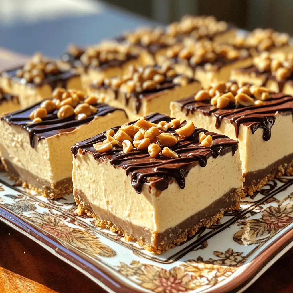 - 1 1/2 cups graham cracker crumbs - 1/2 cup unsalted butter, melted - 2 cups cream cheese, softened - 1 cup creamy peanut butter - 3/4 cup powdered sugar - 1 teaspoon vanilla extract - 1 cup heavy whipping cream - 1/4 cup chopped peanuts (for topping) - Chocolate syrup (for drizzling, optional) To create these no-bake peanut butter cheesecake bars, you need simple ingredients. Each one plays a key role in the taste and texture. Graham cracker crumbs form the crust. They give a sweet and crunchy base. The melted unsalted butter binds the crumbs, making it firm. For the filling, use softened cream cheese and creamy peanut butter. These two create a rich and smooth blend. Powedered sugar adds sweetness, while vanilla extract enhances flavor. Heavy whipping cream is crucial. You whip it until stiff peaks form, which makes the filling light and airy. For the topping, sprinkle chopped peanuts for crunch. If you love chocolate, drizzle some syrup on top for extra flavor. Gather these ingredients to make a delicious treat that everyone will love! - In a medium bowl, combine 1 1/2 cups of graham cracker crumbs and 1/2 cup of melted unsalted butter. - Mix until the crumbs are coated well. - Next, press this mixture firmly into the bottom of an 8x8-inch baking dish. Make sure it is even. - In a large mixing bowl, beat together 2 cups of softened cream cheese and 1 cup of creamy peanut butter. - Mix until it becomes smooth and creamy. - Gradually add in 3/4 cup of powdered sugar and 1 teaspoon of vanilla extract. Continue mixing until everything is well combined. - In a separate bowl, whip 1 cup of heavy whipping cream until stiff peaks form. - Gently fold the whipped cream into the peanut butter mixture. Be careful not to deflate it. - Spread this filling evenly over the graham cracker crust in the baking dish. - Smooth the top with a spatula and sprinkle 1/4 cup of chopped peanuts over the filling. - Cover with plastic wrap and refrigerate for at least 4 hours, or until set. Using room temperature ingredients is key for a smooth filling. Cold cream cheese can create lumps. Let it sit out for about 30 minutes before mixing. This helps it blend well with the peanut butter. When you whip the heavy cream, you want it to form stiff peaks. This makes your cheesecake light and fluffy. After whipping, gently fold the cream into the peanut butter mixture. Use a spatula and be careful. You don’t want to mix too hard or the whipped cream will deflate. For a lovely presentation, serve your cheesecake bars on a decorative platter. You can add a garnish to each bar. A whole peanut or a dollop of whipped cream works great. It makes each piece look special. If you host a party, cut the bars into small squares. This way, guests can enjoy a bite-sized treat. Drizzle some chocolate syrup over the top for added flair. It also gives a nice contrast to the creamy peanut butter flavor. {{image_2}} You can make your no-bake peanut butter cheesecake bars even more exciting. One easy way is to add chocolate or caramel swirls. Just melt some chocolate or caramel and gently swirl it into the peanut butter filling. This gives a sweet twist and looks beautiful. Another fun option is to use different nut butters. Instead of creamy peanut butter, try almond or cashew butter. Each nut butter adds its own unique flavor. You can mix and match to find your favorite. If you need gluten-free options, you can easily adjust the crust. Use gluten-free graham cracker crumbs or crushed nuts. This way, everyone can enjoy these tasty bars. For dairy-free alternatives, swap out cream cheese and whipped cream with plant-based versions. Look for coconut cream or cashew cream cheese. These options still give you a creamy texture without the dairy. Making these changes helps you cater to different diets. It keeps the delicious taste while being mindful of your guests' needs. To keep your cheesecake bars fresh, refrigerate them right away. Use an airtight container to prevent drying. You can also cover the dish with plastic wrap. This protects the bars from odors in the fridge. Store them for up to 5 days. You can freeze these cheesecake bars for later. Cut them into squares and wrap each piece in plastic wrap. Then, place them in a freezer-safe bag. This keeps them fresh for up to three months. When you're ready to enjoy, thaw them in the fridge overnight. Avoid thawing at room temperature to keep the texture smooth. Yes, you can make these no-bake peanut butter cheesecake bars ahead of time. This recipe is perfect for planning. You can prepare the bars a day or two before your event. Just store them in the fridge. They will taste even better as the flavors blend. If you can't find graham cracker crumbs, don't worry! You can use crushed cookies, like Oreos or digestive biscuits. For gluten-free options, try almond flour or gluten-free cookie crumbs. These substitutes work well and still taste great! To check if your cheesecake bars are ready, gently touch the top. It should feel firm and not wobble. You can also look for a slight shine on the surface. If it looks smooth and set, it is ready to slice and serve! This blog post shared an easy and tasty peanut butter cheesecake recipe. We went over the ingredients, step-by-step instructions, and tips for the best texture. You learned how to present this dessert to impress your guests. Remember, you can also customize it to fit different diets or flavors. In the end, you hold the key to making this dessert your own. Enjoy the process and share the delicious results with others. Your kitchen adventure starts now!