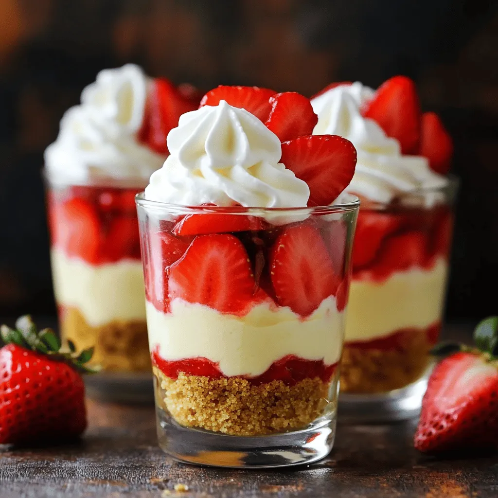 It’s time to layer the dessert. First, add the cream cheese filling on top of your crust in each cup. Then, take one cup of diced fresh strawberries and mix them with two tablespoons of lemon juice. This helps the strawberries shine. Spoon a layer of strawberries over the cream cheese filling. Keep layering the cream cheese and strawberries until you reach the top of the cups. Finish with a dollop of whipped cream on top. Chill your cups in the fridge for at least two hours. This will help everything set nicely.