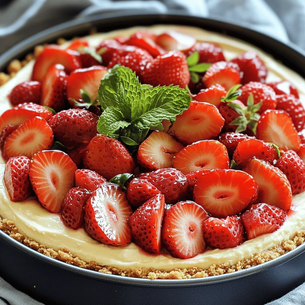 To make this delicious cheesecake, you need the following items: - 1 ½ cups digestive biscuits, crushed - ½ cup unsalted butter, melted - 2 cups cream cheese, softened - 1 cup powdered sugar - 1 teaspoon vanilla extract - 1 cup heavy cream - 1 ½ cups fresh strawberries, hulled and sliced - 1 tablespoon lemon juice - Fresh mint leaves for garnish These ingredients work together to create a rich and creamy cheesecake that melts in your mouth. The digestive biscuits form a sturdy crust, while the cream cheese provides a smooth filling. The strawberries add a burst of flavor, making every bite delightful. To customize your cheesecake further, consider these optional ingredients: - Chocolate shavings - Additional fruit toppings - Alternative sweeteners Adding chocolate shavings can give your cheesecake a fun twist. Extra fruit toppings can enhance the flavor and presentation. If you prefer a different sweetener, you can swap out the powdered sugar for a healthier option. For the complete recipe, check out the [Full Recipe]. To start, mix the crushed digestive biscuits and melted butter in a bowl. You want to stir until it feels like wet sand. This step is simple but key for a tasty base. Next, press the mixture firmly into the bottom of a 9-inch springform pan. Make sure it is even and compact. This will help the crust hold up when we add the filling. Place the pan in the refrigerator for 15 minutes to set. In a large bowl, beat the softened cream cheese using an electric mixer. Mix until it feels smooth and creamy. This makes the filling rich and delicious. Gradually add the powdered sugar and vanilla extract. Keep mixing until everything is well blended. This step adds sweetness and flavor to the cheesecake filling. Now, let’s whip the heavy cream. In another bowl, beat the cream until you see stiff peaks form. This means it will hold its shape well. Gently fold the whipped cream into the cream cheese mixture. Be careful not to deflate the whipped cream. You want a light and fluffy texture. Make sure no streaks remain in the mixture. Before we add the strawberries, toss them with the lemon juice in a bowl. This keeps their color bright and adds a nice zing. Pour half of the cheesecake filling into the crust. Layer half of the strawberries on top. Then, pour the rest of the filling over the strawberries. Finally, add the remaining sliced strawberries on top. Cover the cheesecake with plastic wrap and refrigerate it for at least 4 hours. For the best texture, let it chill overnight. When ready to serve, carefully remove the sides of the springform pan. Don’t forget to garnish with fresh mint leaves for a pop of color. Enjoy your No-Bake Strawberry Cheesecake! You can find the Full Recipe for all the details. To make your cheesecake smooth, chill it well. I recommend letting it sit in the fridge for at least 4 hours. If you can, overnight is best. This helps the cheesecake set up nicely. Always use cream cheese at room temperature. Cold cream cheese mixes poorly and can lead to lumps. For a beautiful finish, think about garnishing with fresh mint leaves. They add color and flavor. You can also slice some fresh strawberries to place on top. Serve your cheesecake on a nice plate to impress your guests. If your cheesecake is too runny, it may need more time in the fridge. Give it a few more hours to set. You can also blend in a bit more whipped cream for thickness. If your crust crumbles, try adding a bit more melted butter. This helps hold it together better. {{image_2}} You can easily switch up the flavors of your no-bake strawberry cheesecake. For a rich twist, try a chocolate version. Just add cocoa powder to the cream cheese mix. You can also use melted chocolate in place of some cream cheese. This adds a lovely depth to the dessert. If you need a nut-free option, skip any nuts in the crust or toppings. Use cookie crumbs instead, like graham crackers or digestive biscuits. This keeps it tasty and safe for those with allergies. There are ways to make this cheesecake fit different diets. For a gluten-free version, use gluten-free digestive biscuits. Many brands offer great options that taste just as good. If you're vegan, swap cream cheese with a plant-based alternative. Use coconut cream or silken tofu for a creamy texture. Replace heavy cream with coconut milk for the perfect consistency. While strawberries shine in this recipe, you can change things up with other fruits. Raspberries and blueberries work great too. They add color and a tart flavor that balances the sweet cheesecake. Seasonal fruits like peaches or cherries also make fantastic toppings. You can mix and match to keep it fresh and exciting. Each fruit brings its own unique taste, making every cheesecake special. To keep your no-bake strawberry cheesecake fresh, cover it tightly with plastic wrap. This prevents the cheesecake from absorbing any odors from the fridge. The cheesecake stays tasty for up to five days in the fridge. After five days, it may lose its best flavor and texture. Always check for any signs of spoilage before enjoying leftovers. You can freeze this cheesecake for a longer shelf life. First, let it chill completely in the fridge. Then, wrap it in plastic wrap and place it in an airtight container. It can last for up to three months in the freezer. When you’re ready to serve, take it out and thaw it in the fridge for about six hours. For quick thawing, you can leave it at room temperature for about an hour. Remember to garnish it after thawing for a fresh look. Enjoy your delicious creation! Check the Full Recipe for more details. Yes, you can use frozen strawberries. Just thaw them first. Pat them dry with a paper towel. This helps keep the cheesecake from getting too watery. Frozen berries can also taste great in your cheesecake. The cheesecake needs to chill for at least 4 hours. For the best results, chill it overnight. This helps the cheesecake set properly. A longer chill time makes the texture 