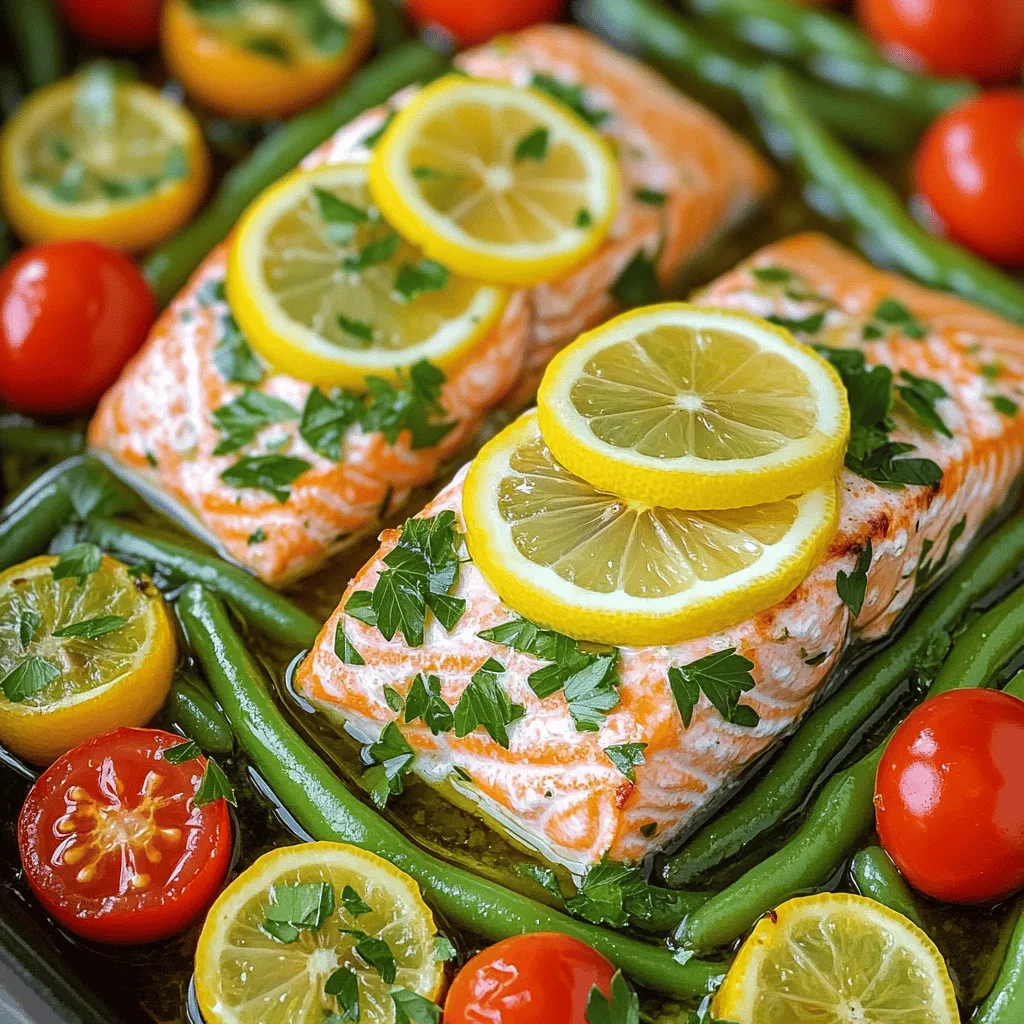 - 4 salmon fillets (about 6 oz each) - 1 lemon, thinly sliced - 1 cup cherry tomatoes, halved - 1 cup green beans, trimmed - 3 tablespoons olive oil - 1 teaspoon garlic powder - 1 teaspoon dried oregano - 1 teaspoon dried thyme - Salt and pepper to taste - Fresh parsley, chopped (for garnish) The key to this dish is the perfect blend of fresh ingredients. I love using salmon because it cooks quickly and tastes amazing. For this recipe, we need four salmon fillets. Each should weigh about six ounces. Next, grab one lemon. Slice it thin. This will add a bright and zesty flavor. You’ll also need cherry tomatoes. Halve one cup of them for a sweet burst. Green beans are next. Trim one cup for a nice crunch. Now, let’s talk about the seasoning and marinade. Use three tablespoons of olive oil to keep things moist. Add one teaspoon of garlic powder for depth. A teaspoon of dried oregano and a teaspoon of dried thyme will bring out those herb flavors. Don’t forget to add salt and pepper to taste. Lastly, fresh parsley is for garnish. It adds a pop of color and freshness when you serve the dish. This recipe is all about balance and flavor. By using fresh and simple ingredients, you can create a meal that feels special yet is quick and easy. For the full recipe, check out the link provided. - Preheat the oven to 400°F (200°C). - Prepare the baking sheet with parchment paper. This helps the food not stick. - Arrange salmon, cherry tomatoes, and green beans on the baking sheet. Place the salmon in the center. - Drizzle with the olive oil mixture. Make sure everything gets a good coat. - Top the salmon with lemon slices. This adds a fresh taste. - Roast in the oven for 15-20 minutes until done. The salmon should flake easily with a fork. The vegetables should be tender. For the full recipe, check out the One-Pan Lemon Herb Salmon. Enjoy this easy meal! To know when your salmon is ready, use a fork. Gently flake the fish at its thickest part. If it flakes easily, it is done. If you have thicker fillets, you may need to adjust your cooking time. Thicker pieces will need a few extra minutes in the oven. For a richer taste, marinate the salmon before cooking. Mix olive oil, garlic, and herbs, and let the fish sit for 30 minutes. This adds depth to the flavor. You can also try adding other herbs or spices. Fresh dill or a pinch of paprika can change the game. This dish pairs well with many sides. Try serving it with rice or quinoa for a filling meal. A side salad adds freshness and crunch to your plate. You can also add roasted potatoes for a hearty option. {{image_2}} If you want to mix it up, try using chicken breasts instead of salmon. Chicken cooks well and takes on the lemon and herb flavors nicely. For a vegetarian option, use tofu. Tofu soaks up the marinade and gives you a tasty meal. Switch out the vegetables based on what is in season. For example, use zucchini in the summer or squash in the fall. You can also try different citrus fruits. Lime and orange can add a unique twist to the dish. To kick up the heat, add sriracha or chili flakes. This will give your meal a spicy kick. If you want a fresher taste, use fresh herbs instead of dried ones. Fresh basil or cilantro can brighten up your dish. For the full recipe, check out the One-Pan Lemon Herb Salmon. Refrigerate leftover salmon in an airtight container. This keeps the fish fresh and safe to eat. Salmon will last in the fridge for up to three days. Make sure it cools down before sealing it. You don’t want to trap steam inside, which can make it soggy. To freeze cooked salmon, wrap each piece tightly in plastic wrap. Then place the wrapped salmon in a freezer bag. Remove as much air as you can. This helps prevent freezer burn. Cooked salmon can be frozen for up to three months. When you’re ready to enjoy it, simply thaw it in the fridge overnight. For reheating, preheat your oven to 350°F (175°C). Place the salmon on a baking sheet and cover it with foil. This keeps it from drying out. Heat for about 10-15 minutes. You can also use a microwave, but be careful. Microwave it in short bursts at medium power. This will help keep the texture and flavor intact. Enjoy your meal again without losing its freshness! You can tell when salmon is done by checking its color. Perfectly cooked salmon looks opaque and slightly pink in the center. It should flake easily with a fork. If you have a food thermometer, the internal temperature should reach 145°F (63°C). Keep an eye on the salmon, as it cooks quickly. Yes, you can use frozen salmon for this dish. Just make sure to thaw it first. You can do this by placing the salmon in the fridge overnight or using cold water for a faster method. Pat it dry before cooking to remove excess moisture. You can add many vegetables to make this dish your own. Some great options include: - Zucchini, sliced - Bell peppers, chopped - Asparagus, trimmed - Broccoli florets These veggies will cook nicely alongside the salmon and add more flavor. Yes, you can prep this dish in advance. You can marinate the salmon and chop the veggies a few hours before cooking. Store them in the fridge until you are ready to bake. This makes it easy to enjoy a quick meal later. Just remember to cook it fresh for the best taste. For the full recipe, check out my detailed guide. This blog post shows how to make a tasty salmon dish. I covered the main ingredients, including fresh salmon, veggies, and spices. Following simple steps, you can bake it to perfection. Remember to check for doneness and try different flavors. You can even swap proteins or add seasonal veggies. Store leftovers properly to enjoy later. With these tips, you'll impress everyone at your table. Cooking can be fun and easy! Start today and enjoy your meal!
