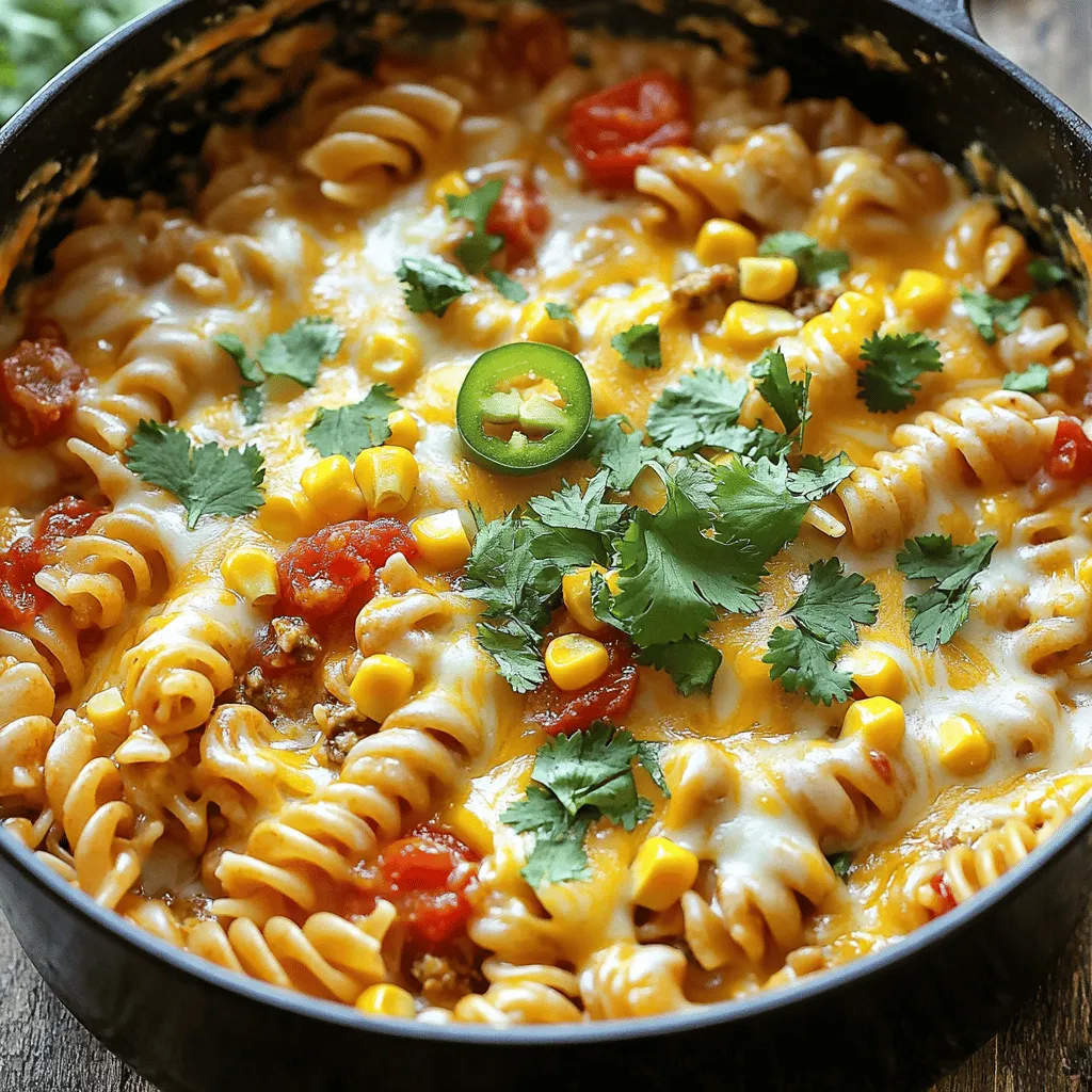 To make One-Pot Cheesy Taco Pasta extra tasty, use fresh spices. Add a bit more taco seasoning for a bolder taste. You can also mix in some lime juice for a zesty kick. Fresh cilantro adds great flavor, too. If you love heat, try adding chopped jalapeños while cooking. This gives the dish a nice spicy touch.