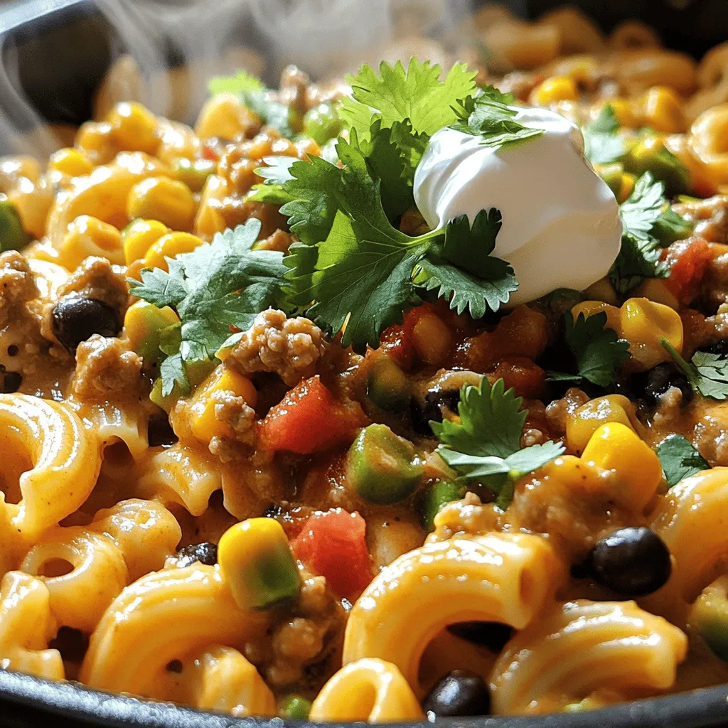 Once the pasta is cooked and tender, take the pot off the heat. Stir in one cup of shredded cheddar cheese until it melts. This will make your dish creamy and delicious! Season with salt and pepper to taste. Serve this hot, and if you like, garnish with fresh cilantro. A dollop of sour cream or Greek yogurt on top makes it even better.Enjoy your One Pot Taco Pasta!