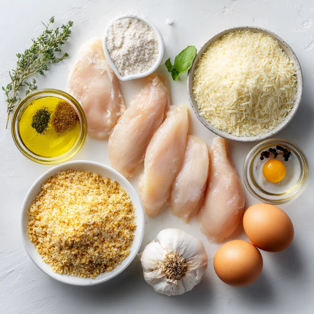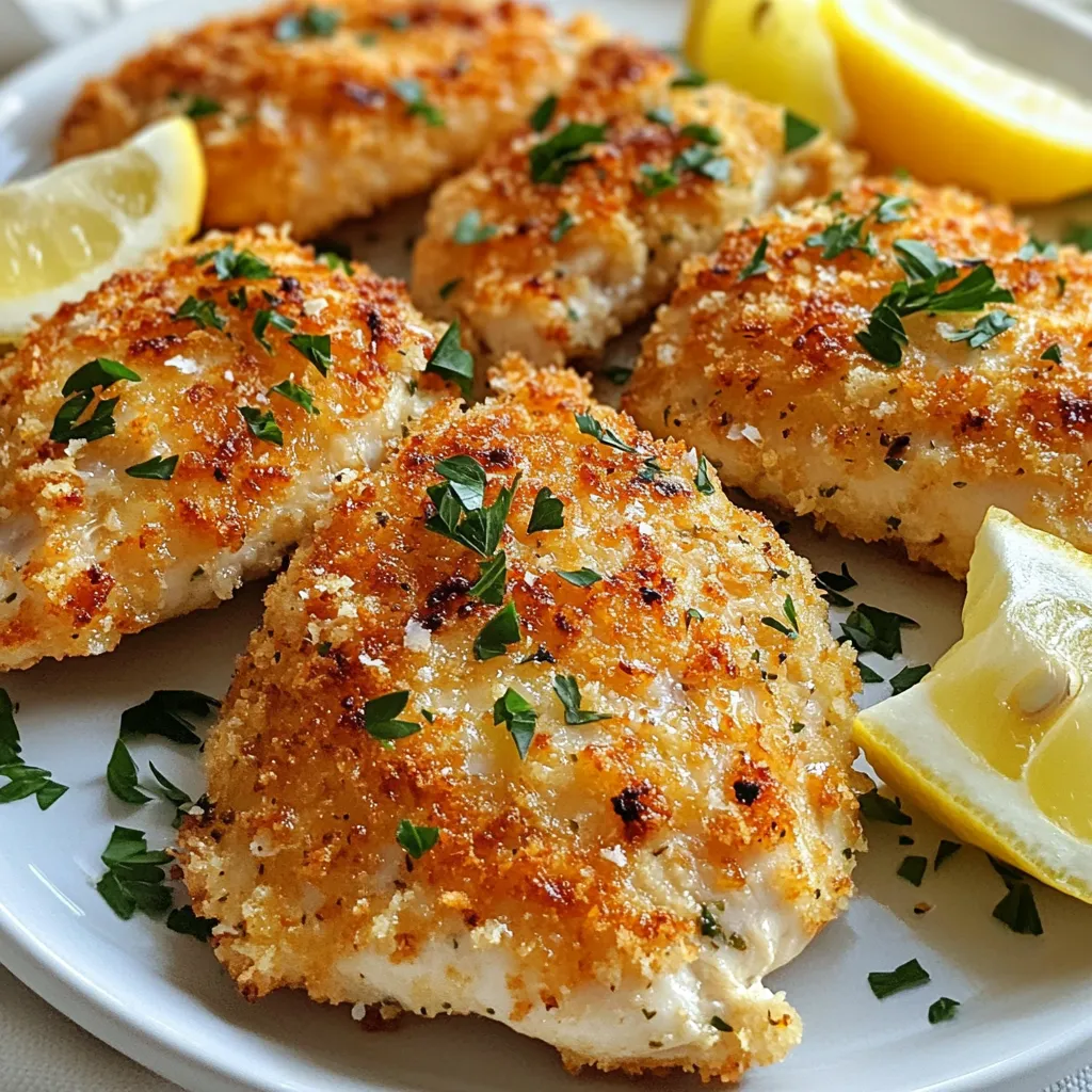 - 4 boneless, skinless chicken breasts - 1 cup grated Parmesan cheese - 1 cup breadcrumbs (preferably panko for extra crunch) - 2 cloves garlic, minced - 1 teaspoon dried oregano - 1 teaspoon dried basil - 2 large eggs - 1 tablespoon Dijon mustard - Salt and black pepper to taste - 1/4 cup flour (for dredging) - Olive oil for drizzling - Preheat your oven to 400°F (200°C). - You will need a few bowls, a baking sheet, and parchment paper. - If you don’t have Parmesan cheese, you can use Pecorino Romano or Grana Padano. - Choose panko breadcrumbs for a crunchier finish. Regular breadcrumbs work too, but panko gives better texture. {{ingredient_image_1}} Start by preheating your oven to 400°F (200°C). This heat is key for a golden crust. Next, line a baking sheet with parchment paper. This helps the chicken not stick. Take your boneless chicken breasts and season them. Place the flour in a shallow bowl. Sprinkle a little salt and pepper on the flour. Now, take each chicken breast and coat it in the flour. Shake off any extra flour. In a separate bowl, mix the grated Parmesan cheese and breadcrumbs. Use panko if you want a crunchier bite. Add the minced garlic, oregano, basil, salt, and pepper. Mix well until combined. Now, create the egg wash. In another bowl, whisk together the eggs and Dijon mustard until smooth. This mixture helps the crumbs stick to the chicken. Take the floured chicken and dip it into the egg wash. Make sure it covers the chicken evenly. Next, press the chicken into the breadcrumb-Parmesan mixture. Coat both sides well for maximum flavor. Place the coated chicken breasts on your prepared baking sheet. Drizzle a little olive oil on top of each piece. This will add extra crunch when it bakes. Now, it’s time to bake! Place the baking sheet in your preheated oven. Bake for 25-30 minutes. Keep an eye on the chicken; it should turn golden brown. To ensure it’s done, check the internal temperature. It should reach 165°F (75°C). Once done, take the chicken out and let it rest for 5 minutes before serving. Enjoy your delicious, crispy Parmesan crusted chicken! To get that crispy crust, use panko breadcrumbs. They are lighter and crunchier than regular breadcrumbs. This helps your chicken stay crisp when baked. You can add herbs and spices to the breadcrumb mix. Dried oregano and basil give a nice flavor boost. Garlic adds a tasty kick, too. After baking, let the chicken rest for five minutes. This helps keep it juicy inside. For a great look, serve the chicken on a nice platter. Sprinkle fresh parsley on top for color. Add lemon wedges on the side for a zesty touch. To store leftovers, place them in an airtight container. Keep them in the fridge for up to three days. When reheating, use the oven if you can. This keeps the crust crispy. Just heat at 350°F (175°C) for about 10-15 minutes. Enjoy your meal even on the second day! Pro Tips Use Fresh Herbs: Fresh herbs can elevate the flavor profile of your chicken. Consider adding chopped fresh basil or oregano to the breadcrumb mixture for a burst of freshness. Let Chicken Rest: Allow the chicken to rest for a few minutes after baking. This helps the juices redistribute, ensuring your chicken remains moist and tender. Experiment with Cheeses: While Parmesan is classic, you can mix in other cheeses like Pecorino Romano or a little Mozzarella for added flavor and gooeyness. Customize the Crunch: For an extra crunch, try adding some crushed nuts like almonds or walnuts to the breadcrumb mixture. This adds a delightful texture and nutty flavor. {{image_2}} You can change the taste of Parmesan crusted chicken by adding herbs or cheese. Try mixing in fresh parsley or thyme. This gives the dish a bright flavor. You can also use different cheeses like Asiago or Pecorino. These options add a unique twist to the classic recipe. For those who like heat, consider a spicy Parmesan chicken. Add crushed red pepper flakes to the breadcrumb mixture. This small change makes a big difference. You can also use spicy cheese like pepper jack. This will surely satisfy your taste buds. If you need gluten-free options, use ground almonds instead of breadcrumbs. Almond flour works well and keeps the chicken crispy. You can also try ground oats. Just blend them until fine for a great substitute. For a low-carb option, almond flour is a winner. It has fewer carbs and gives a nice texture. You can mix it with Parmesan cheese for extra flavor. These changes help you enjoy this dish while sticking to your diet. Pair your Parmesan crusted chicken with tasty side dishes. Roasted vegetables or a fresh salad are great choices. You can also serve it with mashed potatoes or rice for a hearty meal. To elevate the dish, try creative sauces. A lemon butter sauce adds a rich flavor. You can also use marinara or a garlic aioli. These sauces bring extra zest and keep the meal exciting. To store leftovers, place them in an airtight container. This keeps the chicken fresh. You can also wrap it tightly in plastic wrap. Leftovers stay good in the fridge for up to three days. Make sure to cool the chicken before storing. This helps prevent moisture build-up. To freeze, wrap each piece of chicken in plastic wrap. Then, place them in a freezer-safe bag or container. Squeeze out as much air as possible to avoid freezer burn. You can freeze Parmesan crusted chicken for up to two months. To thaw, move the chicken to the fridge overnight. This keeps it safe and tasty. For reheating, I suggest using the oven. Preheat it to 375°F (190°C). Place the chicken on a baking sheet and cover it with foil. Heat for about 15-20 minutes. To keep the crispiness, remove the foil for the last 5 minutes. You can also use a skillet. Heat a little oil over medium heat and warm the chicken until it’s hot. Enjoy your meal just like the first time! If you’re avoiding gluten or carbs, you have great options. Here are some substitutes: - Almond flour: This adds a nutty flavor and is glute