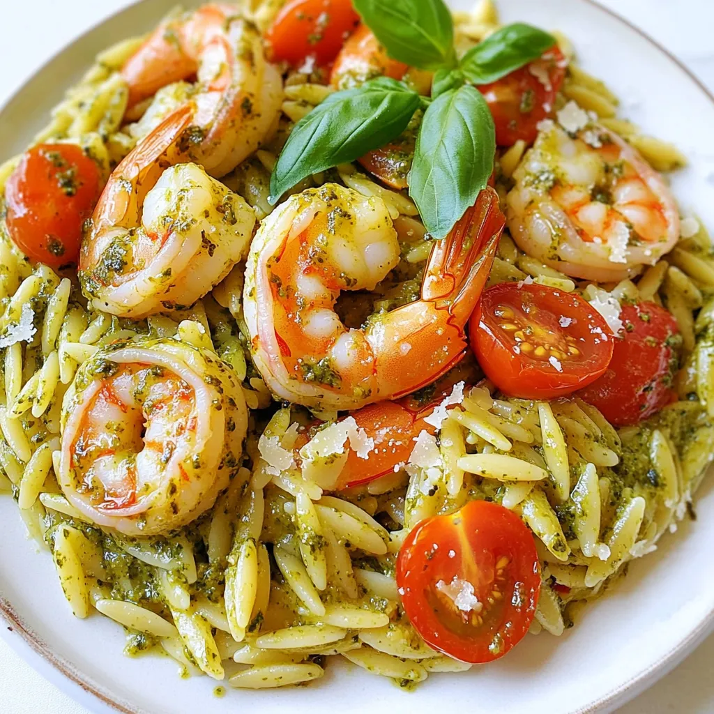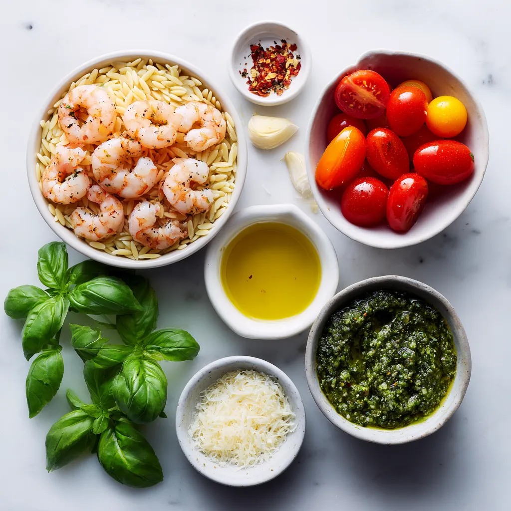 Each ingredient plays a key role. The orzo gives a nice chewy texture. Shrimp adds protein and flavor. Basil pesto brings a fresh taste. Cherry tomatoes add sweetness. Garlic gives a warm aroma. Olive oil keeps everything moist. Red pepper flakes add a hint of heat. Salt and pepper enhance all the flavors. Parmesan cheese can make it creamy. Fresh basil leaves are perfect for a bright finish.