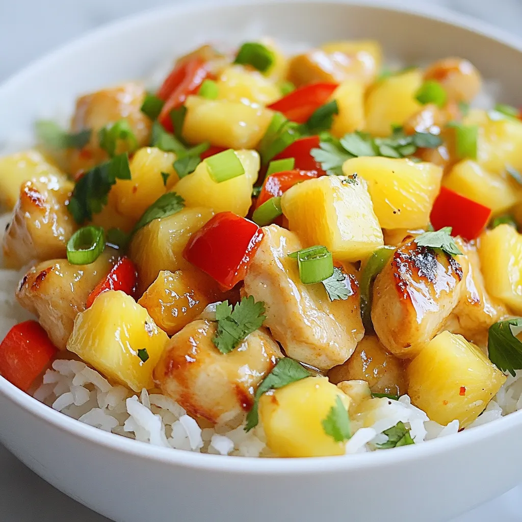 A tropical dish featuring chicken, pineapple, and colorful bell peppers served over jasmine rice.