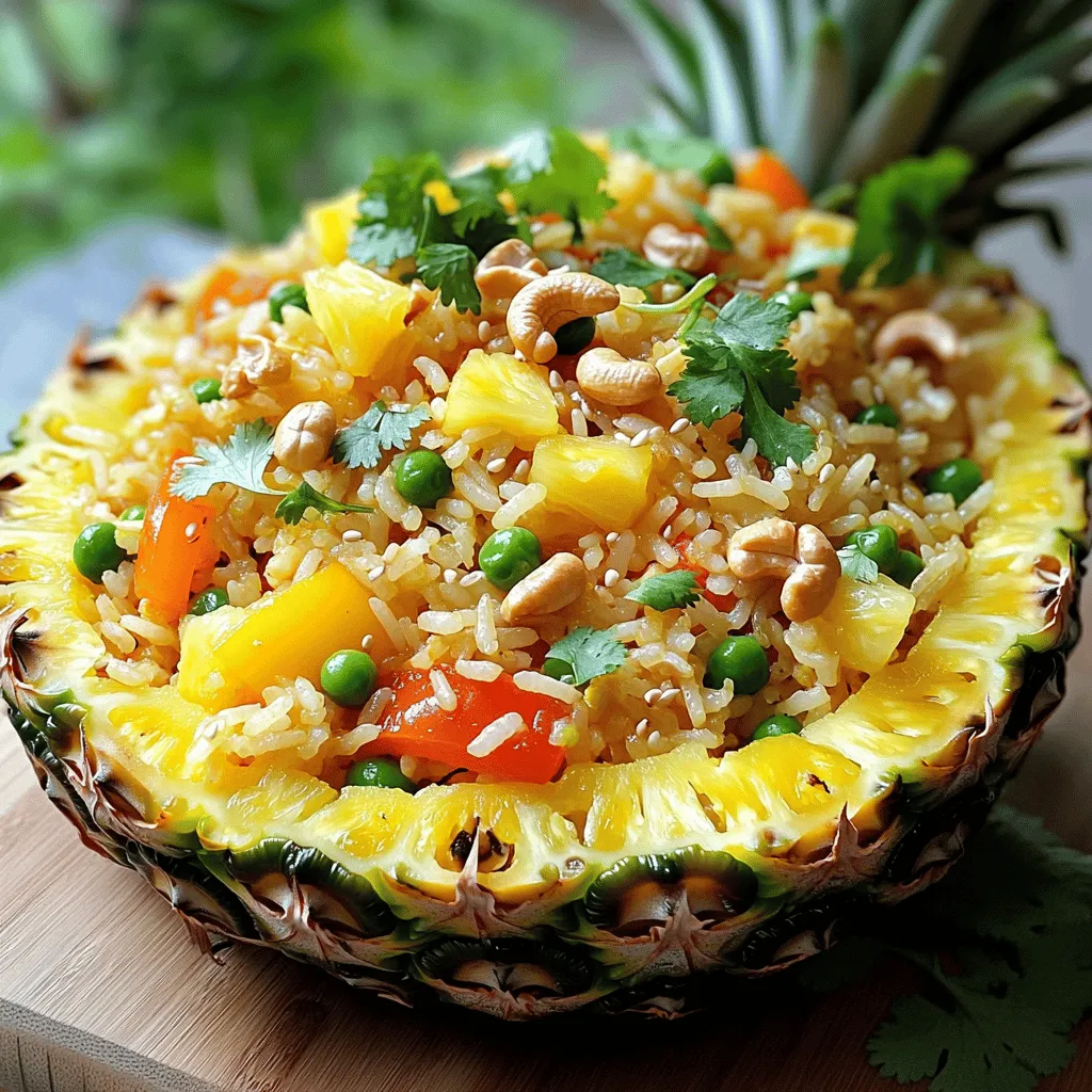 When making pineapple fried rice, the right mix of ingredients makes all the difference. Here’s what you need to gather: - 2 cups cooked jasmine rice (preferably chilled) - 1 ripe pineapple, diced (reserve some for garnish) - 1 cup mixed bell peppers (red, yellow, green), chopped - 1 cup frozen peas - 3 green onions, chopped (white and green parts separated) - 2 cloves garlic, minced - 2 tablespoons soy sauce - 1 teaspoon sesame oil - 1 teaspoon curry powder - Salt and pepper to taste - 2 tablespoons vegetable oil - 1/4 cup cashews or peanuts (optional) - Fresh cilantro for garnish Each ingredient plays a key role. The fragrant jasmine rice is light and fluffy, perfect for fried rice. The pineapple adds a sweet and tangy taste, balancing the savory flavors. Using chilled rice is important. It helps prevent clumping and ensures even cooking. Fresh bell peppers bring color and crunch, while peas add a hint of sweetness. Garlic gives depth to the dish, and the green onions add a fresh bite. Soy sauce and sesame oil provide umami and richness. Curry powder introduces warmth and spice. Salt and pepper enhance all the flavors. Finally, cashews or peanuts offer a nice crunch, and cilantro adds a burst of freshness. For a detailed guide on making this dish, refer to the Full Recipe. Using chilled jasmine rice makes a big difference. Chilled rice prevents clumping and helps achieve a fluffy texture. If you use fresh-cooked rice, it will be sticky. Let your rice cool completely before using it. Spread it on a baking sheet for quick cooling. Prepping your ingredients ahead of time is key. Chop all veggies and pineapple before cooking. This makes cooking faster and more fun. Having everything ready lets you focus on stir-frying without rushing. 1. Heat 1 tablespoon of vegetable oil in a large wok or frying pan over medium-high heat. 2. Add minced garlic and the white parts of the green onions. Stir-fry for about 30 seconds until fragrant. 3. Toss in the mixed bell peppers and frozen peas. Cook for about 2-3 minutes until they soften. 4. Push the veggies to one side of the pan. Add another tablespoon of vegetable oil. 5. Add the chilled jasmine rice, breaking up any clumps as you go. 6. Pour in soy sauce, sesame oil, and curry powder. Stir well to coat the rice evenly. 7. Mix in the diced pineapple and cook for another 2-3 minutes until heated through. 8. Season with salt and pepper. If you like, add cashews or peanuts and stir. 9. Remove from heat and garnish with the green parts of the green onions and fresh cilantro. Add reserved pineapple pieces on top for a nice touch. For best results, use a wok or a large frying pan. This allows for even heat and good stir-frying. Make sure you have a spatula to toss and mix everything well. Cooking time matters. Each step should take about 2-3 minutes, ensuring the veggies stay crisp. Stir-fry quickly to enhance flavor and keep things bright. High heat helps the dish cook evenly. Use a gentle folding motion to combine ingredients without breaking the rice. This method keeps the dish light and full of flavor. Enjoy your cooking adventure with this vibrant dish! To make the best pineapple fried rice, avoid common mistakes. One big mistake is using fresh rice. Always use chilled, cooked jasmine rice. Fresh rice clumps and becomes mushy. Another mistake is overcooking the veggies. Keep them crisp and colorful. Stir-fry them just until tender. This adds nice texture to your dish. For the best texture, stir-fry in small batches. This lets the heat spread evenly. It helps each grain of rice get a nice golden color. Present your dish in a fun way. Serve the rice in a hollowed-out pineapple half. This adds a tropical touch. It impresses your guests while keeping it playful. Pair your pineapple fried rice with fresh, cold drinks. Serve it with a light lemonade or coconut water. These drinks balance the dish's flavors perfectly. To make your fried rice pop, add spices. A bit of chili powder can bring heat. You can also try a splash of fish sauce for depth. Fresh herbs brighten your dish. Chopped cilantro adds a lovely aroma. You can also use fresh basil or mint for a twist. For a complete recipe, check the Full Recipe section to explore all the details! {{image_2}} You can easily make pineapple fried rice vegetarian or vegan. For protein, you can use tofu or tempeh. Tofu adds a nice texture, while tempeh gives a nutty flavor. Both options soak up the flavors well. Add more veggies to the mix! Consider mushrooms for umami, carrots for sweetness, or snap peas for crunch. These additions make your dish colorful and tasty. Different cultures have fun twists on pineapple fried rice. For a Thai-inspired version, add shrimp paste or fish sauce for depth. You can also include basil or cilantro for freshness. If you want a Caribbean vibe, try adding allspice or jerk seasoning. These spices bring warmth and a little heat, transforming your dish into a tropical getaway. If you follow a gluten-free diet, look for gluten-free soy sauce. Brands like Tamari work well and taste great. For those cutting carbs, swap jasmine rice for cauliflower rice. This change keeps the texture while lowering carbs. Plus, cauliflower absorbs flavors nicely, so your fried rice remains delicious. To keep your pineapple fried rice fresh, store leftovers in airtight containers. This keeps out air and moisture. Place the containers in the fridge right away. For longer storage, you can freeze the fried rice. Portion it into small containers for easy access. When you're ready to eat, there are two good options for reheating. You can use the microwave or the stovetop. The microwave is quick, but it may make the rice a bit soft. The stovetop is better for keeping the texture. Just add a splash of water and heat over low heat for about five minutes. Pineapple fried rice lasts about three to four days in the fridge. After that, it may spoil. Watch for signs of spoilage like off smells or unusual colors. If you 
