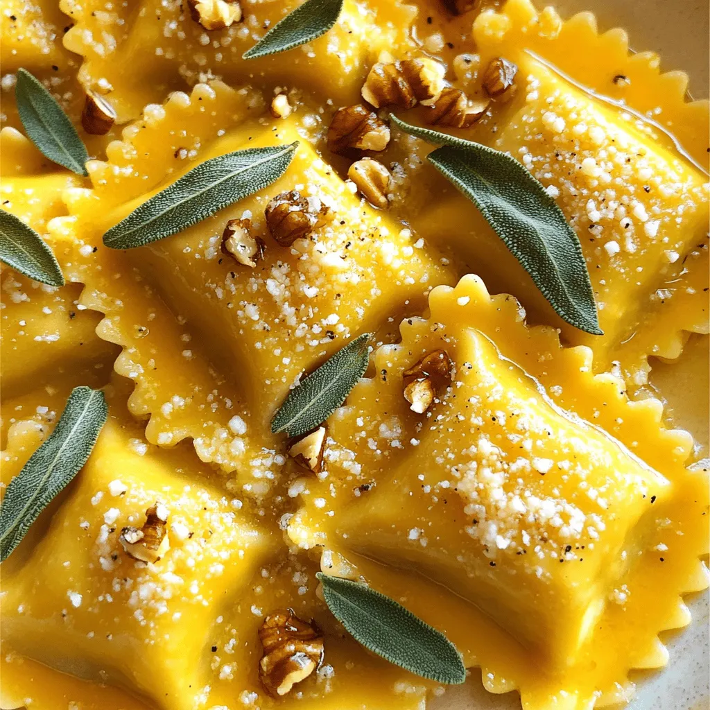 To create the perfect Pumpkin Sage Brown Butter Ravioli, you’ll start with a few key ingredients. The base of your dough is the flour. It gives the pasta its structure. Eggs help bind it, adding richness. The pumpkin puree brings a sweet, earthy flavor. Ricotta cheese adds creaminess, while Parmesan gives a nice salty kick. Seasonings like salt, nutmeg, and black pepper enhance the overall taste.