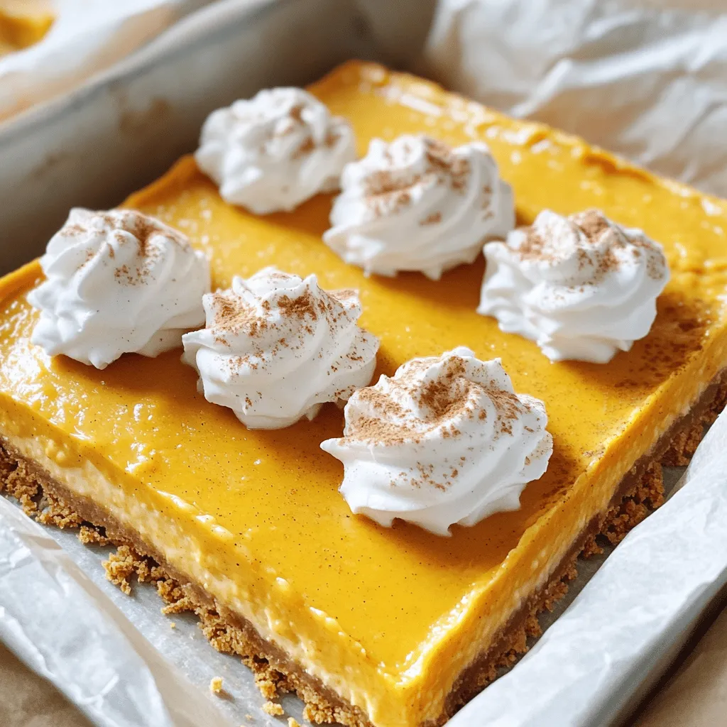 After baking, let your bars cool at room temperature. Chill them in the fridge for at least 2-3 hours. This helps them set well. When ready to serve, lift the bars using the parchment paper. Cut them into squares for easy serving. Top each square with whipped cream and a sprinkle of ground cinnamon. This adds flavor and makes them look festive!