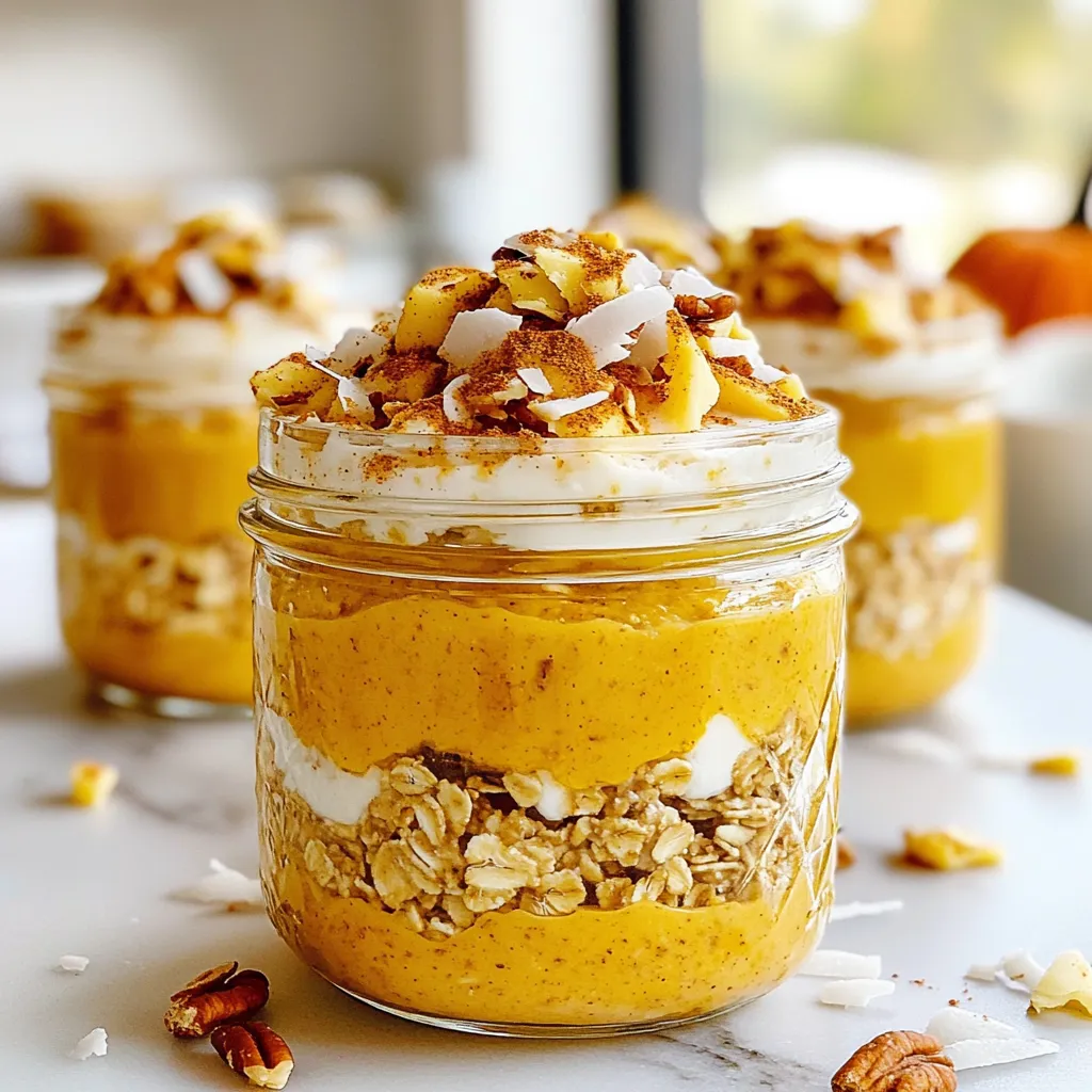 To make pumpkin spice overnight oats, you need a few key ingredients: - 1 cup rolled oats - 1 cup almond milk (or any milk of choice) - 1/2 cup canned pumpkin puree - 1 tablespoon chia seeds - 1 tablespoon maple syrup (or honey) - 1 teaspoon pumpkin pie spice - 1/2 teaspoon vanilla extract - A pinch of salt These ingredients blend together to create a creamy and flavorful base. Rolled oats soak up the milk and flavors overnight. Canned pumpkin adds a rich taste and color. Chia seeds help thicken the mix as they absorb liquid. You can enhance your oats with some tasty toppings: - Chopped nuts - Coconut flakes - Dried fruit These toppings add crunch and sweetness. You can mix and match based on your mood. Try walnuts for a nutty flavor or coconut for a tropical twist. If you have dietary needs, you can make simple swaps: - For gluten-free oats, ensure you use certified gluten-free rolled oats. - Use any milk alternative like oat milk or soy milk. - Replace maple syrup with agave syrup for a vegan option. These substitutions keep the oats delicious while meeting your needs. Feel free to get creative with flavors and textures! {{ingredient_image_1}} To start, gather your ingredients. You need: - 1 cup rolled oats - 1 cup almond milk (or any milk of choice) - 1/2 cup canned pumpkin puree - 1 tablespoon chia seeds - 1 tablespoon maple syrup (or honey) - 1 teaspoon pumpkin pie spice - 1/2 teaspoon vanilla extract - A pinch of salt In a medium bowl, mix the rolled oats and almond milk. Add the pumpkin puree, chia seeds, maple syrup, pumpkin pie spice, vanilla, and salt. Whisk the mixture well. Make sure there are no clumps of pumpkin puree. This step is key to a smooth texture. Now, take two jars or airtight containers. Divide the oat mixture evenly between them. This recipe makes two servings. Seal the containers tightly. Place them in the fridge for at least four hours, but overnight is best. This soaking time helps the oats absorb the flavors and thicken up. When morning comes, take the jars out of the fridge. Give the oats a good stir. If they seem too thick, add a splash of almond milk. This will make them creamier. Now, it’s time to add your toppings. Try chopped nuts, coconut flakes, or dried fruit for a tasty crunch. I love to serve them in clear jars. It shows off the pretty layers and colors. A sprinkle of pumpkin pie spice on top looks great too! To get the best oat texture, use rolled oats. They absorb the liquid well. Combine the oats with milk and pumpkin puree. Let them soak overnight. This gives oats time to soften and thicken. If you want creamier oats, add a bit more milk in the morning. Stir well before serving. To boost flavor, add more spices. Consider cinnamon or nutmeg. These spices add warmth and depth. You can also mix in nuts for crunch. Chopped walnuts or pecans work great. For sweetness, try more maple syrup or honey. This makes each bite delightful and rich. Prep your oats the night before. It only takes ten minutes. Mix all the ingredients in one bowl. Divide them into jars for easy storage. You can even double the recipe for more servings. This makes breakfast quick and easy. In the morning, just stir, top, and enjoy! Pro Tips Use Fresh Pumpkin: For an extra flavor boost, consider using fresh pumpkin instead of canned. Roast and puree your own pumpkin to enhance the taste. Experiment with Milk: Feel free to swap almond milk with any milk of your choice, like oat, coconut, or dairy milk, to match your dietary preferences. Make it Vegan: To keep it vegan, ensure you use maple syrup instead of honey and opt for plant-based milk. Customize Toppings: Get creative with toppings! Try adding seeds, nut butters, or even a dollop of yogurt for added texture and flavor. {{image_2}} If you want nut-free oats, swap almond milk for oat or coconut milk. You can also skip nuts in the toppings. Instead, try seeds like sunflower or pumpkin seeds. These add crunch without any nuts. To keep it vegan, use maple syrup instead of honey. All ingredients in this recipe are naturally gluten-free. Just ensure your oats are labeled gluten-free. You can enjoy this dish without worries about gluten. Want to change it up? Add different spices! Try cinnamon, nutmeg, or ginger. You can also mix in fruits like banana or apple. A spoonful of cocoa powder gives a chocolate twist. Get creative and enjoy new tastes! To keep your pumpkin spice overnight oats fresh, store them in airtight containers. I recommend using glass jars. They help keep the oats safe and easy to grab. Make sure to seal them tightly. This keeps out air and moisture, which can spoil your oats. Always place them in the fridge right after you make them. This keeps them cool and tasty. You can store these oats in the fridge for up to five days. After that, the texture may change. The oats might get too soft and mushy. If you see any signs of mold or off smells, it's best to toss them. Trust your senses—this ensures your meal is safe and yummy. If you prefer warm oats, you can heat them up. Transfer the oats to a microwave-safe bowl. Add a splash of almond milk to keep them creamy. Heat for about 30-60 seconds, then stir. If they seem too thick, add a bit more milk. This method helps maintain that perfect texture. Enjoy them warm, topped with your favorite nuts or dried fruit! Yes, you can use instant oats. They will soften faster. However, rolled oats have a better texture. They hold up well and offer a nice chewiness. Instant oats may become mushy. If you choose instant oats, reduce the soaking time. Check the texture after a few hours. Almond milk works great for this recipe. You can also use oat milk or soy milk. Both options add creaminess and flavor. If you prefer dairy, whole or skim milk works fine. Choose a milk you enjoy. This will make your oats even better. Adding seeds and nuts boosts nutrition. Try adding flaxseeds or walnuts for healthy fats. You can also mix in a scoop of protein powder. Chia seeds add fiber and ome