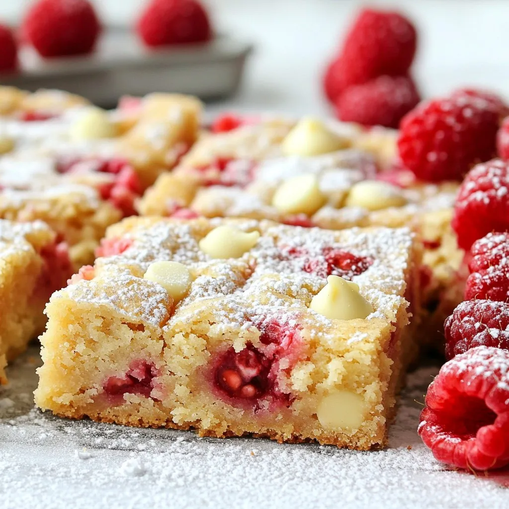 To make Raspberry White Chocolate Blondies, you need a few key ingredients: - 1 cup unsalted butter, melted - 1 ½ cups brown sugar, packed - 2 large eggs - 2 teaspoons vanilla extract - 2 cups all-purpose flour - ½ teaspoon baking powder - ¼ teaspoon salt - 1 cup white chocolate chips - 1 cup fresh raspberries Each ingredient plays a vital role in the recipe. The butter gives the blondies a rich flavor and soft texture. Brown sugar adds moisture and a hint of caramel taste. Eggs help bind the mixture, making it rise and hold its shape. Vanilla extract enhances the sweetness and overall flavor. All-purpose flour gives structure, while baking powder adds lightness. Salt balances the sweetness. Finally, white chocolate chips and fresh raspberries bring bursts of flavor, adding sweetness and tartness. If you want to adjust for dietary needs, you can make some easy swaps. Instead of unsalted butter, try coconut oil for a dairy-free option. For eggs, use flaxseed meal or applesauce as a binder. If you need a gluten-free version, use almond flour or a gluten-free flour blend instead. For the white chocolate, you can use a different type like dark chocolate or even a dairy-free version. This can change the taste but keeps it delicious. Choosing quality ingredients matters in baking. For white chocolate, I love using brands like Ghirardelli or Guittard. They melt well and taste great. For butter, I recommend Kerrygold for its rich flavor. Using good ingredients helps make sure your blondies are tasty and satisfying. {{ingredient_image_1}} To start, you need to prepare your baking pan. I always use a 9x9-inch pan for this recipe. Grease it with butter or cooking spray. You can also line it with parchment paper for easier removal. If using parchment, let it hang over the edges. This makes lifting out the blondies simple. Next, let's mix the batter. In a big bowl, whisk the melted butter and brown sugar together. Make sure they blend well and look smooth. Then, add the eggs one by one. Mix well after each egg goes in. Now stir in the vanilla extract. In another bowl, combine the flour, baking powder, and salt. Add the dry mix to the wet mix slowly. Stir until just combined. Avoid over-mixing; we want a smooth batter. Finally, fold in the white chocolate chips and fresh raspberries gently. Be careful not to break the raspberries too much. Now it’s time to bake. Preheat your oven to 350°F (175°C). Pour the batter into your prepared pan and spread it evenly. Bake for 25 to 30 minutes. You want the edges to look golden. To check for doneness, insert a toothpick into the center. If it comes out with a few moist crumbs, your blondies are ready! Let them cool in the pan for at least 15 minutes before removing. Cut them into squares, and enjoy your tasty treat! To get the best texture in your blondies, avoid over-mixing the batter. Mix just until the ingredients blend. Over-mixing can make them tough. When you add fresh raspberries, fold them in gently. This keeps them whole and juicy. If you mash them too much, they can turn the batter pink. You can enhance the flavor in many ways. Try adding nuts like walnuts or pecans for crunch. A pinch of cinnamon can also add warmth. Feel free to mix in other fruits with raspberries. Blueberries or strawberries pair well and add fun colors. For a beautiful finish, serve your blondies dusted with powdered sugar. This adds a sweet touch and looks great. You can also add more fresh fruits on the side. A few raspberries or even slices of strawberries make a nice presentation. Pro Tips Use Room Temperature Eggs: Allow your eggs to sit at room temperature for about 30 minutes before using them. This helps to create a smoother batter and promotes even baking. Don’t Overmix: When combining the dry ingredients with the wet, stir until just combined. Overmixing can lead to tough blondies instead of the desired fudgy texture. Fresh Raspberries Are Best: Use fresh raspberries for the best flavor and texture. If using frozen, do not thaw them before adding to the batter to prevent excess moisture. Cool Before Cutting: Allow the blondies to cool completely in the pan before cutting. This helps them set up properly and makes for cleaner slices. {{image_2}} To make gluten-free Raspberry White Chocolate Blondies, swap the all-purpose flour for gluten-free flour. Use a blend that contains xanthan gum for the best texture. Brands like Bob's Red Mill or King Arthur Flour work well. These will help keep the blondies soft and chewy without gluten. For a vegan version, replace eggs with flax eggs. To make one flax egg, mix one tablespoon of ground flaxseed with three tablespoons of water. Let it sit for five minutes to thicken. Use coconut oil instead of butter to keep it dairy-free. This will give your blondies a nice richness. You can have fun with the chocolate too. Try using dark or milk chocolate chips instead of white chocolate. This change will give a deeper flavor. Adding citrus zest, like lemon or orange, can brighten the taste. Just a teaspoon will add a fresh twist to the blondies. To keep your blondies fresh at room temperature, place them in an airtight container. This helps prevent them from getting dry. You can also cover them tightly with plastic wrap. Make sure to store them in a cool, dry place away from direct sunlight. If you want to save blondies for later, freezing is a great option. First, let them cool completely. Then, wrap each square in plastic wrap. Place the wrapped squares in a freezer bag or container. When you're ready to enjoy one, take it out and let it thaw at room temperature. To keep them moist, you can also warm them slightly in the oven. When stored properly, blondies stay fresh for about a week at room temperature. In the fridge, they last for up to ten days. If frozen, they can be kept for about three months. Watch for signs of spoilage like a change in smell or texture. If they look dry or hard, it’s best to toss them out. Yes, you can us