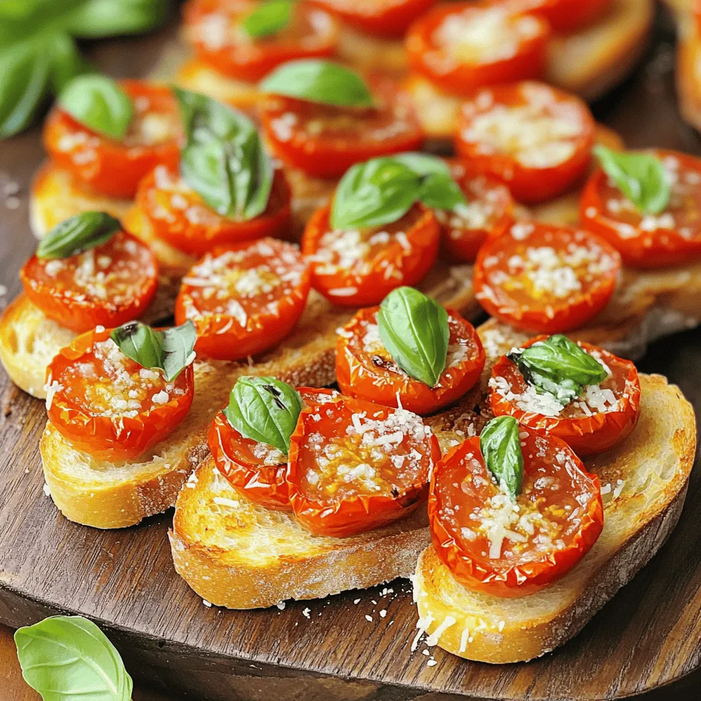 Once the tomatoes are done, I take them out and let them cool a little. In a bowl, I mix the roasted tomatoes with 1 minced garlic clove and 1 cup of chopped fresh basil. I stir gently to combine everything. Next, I spoon this tasty mixture onto each toasted baguette slice. For extra flavor, I sometimes sprinkle grated Parmesan cheese on top. This step adds a nice touch to each bite.