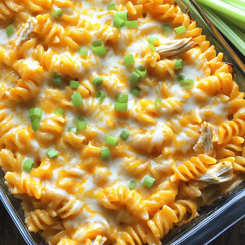 ![For the perfect Buffalo Chicken Pasta Bake, you need a few key items: - 2 cups rotini pasta - 2 cups cooked chicken, shredded - 1 cup buffalo sauce (adjust to taste) - 1 cup cream cheese, softened - 1 cup shredded cheddar cheese - 1 cup shredded mozzarella cheese - 1/2 cup sour cream - 1/2 cup chopped green onions - 1 teaspoon garlic powder - Salt and pepper to taste - Optional: Celery sticks and ranch dressing for serving Using rotini pasta works best because it holds sauce well. Cook it al dente so it stays firm in the bake. Shredded chicken adds great texture and flavor. I love using rotisserie chicken for ease. Cream cheese makes the dish creamy and rich. Adjust the buffalo sauce to match your spice level. If you want it milder, use less sauce. Chopped green onions not only add flavor but also a fresh crunch. For the cheeses, a mix of cheddar and mozzarella gives a nice flavor blend. The mozzarella melts beautifully, while cheddar adds sharpness. You can try other pasta shapes, like penne or fusilli. If you want a dairy-free option, use vegan cream cheese and cheese. For a spicier kick, add jalapeños or extra buffalo sauce. You can also swap the chicken for shredded turkey or cooked sausage. Each choice brings a new twist to your dish! For a lighter version, use Greek yogurt instead of sour cream. For the full recipe, check out the details above! To make Buffalo Chicken Pasta Bake, first, gather your ingredients. You will need rotini pasta, cooked chicken, buffalo sauce, cream cheese, cheddar cheese, mozzarella cheese, sour cream, green onions, garlic powder, salt, and pepper. This dish is simple and quick, taking about 50 minutes from start to finish. 1. Preheat your oven to 350°F (175°C). This step is key for even baking. 2. Cook the rotini pasta as per the package instructions. Make sure it is al dente. Drain the pasta and set it aside. 3. In a large mixing bowl, add your shredded chicken. Pour in the buffalo sauce and softened cream cheese. 4. Add the sour cream, garlic powder, green onions, salt, and pepper. Mix everything well until it is smooth and creamy. 5. Gently fold in the cooked pasta. Ensure the pasta is coated nicely with the buffalo chicken mix. 1. Transfer the chicken and pasta mix to a greased 9x13 inch baking dish. Spread it out evenly. 2. Sprinkle the shredded cheddar and mozzarella cheese on top. This will create a nice, gooey layer. 3. Bake in the preheated oven for 25-30 minutes. Look for melted, bubbly cheese as a sign it’s done. 4. Once baked, remove the dish from the oven. Let it cool for a few minutes before serving. For a great presentation, sprinkle more green onions on top and serve with celery sticks. You can add ranch dressing for extra flavor. Enjoy your tasty Buffalo Chicken Pasta Bake! For the full recipe, check above. To boost flavor, I recommend using fresh ingredients. Fresh green onions and chicken add a lot. You can also adjust the buffalo sauce to match your taste. If you like it spicy, add more sauce. Mixing cream cheese well helps it blend smoothly. Always taste as you go. This way, you can find the right balance. One common mistake is overcooking the pasta. Cook it until it's just al dente. This keeps the pasta from getting mushy in the bake. Another mistake is not mixing the ingredients enough. You want all flavors to combine well. Lastly, don’t skip the cheese topping. It becomes golden and bubbly, making the dish even better. When serving, sprinkle some chopped green onions on top. This adds color and a fresh taste. I like to serve it with celery sticks on the side. They give a nice crunch. A drizzle of ranch dressing is a great touch too. If you want, you can pair it with a simple salad. This helps balance the rich flavors. For the full recipe, check out the earlier section. {{image_2}} You can easily modify this dish to fit your diet. For a gluten-free option, use gluten-free pasta. Many brands offer great choices that taste good. If you want it dairy-free, substitute the cream cheese and cheese with plant-based options. There are nice vegan cream cheeses and shreds available. Check labels to ensure they're dairy-free. If you love heat, add more buffalo sauce. You can also mix in some diced jalapeños for extra spice. For a richer taste, try adding more cheese. Extra cheddar or pepper jack gives it a nice kick. You can even experiment with different cheese blends to find your favorite mix. Pair this bake with fresh veggies or a salad. Celery sticks are great for crunch and can cool the spice. A side of ranch dressing makes it even better. You can also serve it with garlic bread for a hearty meal. Feel free to explore different side dishes that fit your taste. For the full Buffalo Chicken Pasta Bake recipe, check the [Full Recipe]. Once you finish your meal, let the Buffalo Chicken Pasta Bake cool down. After it cools, transfer the leftovers to an airtight container. Make sure to cover it well. This will keep it fresh. You can store it in the fridge for up to three days. If you want to enjoy it later, freezing is a great option. To freeze your Buffalo Chicken Pasta Bake, first, let it cool completely. Then, place it in a freezer-safe container. You can also use a freezer bag. Just remove as much air as you can. Label the container with the date. It will stay fresh in the freezer for up to three months. When you’re ready to eat it, thaw it in the fridge overnight before reheating. Reheating is easy! Preheat your oven to 350°F (175°C). Place the pasta bake in an oven-safe dish. Cover it with foil to keep the moisture in. Heat it for about 20-25 minutes or until it's warm throughout. You can also reheat in the microwave. Just cover it with a microwave-safe lid and heat in short bursts until hot. Enjoy your meal without losing any flavor! To make Buffalo Chicken Pasta Bake from scratch, you start by cooking rotini pasta. You cook it until it is al dente and then drain it. In a big bowl, mix shredded chicken with buffalo sauce, 