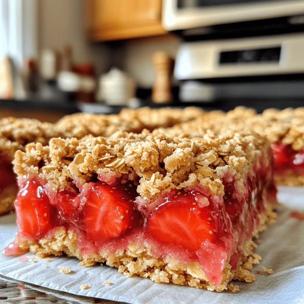 ![- 2 cups fresh strawberries, hulled and sliced - 1/4 cup sugar - 1 tablespoon lemon juice - 1 teaspoon cornstarch - 1 cup rolled oats - 1 cup all-purpose flour - 1/2 cup brown sugar, packed - 1/2 teaspoon baking powder - 1/4 teaspoon salt - 1/3 cup unsalted butter, melted - 1/2 teaspoon vanilla extract - Nuts or seeds for added crunch - Other berries (blueberries, raspberries) The strawberry oatmeal crumble bars pack about 150 calories per serving. They contain around 22 grams of carbs, 7 grams of fats, and 2 grams of proteins. This makes them a delightful treat that balances taste and nutrition well. The fresh strawberries add vitamins and fiber, while oats provide energy. You can adjust the sugar based on the sweetness of your strawberries. For a fun twist, try adding nuts or seeds for crunch. Alternatively, feel free to mix in other berries for a fruity burst. Check the [Full Recipe] for detailed steps on how to create these tasty bars! - Preheat oven to 350°F (175°C). - Grease or line a 9x9 inch baking dish. - Combine 2 cups of sliced strawberries, 1/4 cup of sugar, 1 tablespoon of lemon juice, and 1 teaspoon of cornstarch in a bowl. - Toss gently until the strawberries are coated. Let it sit while preparing the crumble. - In a large bowl, mix 1 cup of rolled oats, 1 cup of all-purpose flour, 1/2 cup of brown sugar, 1/2 teaspoon of baking powder, and 1/4 teaspoon of salt. - Pour 1/3 cup of melted butter and 1/2 teaspoon of vanilla into the dry mix. Stir until the mixture looks like coarse crumbs. - Press half of the crumble mixture evenly into the bottom of the prepared baking dish. - Spread the strawberry mixture evenly over the pressed oat layer. - Sprinkle the remaining crumble mixture on top of the strawberries. - Bake in the preheated oven for 30-35 minutes. Look for a golden brown top and bubbly strawberries. - Remove from the oven and let it cool in the pan for about 15 minutes. Then, transfer to cool completely on a wire rack. - Once cooled, cut into bars and serve. For the complete recipe, check the [Full Recipe]. To get a great crumble texture, focus on mixing. Use your hands to combine the butter with dry ingredients. This helps create small lumps in the mixture. These lumps bake into a nice, crunchy crust. Avoid over-mixing; too much mixing can make the crust tough. Fresh strawberries are juicy and sweet. They add bright flavor to the bars. However, you can use frozen strawberries too. When using frozen strawberries, let them thaw first. Drain excess juice to avoid sogginess. This will keep your bars firm and tasty. Serve these bars warm or cold. They taste great with a scoop of ice cream on top. Whipped cream also adds a nice touch. For a twist, try adding a drizzle of chocolate sauce. Enjoy your delicious strawberry oatmeal crumble bars! For the full recipe, check the section above. {{image_2}} You can change the taste of your bars with spices. Adding cinnamon gives warmth. Nutmeg adds a nice twist. Both bring a lovely depth to the strawberry flavor. If you want to mix things up, swap strawberries for other fruits. Raspberries, blueberries, or peaches work great. Each fruit adds its own unique flavor to the bars. If you need gluten-free options, use oat flour or almond flour instead of regular flour. These options blend well with oats. For a vegan twist, replace butter with coconut oil or a vegan butter substitute. This keeps the bars rich and tasty while meeting dietary needs. Get creative with your bars by adding chocolate chips. They melt and mix nicely with the fruit. You can also add coconut flakes for extra texture. These small changes make the bars fun and unique. The possibilities are endless! For the full recipe, check the complete guide. To keep your Strawberry Oatmeal Crumble Bars fresh, store them in the fridge. Place the bars in an airtight container. This prevents them from drying out. They will stay good for about 3 to 5 days. If you want to enjoy them later, freezing is a great option. To freeze the crumble bars, let them cool completely first. Cut them into squares and wrap each piece in plastic wrap. Then, place them in a freezer-safe bag or container. They can last for up to three months in the freezer. When you want to eat one, take it out and let it thaw in the fridge overnight. If you prefer a warm treat, reheat it in the oven at 350°F (175°C) for about 10 minutes. Enjoy your delicious bars even after storing them! For the full recipe, check out the details above. Yes, you can use many fruits. Raspberries, blueberries, and peaches work well. Each fruit brings a unique flavor. You can also mix fruits for a fun twist. Just remember to adjust the sugar based on the fruit's sweetness. Look for a golden brown top. The edges should pull away from the pan slightly. You may also see the filling bubbling. A toothpick inserted in the center should come out clean. If these signs are present, your bars are ready. Absolutely! You can make these bars a day ahead. Just cool them completely before storing. Keep them in an airtight container in the fridge. They stay fresh for up to three days. These bars pair great with vanilla ice cream or whipped cream. You can also serve them with yogurt for a breakfast twist. A drizzle of chocolate sauce adds a nice touch too. Feel free to get creative with your pairings! To reduce the sweetness, cut back on the sugar. You can use less sugar in the filling. Try using a sugar substitute for a healthier option. Taste as you go to find the right balance for you. We covered the ingredients, preparation, and variations for delicious Strawberry Oatmeal Crumble Bars. These bars are easy to make and adaptable. You can use fresh or frozen strawberries and try different mix-ins. Storing leftovers or freezing is simple too. Enjoy these bars with ice cream or whipped cream for a treat. Explore your creativity to make them your own! Your kitchen will fill with sweet scents. So gather those ingredients and start baking today!](https://