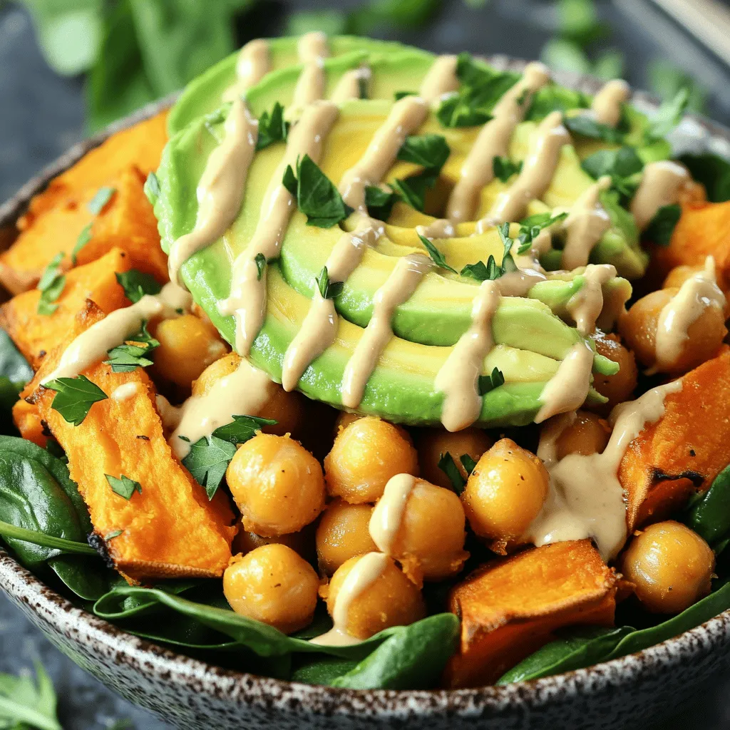 To make a tasty sweet potato chickpea bowl, you need these simple ingredients: - 2 medium sweet potatoes, peeled and cubed - 1 can (15 oz) chickpeas, drained and rinsed - 2 tablespoons olive oil - 1 teaspoon smoked paprika - 1 teaspoon ground cumin - 1 teaspoon garlic powder - Salt and pepper to taste - 4 cups spinach or mixed greens - 1 avocado, sliced - ¼ cup tahini - 2 tablespoons lemon juice - Water as needed for tahini sauce - Fresh herbs (parsley or cilantro) for garnish These ingredients work together to create a vibrant and healthy meal. Sweet potatoes add natural sweetness and creaminess. Chickpeas provide protein and fiber, making this bowl filling and nutritious. The spices enhance the dish with warmth and aroma. Fresh greens and creamy avocado complete the bowl, adding freshness and texture. Finally, the tahini sauce brings it all together with a nutty flavor. For the full recipe, click here. 1. Preheat the oven and prepare sweet potatoes. Start by preheating your oven to 425°F (220°C). This heat level helps the sweet potatoes caramelize nicely. While the oven warms up, peel and cube your sweet potatoes into bite-sized pieces. 2. Roast sweet potatoes until tender. In a large bowl, toss the sweet potato cubes with olive oil, smoked paprika, ground cumin, garlic powder, salt, and pepper. Make sure each piece is well-coated. Spread them on a baking sheet in a single layer. Roast for 25-30 minutes. Flip them halfway through for even cooking. The sweet potatoes should be tender and slightly caramelized. 3. Sauté chickpeas while sweet potatoes roast. While the sweet potatoes roast, heat a pan over medium heat. Add the remaining tablespoon of olive oil and the drained chickpeas. Season with salt, pepper, and a pinch of cumin. Sauté for 5-7 minutes until the chickpeas turn golden and slightly crispy. 1. Whisk together tahini and lemon juice. In a small bowl, combine tahini and lemon juice. Use a whisk to mix them until smooth. 2. Adjust consistency with water. Add water a little at a time to reach your desired sauce thickness. Aim for a drizzle-able texture. Don’t forget to season with salt to taste. 1. Layering greens, sweet potatoes, chickpeas, and avocado. Start with a base of fresh spinach or mixed greens in your bowl. Next, add the roasted sweet potatoes and sautéed chickpeas. Top with slices of avocado for creaminess. 2. Finish with tahini sauce. Drizzle the tahini sauce over your bowl. Garnish with fresh herbs like parsley or cilantro for a pop of flavor. This process will lead you to a delightful Sweet Potato Chickpea Bowl. For those who want all the details, check out the Full Recipe. Enjoy the layers of flavor! Tips for roasting sweet potatoes To roast sweet potatoes well, choose medium-sized ones. Cut them into even cubes. This helps them cook at the same rate. Use olive oil to coat the cubes. Season with smoked paprika, cumin, and garlic powder. Spread them in a single layer on a baking sheet. This prevents steaming and keeps them crispy. Roast at 425°F for 25-30 minutes. Flip halfway for even browning. How to achieve crispy chickpeas Start with drained and rinsed chickpeas. Pat them dry with a towel to remove moisture. Heat olive oil in your pan over medium heat. Add the chickpeas and season with salt and pepper. Sauté for about 5-7 minutes. Look for a golden color and slight crunch. If you want extra crispiness, try them in the oven for a few minutes after sautéing. Enhancing tahini sauce flavor To make tahini sauce pop, always use fresh lemon juice. This adds brightness and cuts through the richness. Mix tahini and lemon juice in a bowl. Gradually add water until you reach your desired thickness. Taste and adjust with salt. You can also add garlic powder or herbs for extra flavor. This sauce ties the whole bowl together. Pairing with grains or other vegetables This bowl is great with grains like quinoa or brown rice. They add a nice texture and heartiness. You can also mix in other veggies. Try roasted bell peppers, zucchini, or broccoli. They bring more color and nutrients to your meal. Optional toppings for extra flavor For a tasty twist, add toppings like nuts or seeds. Toasted pumpkin seeds or walnuts work well. Fresh herbs like parsley or cilantro add freshness. You can also sprinkle feta cheese for a savory touch. Don't be afraid to get creative with your toppings! For the complete recipe, check out the Full Recipe. {{image_2}} You can make your sweet potato chickpea bowl even more exciting by switching up some ingredients. Here are a few ideas: - Different vegetables: Try adding bell peppers for color, or zucchini for a soft bite. You can even mix in roasted carrots or broccoli to boost the nutrition. - Tahini substitutes: If you want a different flavor, replace tahini with yogurt. Greek yogurt adds creaminess and protein, which works well in this bowl. These small changes can give your dish a fresh twist while keeping it delicious. Making this bowl fit specific diets is easy. Here are some tips: - Vegan and gluten-free options: This recipe is naturally vegan and gluten-free. Just make sure any added toppings or sauces follow these guidelines. - High-protein modifications: To increase protein, add cooked quinoa or a sprinkle of hemp seeds. You can also toss in some grilled chicken or tofu for a heartier meal. Adjusting the recipe this way ensures everyone can enjoy your savory sweet potato chickpea bowl! To keep your sweet potato chickpea bowl fresh, store leftovers in the fridge. Use airtight containers to avoid moisture loss. Glass containers work well for this dish. They do not stain and are easy to clean. If you use plastic, choose BPA-free options for safety. - Let the bowl cool down before storing. - Separate the tahini sauce to keep it fresh longer. - Store the sweet potatoes and chickpeas together, but keep greens and avocado separate. Reheating can be tricky if you want to keep the texture right. Here are some methods to try: - Microwave: Pla