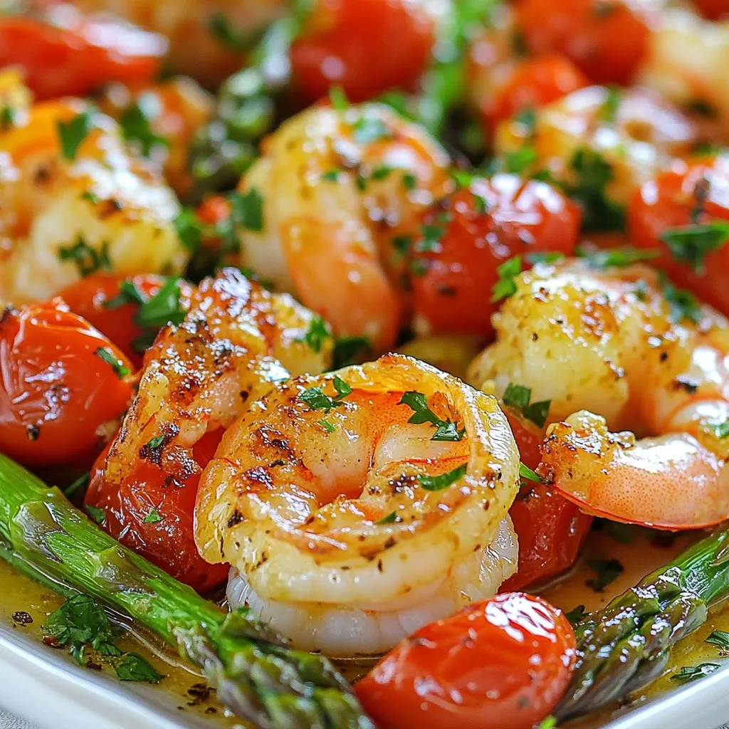A delicious and easy sheet pan meal featuring shrimp, asparagus, and cherry tomatoes tossed in garlic butter.