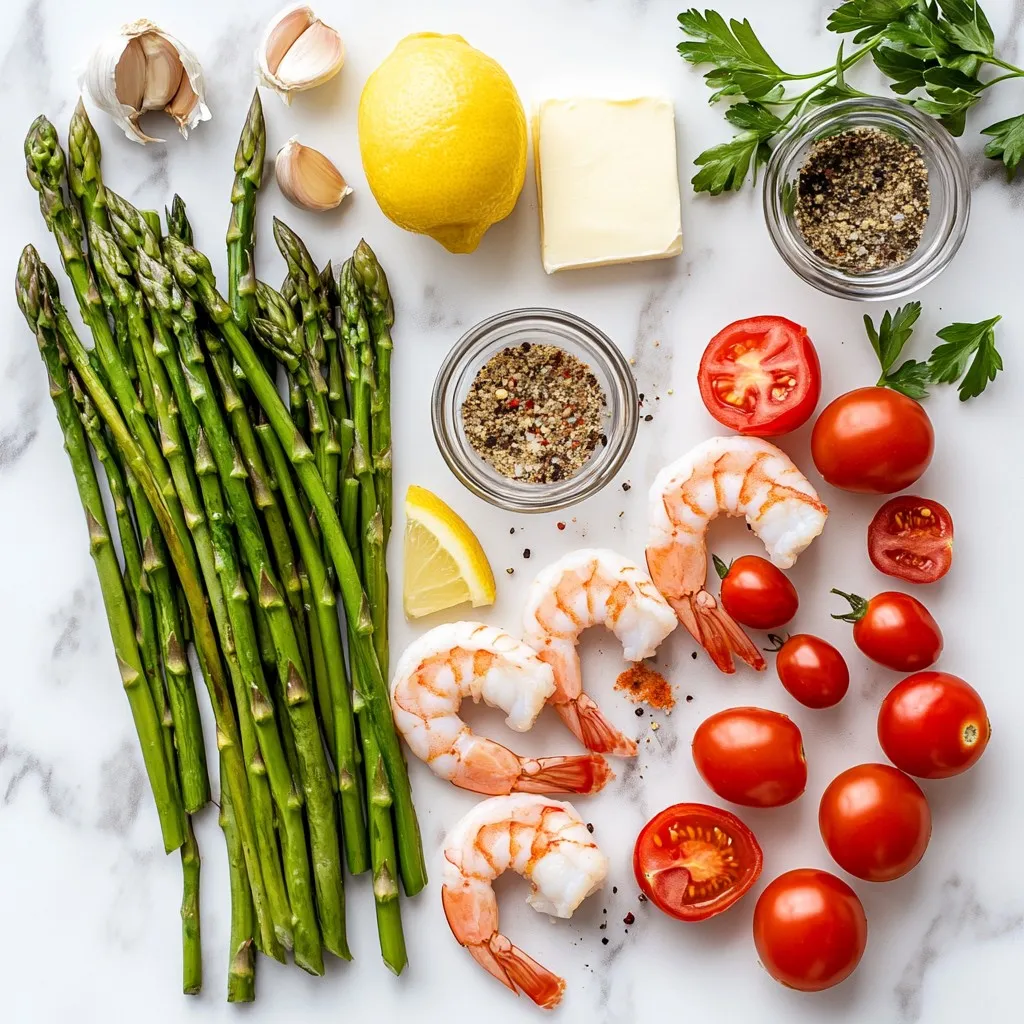 Gathering the right ingredients is key. Start with fresh shrimp; they should look shiny and smell like the sea. The butter adds richness. Minced garlic gives a strong flavor. Lemon juice and zest brighten the dish. Paprika and oregano bring warmth and earthiness. Use salt and pepper to enhance taste. Cherry tomatoes add sweetness, and asparagus gives texture. Don’t forget fresh parsley for a pop of color!