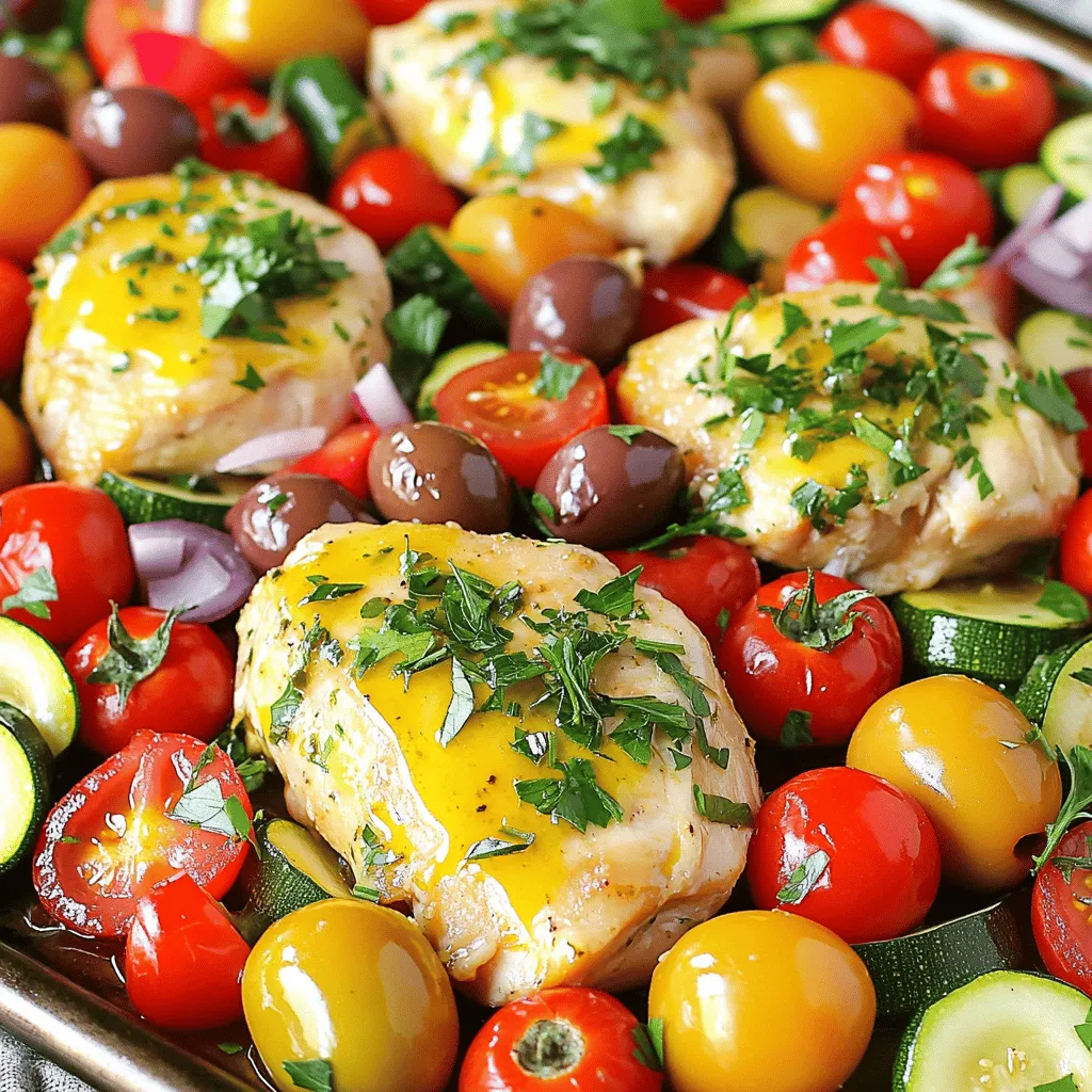- 4 boneless, skinless chicken breasts - 2 cups cherry tomatoes, halved - 1 red bell pepper, sliced - 1 zucchini, sliced - 1 red onion, chopped - ¼ cup Kalamata olives, pitted and halved - 3 tablespoons olive oil - 2 teaspoons dried oregano - 1 teaspoon garlic powder - Salt and pepper to taste - Juice of 1 lemon - Fresh parsley, chopped (for garnish) When you gather your ingredients, keep in mind the amounts. You need four chicken breasts. Each breast should be about six ounces. The cherry tomatoes add sweetness and color. Use two cups, halved. The red bell pepper gives crunch and flavor. Slice one pepper. Zucchini adds freshness. Slice one zucchini as well. The red onion adds a nice bite. Chop one onion. The Kalamata olives give a briny touch. You want a quarter cup of these. For flavor, you will use three tablespoons of olive oil and two teaspoons of dried oregano. Lastly, one teaspoon of garlic powder brings depth. Adjust salt and pepper to your taste. I love using fresh herbs when cooking. They add bright flavor. However, dried herbs work well too. For this recipe, dried oregano is perfect. It’s easy and still packs a punch. If you have fresh oregano, use it! You can double the amount. Fresh herbs give a garden taste. Always wash fresh herbs before using them. This will remove any dirt or bugs. Use them to sprinkle on top after cooking. This step adds color and flavor. Start by mixing the marinade. In a small bowl, combine three tablespoons of olive oil, the juice of one lemon, two teaspoons of dried oregano, and one teaspoon of garlic powder. Add salt and pepper to taste. Stir until it blends well. This marinade brings out bright flavors in your dish. Next, place the four chicken breasts on a baking sheet lined with parchment paper. Pour half of the marinade over the chicken. Make sure each piece is coated well. Let the chicken sit while you prepare the veggies. This step makes the chicken tender and tasty. In a large bowl, gather the veggies. Use two cups of halved cherry tomatoes, one sliced red bell pepper, one sliced zucchini, and one chopped red onion. Add a quarter cup of pitted and halved Kalamata olives. Drizzle the remaining marinade over the vegetables. Toss them gently to coat evenly. This mix adds color and nutrition to your meal. Now, spread the vegetables around the chicken on the baking sheet. Preheat your oven to 400°F (200°C). Bake the dish for 25 to 30 minutes. The chicken should reach an internal temperature of 165°F (75°C), and the veggies should be tender. Once done, remove it from the oven and let it rest for five minutes. This resting time helps the flavors settle. Garnish with fresh parsley, and enjoy your dish! Cooking chicken and veggies together saves time. Bake at 400°F for 25-30 minutes. The chicken should reach 165°F to be safe. Use a meat thermometer for accuracy. If you cut the chicken into smaller pieces, it cooks faster. Keep an eye on the veggies; they should be tender but not mushy. To boost flavor, add fresh lemon zest to the marinade. You can also try fresh herbs like thyme or rosemary. A pinch of red pepper flakes adds a bit of heat. If you love garlic, use fresh minced garlic instead of garlic powder. This adds a wonderful aroma and taste. Feel free to swap in your favorite veggies. Broccoli, carrots, or asparagus work great. Just cut them into similar sizes for even cooking. You can also use frozen vegetables if fresh ones are not available. They can save time and still taste good. Just be sure to thaw them first before adding to the pan. {{image_2}} Sheet-pan Greek chicken pairs great with simple sides. Here are my top picks: - Rice: A fluffy white or brown rice is a great base. - Pasta: Toss some cooked pasta with olive oil and herbs. - Pita Bread: Warm pita adds a nice touch and soaks up flavors. - Greek Salad: Fresh tomatoes, cucumber, and feta make a bright side. These sides add color and flavor to your meal. Drink choices can enhance your meal. Here are some ideas: - White Wine: A crisp Sauvignon Blanc goes well with chicken. - Rosé: A chilled rosé offers a fruity and refreshing sip. - Sparkling Water: Add lemon wedges for a zesty twist. - Iced Tea: Unsweetened tea with mint is a nice non-alcoholic option. These drinks balance the dish's richness and flavors. A good garnish makes the meal look special. Consider these options: - Fresh Parsley: Sprinkle more chopped parsley for color. - Lemon Wedges: Serve lemon wedges for extra zest. - Feta Crumbles: Add feta for a salty, creamy touch. - Olives: Whole Kalamata olives can add a nice pop. These garnishes improve both taste and presentation. Enjoy! After you cook your Sheet-Pan Greek Chicken and Veggies, let it cool. Then, store it in an airtight container. This way, it stays fresh in the fridge for up to three days. Make sure to keep the chicken and veggies together for the best flavor. To freeze, first cool the dish completely. Then, place it in a freezer-safe container. It can last for about three months in the freezer. When you're ready to eat, thaw it overnight in the fridge before reheating. To reheat, use your oven for the best results. Preheat it to 350°F (175°C). Place the chicken and veggies on a baking sheet. Heat for about 15 to 20 minutes or until they are warm. You can also use a microwave, but the oven keeps everything crisp. Enjoy your tasty meal again! Yes, you can use different proteins. You could try turkey, pork, or tofu. Each option will give a unique taste. Adjust the cooking time based on the protein you choose. You can mix and match your favorite veggies. Broccoli, asparagus, or even carrots work well. Just make sure to cut them into similar sizes for even cooking. You can easily scale the recipe. Simply use more or less chicken and veggies. Keep the marinade ratios the same to maintain the flavor. Yes, you can prep this dish ahead of time. Marinate the chicken and chop the veggies, then store in the fridge. Bake it fresh when you’re ready to eat. The 