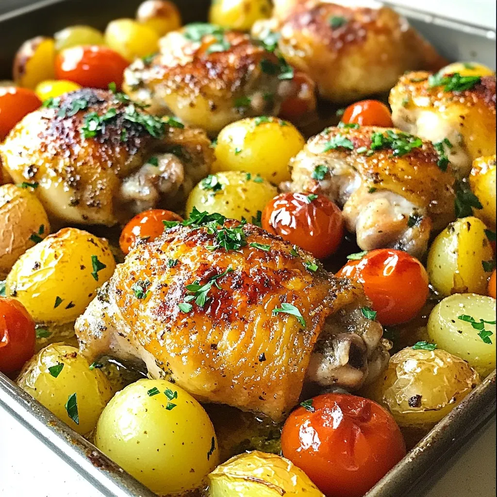 A delicious and easy one-pan meal featuring marinated chicken thighs, baby potatoes, and cherry tomatoes, all roasted to perfection.