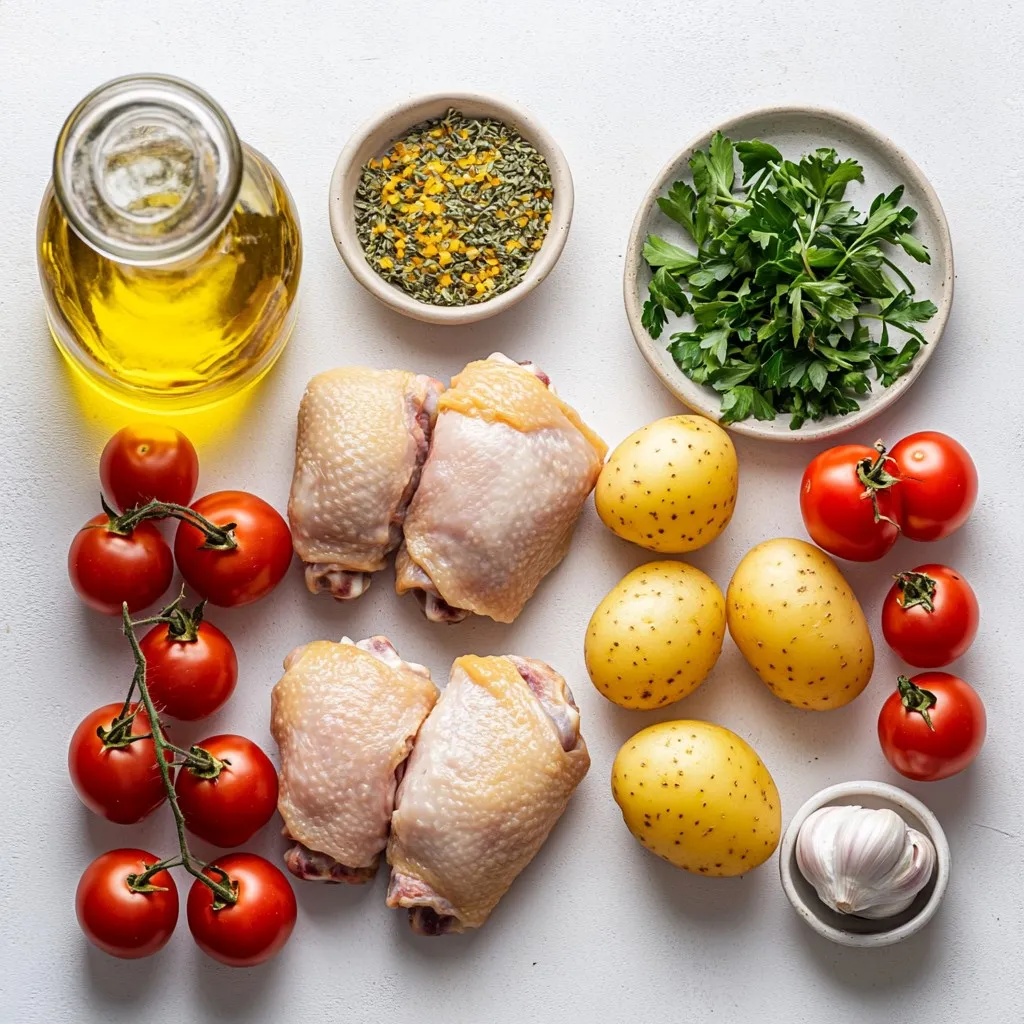 You need bone-in, skin-on chicken thighs for this recipe. These provide great flavor and moisture. Baby potatoes add a nice texture and taste. Halve them for even cooking. Cherry tomatoes bring sweetness and color to the dish.