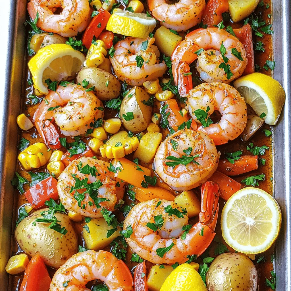 ![- 1 pound large shrimp, peeled and deveined - 2 cups baby potatoes, halved - 1 ear of corn, cut into 1-inch pieces - 1 bell pepper (red or yellow), chopped - 1 small red onion, chopped - 3 cloves garlic, minced - 2 tablespoons olive oil - 1 tablespoon Old Bay seasoning - 1 teaspoon smoked paprika - 1 teaspoon lemon zest - Salt and pepper to taste - Lemon wedges for serving - Fresh parsley, chopped for garnish Shrimp is a great source of protein. It is low in calories and high in nutrients. Baby potatoes provide fiber and potassium. They add a nice texture to the dish. Corn is sweet and adds crunch. Bell peppers bring color and vitamins. Red onions add flavor and antioxidants. Garlic boosts immune health and enhances taste. Olive oil provides healthy fats and helps with cooking. Old Bay seasoning gives that classic seafood flavor. Smoked paprika adds warmth and depth. Lemon zest brightens the dish and balances the flavors. If you cannot find shrimp, you can use chicken or tofu. For potatoes, try sweet potatoes or carrots. Instead of corn, peas or green beans work well. Any color bell pepper can replace the one you have. If you dislike red onion, yellow or white onions are fine. You can swap garlic for garlic powder if needed. For a lighter oil, consider avocado oil. If you want a different spice, Cajun seasoning can replace Old Bay. If you want a fresh taste, fresh herbs can replace parsley. This recipe is easy and fun. You can find the Full Recipe online to make this tasty dish! Start by washing all your veggies. Cut the baby potatoes in half. This helps them cook faster. Next, chop the bell pepper and red onion into small pieces. Cut the corn into 1-inch chunks. Place all these veggies in a big bowl. Add olive oil, Old Bay seasoning, smoked paprika, lemon zest, salt, and pepper. Toss well to coat every piece. This mix gives your dish a great flavor and aroma. Now it’s time to prepare the shrimp. Make sure they are peeled and deveined. In a small bowl, sprinkle the shrimp with Old Bay seasoning, salt, and pepper. Mix them gently to coat. The seasoning adds a nice kick. Keep the shrimp aside while the veggies roast in the oven. Preheat your oven to 400°F (200°C). Line your sheet pan with parchment paper for easy cleanup. Spread the seasoned veggies on the pan in a single layer. Roast them for 20 minutes. This makes the potatoes tender and brings out the flavors. After 20 minutes, take the pan out and add the shrimp among the veggies. Roast everything for an extra 8-10 minutes. The shrimp should turn pink and opaque when done. Serve hot with lemon wedges and a sprinkle of fresh parsley. Enjoy this flavorful meal! Check the Full Recipe for more details. To get perfectly cooked shrimp, timing is key. Shrimp cook fast. You want them pink and opaque. Overcooking makes them tough. Follow this simple rule: cook shrimp for about 8-10 minutes. Add shrimp to the pan only after the veggies are almost done. This way, they won't overcook. If you see them curl up, they are done! Adjust the seasoning to your taste. I love using Old Bay seasoning for a classic touch. Want more heat? Add cayenne pepper or red pepper flakes. For a fresh twist, try some fresh herbs like thyme or dill. Lemon zest adds brightness. Don't forget to taste as you go. You can always add more, but you cannot take it away! One common mistake is crowding the pan. If the shrimp and veggies are too close, they steam instead of roast. This makes everything soggy. Make sure they have space to cook evenly. Another mistake is not preheating the oven. A hot oven helps to get that nice roast and crisp. Lastly, don’t skip the lemon wedges. They brighten up the dish and add fresh flavor. Try these tips for a delicious meal every time! For the full recipe, check here: [Full Recipe]. {{image_2}} You can easily add more seafood to your shrimp boil. Try including 1 pound of scallops or crab legs. They cook quickly and add a sweet flavor. Mussels or clams work great too. Just toss them in with the shrimp towards the end of cooking. This will give you a more diverse seafood feast. If you want a meat-free version, swap shrimp for chickpeas or tofu. Use about 1 can of chickpeas, drained and rinsed. For tofu, press and cube 14 ounces before seasoning. Add hearty vegetables like zucchini or asparagus for extra texture. This keeps the dish colorful and filling, perfect for everyone. You can switch up the flavors too! Instead of Old Bay, use Cajun seasoning for a spicier kick. A dash of lime juice can brighten the dish. Try adding fresh herbs like dill or cilantro for a fresh taste. Experiment with different spices to find your favorite mix. For more ideas, check out the Full Recipe and see the full range of options! Store leftover shrimp boil in an airtight container. It will stay fresh for up to three days. Keeping it in the fridge makes it easy to enjoy again. Just make sure to let it cool before sealing the container. This helps keep your shrimp and veggies tasty. You can freeze leftovers if you won't eat them soon. Place the cooled shrimp boil in a freezer-safe bag. Squeeze out as much air as you can. This helps avoid freezer burn. It will last for up to two months. When you're ready to eat it, thaw it in the fridge overnight. To reheat, place the shrimp boil in a pan on medium heat. Add a splash of water or broth to keep it moist. Stir it often to ensure even heating. You can also use the microwave. Heat it in short bursts, stirring in between. This way, you get a warm, tasty meal without drying it out. You can find the Full Recipe for this delicious dish to make again! You can serve this dish with many sides. Simple options include a fresh salad or garlic bread. A coleslaw adds crunch and flavor. Try some rice for a filling meal. You can also serve it with melted butter for dipping. Lemon wedges add a zesty touch too. Each side complements the shrimp boil well. The shrimp cook fast! They turn bright pink when done. You should also look for 