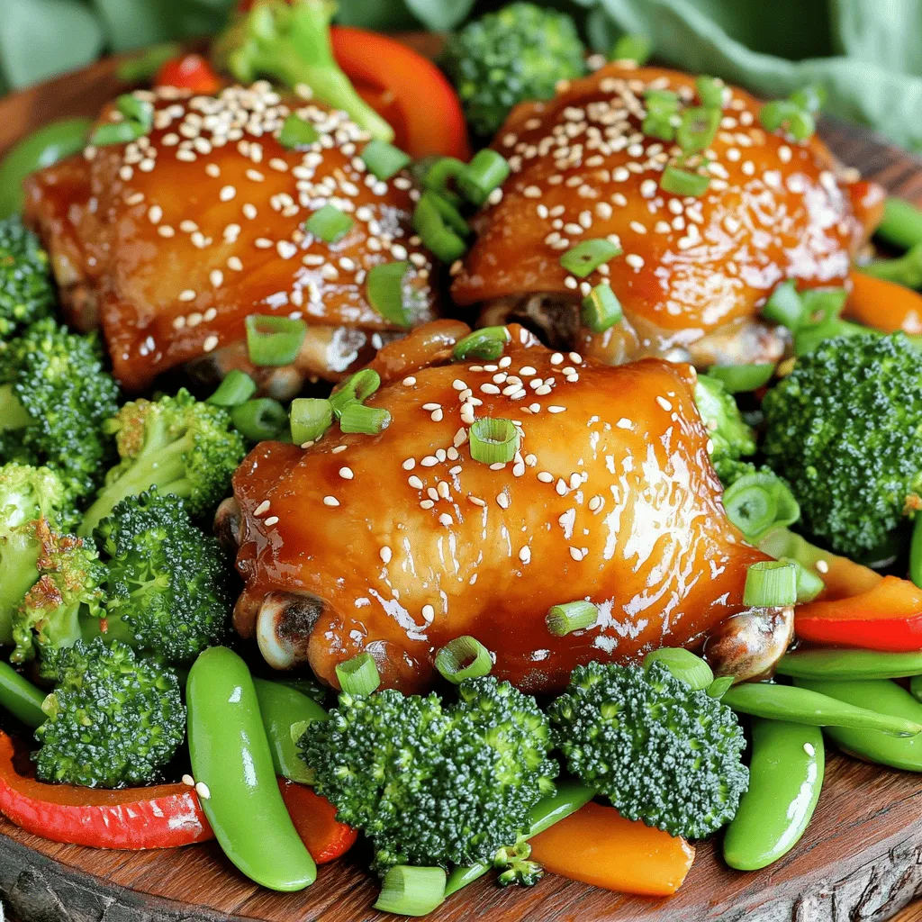To make this dish, you need: - 4 chicken thighs, bone-in, skin-on - 1/4 cup low-sodium soy sauce - 1/4 cup honey - 2 tablespoons rice vinegar - 2 tablespoons sesame oil These chicken thighs give great flavor. The bone and skin add moisture. The soy sauce brings saltiness, while honey adds sweetness. The marinade is key to a tasty meal. Here’s what you need: - 3 cloves garlic, minced - 1 tablespoon fresh ginger, grated - 1 teaspoon red pepper flakes (optional, for spice) Garlic and ginger both add depth. They bring warmth and a little zing. Red pepper flakes can give you a kick. You can skip them if you want less heat. Veggies add color and crunch. Use these: - 2 cups broccoli florets - 1 red bell pepper, sliced - 1 cup snap peas These choices are fresh and vibrant. Broccoli and snap peas stay crisp when baked. Red bell pepper adds sweetness and color. Together, they make the dish more balanced and healthy. To start, gather your ingredients. You need low-sodium soy sauce, honey, rice vinegar, sesame oil, minced garlic, fresh ginger, and red pepper flakes. In a bowl, mix all these ingredients. Whisk them well until they blend. This marinade gives the chicken its sweet and savory taste. Take your chicken thighs. Place them in a large zip-top bag or a bowl. Pour the teriyaki marinade over the chicken. Make sure each piece is coated well. For the best flavor, let them marinate for at least 30 minutes. If you have time, two hours in the fridge works even better. Once the chicken is marinated, it’s time to prepare the sheet pan. Preheat your oven to 400°F (200°C). Take a large sheet pan and arrange the marinated chicken thighs skin-side up. Don’t forget to leave some space between each piece. This allows them to cook evenly. Now, let’s cook! Bake the chicken in the oven for 25 to 30 minutes. The chicken should reach an internal temperature of 165°F (74°C). For extra crispiness, switch the oven to broil for the last five minutes. Watch it closely to avoid burning. Once done, let the chicken rest for a few minutes before serving. Marinating is key for great flavor. Use a mix of soy sauce, honey, and sesame oil. Let the chicken soak up the marinade for at least 30 minutes. If you have time, go for 2 hours. This gives the chicken a deeper taste. Always make sure the chicken is well-coated. You can use a zip-top bag or a bowl for this. Crispy skin is a must for this dish. Bake the chicken skin-side up on the sheet pan. Use a high oven temp of 400°F (200°C) for best results. In the last 5 minutes of cooking, switch to broil. This will help crisp the skin even more. Keep a close eye on it to avoid burning. Presentation matters! Serve the chicken on a platter with the veggies around it. Drizzle any leftover teriyaki sauce over the top. Add sesame seeds and sliced green onions for extra flavor. This not only looks good but also tastes great. You can pair it with rice or noodles for a full meal. Enjoy your colorful dish! {{image_2}} You can mix up the veggies in this dish. Try adding carrots, zucchini, or asparagus. They add color and flavor. You can also use bell peppers in different colors. Each vegetable brings a unique taste. Get creative with your choices! Aim for veggies that roast well and stay crunchy. If you want a change from chicken, use tofu or salmon. Tofu absorbs the teriyaki sauce well. It gives a nice texture and flavor. Salmon cooks quickly and pairs great with teriyaki. You can also use pork or beef. Just adjust the cooking time for different proteins. Enhance the teriyaki flavor by adding spices. Try garlic powder or onion powder. They deepen the taste without much effort. For extra heat, mix in more red pepper flakes or some Sriracha. You can also drizzle sesame sauce or hoisin sauce for a twist. Don't forget to add fresh herbs like cilantro or basil for fresh notes! After you enjoy your sheet pan teriyaki chicken thighs, store leftovers for later. Place the chicken and veggies in an airtight container. They will stay fresh for up to three days in the fridge. For best taste, cool them first, then seal tightly. To reheat, use your oven for the best results. Preheat it to 350°F (175°C). Place the chicken and veggies on a baking sheet. Heat for about 15 minutes or until warm. You can also use a microwave, but the oven keeps the chicken skin crispy. If you want to save some for a later meal, freezing works well. Wrap the chicken and veggies tightly in plastic wrap. Then, put them in a freezer bag. They can last for up to three months. To enjoy, thaw overnight in the fridge and reheat as mentioned above. Yes, you can use boneless chicken thighs. They will cook faster than bone-in thighs. Adjust the cooking time to about 20-25 minutes. You want the internal temperature to reach 165°F (74°C). Boneless thighs will still soak up the teriyaki flavor well. The best way to check if the chicken is done is to use a meat thermometer. Insert it into the thickest part of the thigh. It should read 165°F (74°C). If you don’t have a thermometer, cut into the chicken. The juices should run clear, not pink. The skin should also be crispy and golden brown. Teriyaki chicken thighs pair well with many sides. Here are some ideas: - Steamed rice or jasmine rice - Quinoa or brown rice - Stir-fried vegetables - A fresh salad with sesame dressing - Noodles tossed in soy sauce and veggies These sides will complement the sweet and savory flavors of the chicken. You now have a full guide to making teriyaki chicken thighs. We covered the main ingredients, marinade components, and tasty vegetable additions. I walked you through the steps to prepare, marinate, and cook the chicken perfectly. I shared tips for the best crispy skin and serving ideas. Plus, you learned about variations, storage tips, and answered common questions. Enjoy making this dish! It’s simple, tasty, and sure to please everyone. Happy cooking!