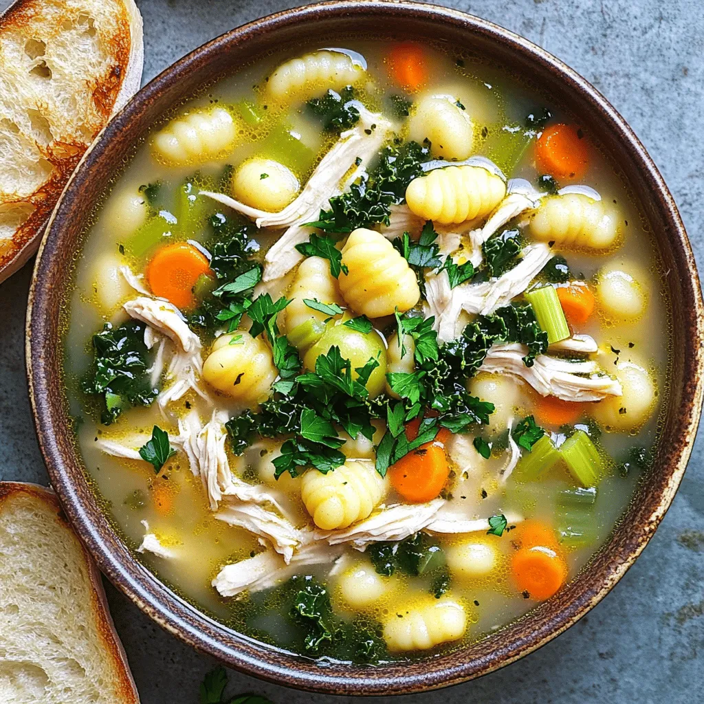 - Chicken and Vegetables - 1 lb boneless, skinless chicken breasts - 4 cups chicken broth - 2 cups kale, chopped - 1 cup carrots, diced - 1 cup celery, diced - 1 cup potatoes, diced - Spices and Seasonings - 1 teaspoon dried thyme - 1 teaspoon garlic powder - 1 teaspoon onion powder - 1 teaspoon Italian seasoning - Salt and pepper to taste - Cream and Gnocchi - 1 cup heavy cream - 12 oz gnocchi (store-bought or homemade) - Fresh parsley, chopped for garnish In this cozy soup, the chicken and vegetables shine. The chicken gives a rich taste, while the veggies—like kale, carrots, celery, and potatoes—add color and nutrients. We use dried thyme, garlic powder, onion powder, and Italian seasoning for flavor. These spices bring warmth and comfort to each spoonful. Heavy cream makes the soup creamy and rich. Gnocchi adds a soft, pillowy texture that you will love. I like to finish with fresh parsley. It adds a pop of color and a fresh taste. Enjoy combining all these ingredients for a delicious soup that warms your heart! - Layering Ingredients: Start by placing 1 pound of boneless, skinless chicken breasts at the bottom of your slow cooker. This helps the chicken cook evenly. Next, pour in 4 cups of chicken broth. Then, add 2 cups of chopped kale, 1 cup of diced carrots, 1 cup of diced celery, and 1 cup of diced potatoes. Layering like this gives great flavor. - Adding Seasonings: Now, sprinkle in 1 teaspoon each of dried thyme, garlic powder, onion powder, and Italian seasoning. These spices add warmth and depth to your soup. Gently stir everything to mix the ingredients well. - Setting the Cooking Time: Set your slow cooker on low heat for 6 to 7 hours. If you’re in a hurry, you can set it on high for 3 to 4 hours. The chicken should be fully cooked, and the veggies tender. - How to Shred Chicken Properly: After cooking, take the chicken out of the slow cooker. Use two forks to shred the chicken into bite-sized pieces. This method works best and keeps the chicken juicy. - Returning Chicken to Soup: Once shredded, return the chicken to the slow cooker. Stir it in gently so it mixes with the broth and veggies. - Incorporating Gnocchi: Now it's time to add 12 ounces of gnocchi to the soup. If you use store-bought gnocchi, it cooks quickly. Stir it in and let the soup cook on high for an additional 30 minutes or until the gnocchi is tender. - Adjusting Seasoning: After the gnocchi is ready, taste the soup. Add salt and pepper as needed. This step ensures your soup has the perfect flavor. If you like, you can also stir in 1 cup of heavy cream for extra richness. This simple process makes a cozy meal that warms you up inside. Using fresh herbs can make a big difference in taste. I recommend adding fresh parsley at the end for a bright flavor. You can also add a few sprigs of thyme during cooking. This adds depth to the soup without overpowering it. For seasoning adjustments, taste the soup before serving. If it needs more kick, add a pinch of salt or pepper. If you like heat, add crushed red pepper flakes. They give a nice warmth without changing the soup too much. For best slow cooker settings, I suggest using low heat for 6 to 7 hours. This method lets the flavors blend nicely. If you are short on time, you can set it to high for 3 to 4 hours. Just check that the chicken reaches a safe temperature. Cooking time can vary based on your slow cooker model. If your soup is not bubbling after the time is up, give it a little longer. Each slow cooker heats differently, so keep an eye on it. For serving suggestions, use deep bowls to show off the soup’s colors. A sprinkle of parsley on top adds a nice touch. You can also serve it with crusty bread for dipping. It makes the meal feel more special. For topping ideas, consider adding a dollop of sour cream or a sprinkle of grated cheese. These extras can really elevate the dish. Just remember to keep it simple to let the soup shine. {{image_2}} Alternative Vegetables You can change the veggies in this soup. Try adding chopped spinach, peas, or zucchini. Each choice adds a different texture and taste. You can also use sweet potatoes for a sweeter flavor. Different Types of Gnocchi Gnocchi is a fun part of this soup. You can use potato gnocchi, but try other types too. Cauliflower gnocchi is a great low-carb swap. Store-bought options make it easy, but homemade gnocchi adds a personal touch. Gluten-Free Options To make this soup gluten-free, choose gluten-free gnocchi. Many stores offer this option now. Also, check that your chicken broth is gluten-free. This way, everyone can enjoy the meal. Dairy-Free Alternatives If you need a dairy-free version, swap heavy cream for coconut milk. This change keeps the soup creamy but adds a hint of coconut flavor. You can also use a dairy-free cream substitute for a similar taste. Adding Spices Want more flavor? Add spices! A pinch of red pepper flakes gives it heat. You could also use smoked paprika for a smoky twist. Experiment to find your favorite spice mix. Experimenting with Broths The broth is key to great taste. While chicken broth works well, vegetable broth is a tasty option too. Using homemade broth can make the flavors shine. You could even mix broths for a unique taste. How do you store leftovers? After you make the soup, let it cool. Then, place it in an airtight container. You can keep it in the fridge for up to three days. This way, you can enjoy it later. What is the shelf life of the soup? In the fridge, the soup lasts about three days. If you want to keep it longer, consider freezing it. Can you freeze the soup? Yes, you can freeze this soup. Pour the cooled soup into freezer-safe containers. Leave some space at the top. The soup will expand as it freezes. You can freeze it for up to three months. How do you thaw and reheat the soup? To thaw, move the soup from the freezer to the fridge a day before you want to eat it. For quick thawing, you can use the microwave on low power. When reheating, 