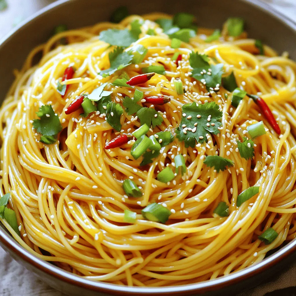 - 8 oz spaghetti or your favorite noodles - 4 tablespoons unsalted butter - 6 cloves garlic, minced - 1-2 red chili peppers, finely chopped - 1 tablespoon soy sauce - 1 tablespoon chili oil (optional) - 1 teaspoon sesame oil - ¼ cup green onions, sliced - ¼ cup fresh cilantro, chopped - Salt and black pepper to taste - 1 tablespoon sesame seeds (for garnish) The base of this dish is the noodles. Spaghetti works great, but any noodle you love can shine here. The butter brings a rich flavor, and garlic adds a nice kick. Red chili peppers give it the heat, so adjust them to match your spice level. You can easily change ingredient amounts to serve more or fewer people. For two servings, stick to the recipe. If you want to make it for four, just double everything. If you need substitutes, use olive oil instead of butter. It won't be as rich, but it still tastes good. For fresh herbs, you can try dried herbs if that’s what you have on hand. They add a different flavor but can still work well in this dish. Experimenting with ingredients can lead to fun new flavors. Feel free to swap things out based on what you like or have available. To start, bring a large pot of salted water to a boil. This helps the noodles taste great. Add 8 ounces of spaghetti or your favorite noodles. Cook according to the package's directions until they are al dente. This means they should be firm, not mushy. To avoid overcooking, set a timer. When the noodles are ready, save ½ cup of the pasta water. Then, drain the noodles in a colander. Next, grab a large skillet and set it over medium heat. Add 4 tablespoons of unsalted butter. Let it melt slowly. Once melted, toss in 6 minced garlic cloves and 1-2 finely chopped red chili peppers. Cook for about 2-3 minutes. You want the garlic to smell good and turn slightly golden. Be careful not to burn it! Now, add 1 tablespoon of soy sauce and, if you want more heat, mix in 1 tablespoon of chili oil. Finally, add 1 teaspoon of sesame oil to balance the flavors. Now, it's time to bring everything together. Add the drained noodles to the skillet. Toss them well in the spicy garlic butter sauce. If the noodles look dry, use the reserved pasta water. Add a little at a time until you reach your desired consistency. Season with salt and black pepper to taste. Toss for another minute to coat the noodles fully. Once done, remove from heat. Stir in ¼ cup of sliced green onions and ¼ cup of fresh cilantro. Serve right away and sprinkle some sesame seeds on top for a nice crunch. To make the best Spicy Garlic Butter Noodles, you need to think about spice. Choosing the right chili peppers makes a big difference. I suggest using red chili peppers for heat. If you want more spice, add more peppers. If you prefer less heat, use fewer. Always taste as you go. Enhancing umami is key for flavor. You can add soy sauce for a savory kick. A dash of fish sauce also boosts the umami. Each adds a layer of depth. Don’t skip these; they make a big impact. Sautéing garlic right is crucial. Use medium heat when you cook garlic. This keeps it from burning. If garlic burns, it tastes bitter. Cook it just until it’s fragrant and golden. This will give your noodles a rich flavor. For a creamy texture without cream, use reserved pasta water. After you toss in your noodles, add a bit of the starchy water. This helps bind the sauce and noodles. It makes everything silky smooth. Just a little will do. {{image_2}} You can add chicken, shrimp, or tofu for extra protein. Start by cooking your protein in the skillet before adding the garlic. - For chicken: Cut it into bite-sized pieces. Cook over medium heat until no longer pink, about 5-7 minutes. - For shrimp: Add raw shrimp directly after sautéing the garlic. Cook until they turn pink, about 2-3 minutes. - For tofu: Use firm tofu, cubed. Sauté until golden and crispy, about 5-6 minutes, before adding garlic. Once your protein is cooked, follow the sauce instructions. Toss the protein with the noodles to mix the flavors well. You can brighten your dish with seasonal vegetables. Try adding bell peppers, broccoli, or snap peas. - Bell peppers: Slice them thinly. Sauté with garlic for 2-3 minutes. - Broccoli: Cut into small florets. Blanch briefly in boiling water, then add to the skillet. - Snap peas: Add them whole during the last minute of cooking. These veggies add color and crunch without losing flavor. Stir them in with the noodles before serving. Get creative by using different oils. Olive oil and peanut oil can change the taste. - Olive oil: Use it for a milder flavor. Add it before the garlic to infuse the oil. - Peanut oil: This oil adds a nutty taste. Use it in place of sesame oil for a twist. Adding citrus can also brighten your dish. Squeeze fresh lime or lemon juice over the noodles just before serving. This adds a fresh zing and balances the heat. To store leftover Spicy Garlic Butter Noodles, place them in an airtight container. Make sure the noodles cool down before sealing the lid. This helps keep the noodles fresh. You can keep them in the fridge for up to three days. After that, the taste may fade, and the texture might change. To reheat, the best method is using a skillet. Add a small splash of water or broth to help steam the noodles. Heat over medium-low until warmed through. Stir often to avoid sticking. If the noodles feel dry, add a few drops of oil or a small amount of reserved pasta water. This will help revive their texture and flavor. Yes, you can make this dish vegan. Use vegan butter instead of regular butter. Choose noodles that are egg-free, like rice noodles or whole wheat. These swaps keep the flavor while making it plant-based. You can pair these noodles with a variety of side dishes. Here are a few ideas: - Steamed broccoli or bok choy - Crispy tofu or grilled chicken - A fresh green salad with sesame dressing - Spring rolls for a crunchy bite To change the spice level, modify the chili peppers. Use fewer peppers f