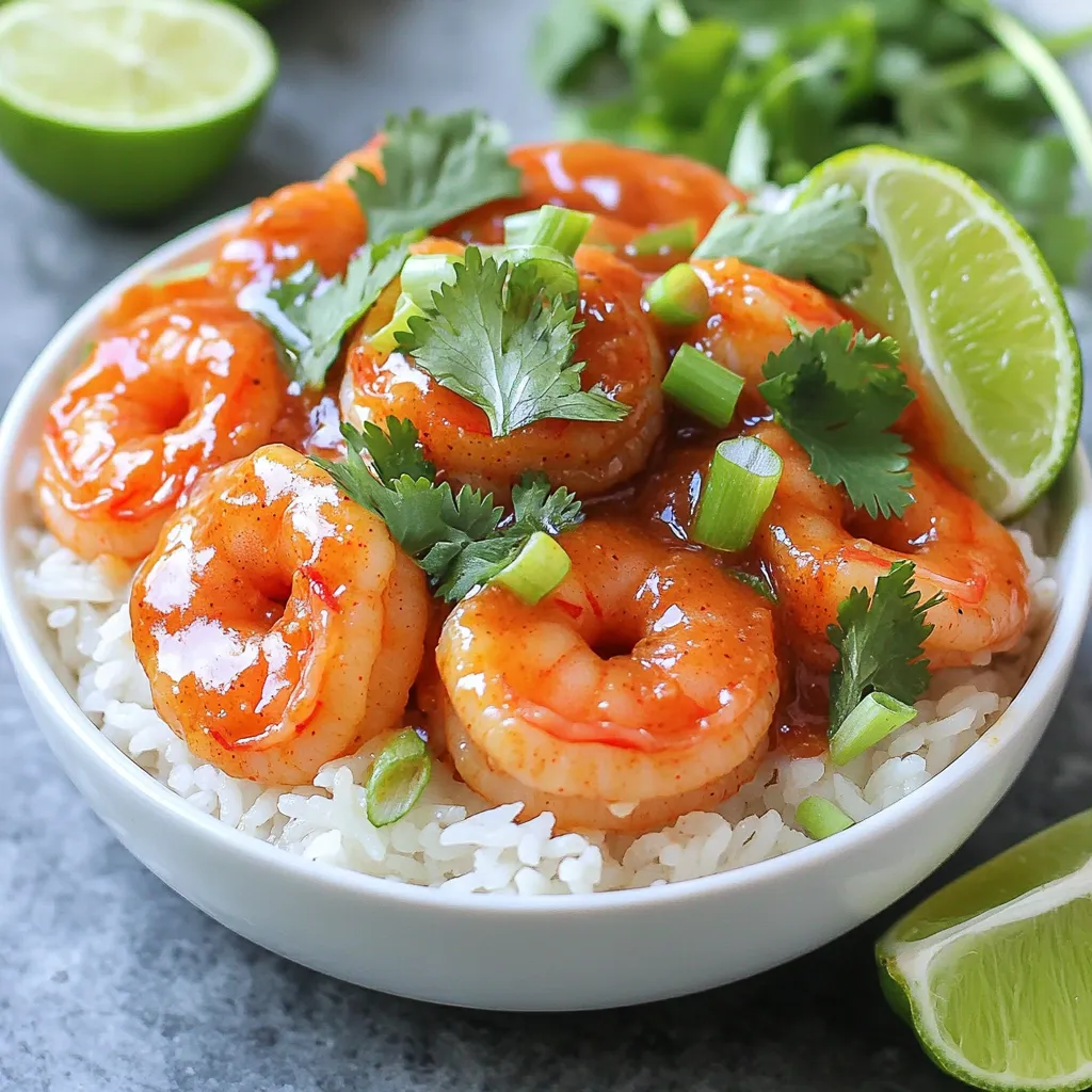For the final touch, garnish with sliced green onions and chopped cilantro. Serve with lime wedges on the side. This adds a fresh and zesty flavor to your meal. Enjoy your spicy garlic shrimp rice bowls!
