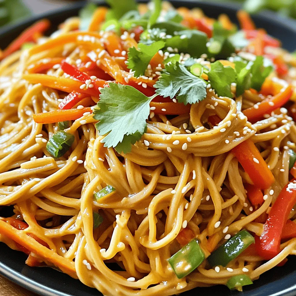 This dish is a tasty mix of flavors and textures. You will love the creamy sauce and fresh veggies. It’s quick to make and can be served warm or cold. - 8 oz soba noodles - 1/2 cup creamy peanut butter - 2 tablespoons soy sauce - 1 tablespoon rice vinegar - 1 tablespoon sesame oil - 2 teaspoons sriracha (adjust for spice level) - 1 tablespoon fresh ginger, grated - 2 cloves garlic, minced - 1 carrot, julienned - 1 red bell pepper, thinly sliced - 1/4 cup scallions, chopped - 1 tablespoon sesame seeds (for garnish) - Fresh cilantro, for garnish You can swap soba noodles for rice noodles if needed. Use sunflower seed butter for nut-free options. If you want less heat, reduce the sriracha. Instead of fresh ginger, try ground ginger for convenience. You can also use apple cider vinegar in place of rice vinegar. Feel free to mix in any veggies you have on hand, such as zucchini or snap peas. This recipe is flexible and always tastes great! To start, grab a pot and fill it with water. Place it on the stove and bring the water to a boil. Once boiling, add 8 oz of soba noodles. Cook them for about 5 to 7 minutes, following the package instructions. After they are cooked, drain the noodles and rinse them under cold water. This stops the cooking and helps keep them firm. Set the noodles aside while you prepare the sauce and veggies. In a medium bowl, you will make the sauce. Combine 1/2 cup of creamy peanut butter, 2 tablespoons of soy sauce, 1 tablespoon of rice vinegar, and 1 tablespoon of sesame oil. Then, add 2 teaspoons of sriracha for heat, along with 1 tablespoon of grated fresh ginger and 2 cloves of minced garlic. Mix all the ingredients well until the sauce is smooth and creamy. If it feels too thick, add a tablespoon of warm water to make it easier to pour. Now, it’s time to bring everything together. In a large bowl, add your julienned carrot, thinly sliced red bell pepper, and 1/4 cup of chopped scallions. Toss them well. Next, add the cooked soba noodles to the bowl with the veggies. Pour the creamy peanut sauce over the noodles. Toss everything together gently until the noodles and vegetables are fully coated in that delicious sauce. To get the right sauce, mix the peanut butter with soy sauce, vinegar, and oil. If it feels too thick, add warm water, one tablespoon at a time. This helps make the sauce smooth. You want it creamy but easy to pour. Taste the sauce as you mix. Adjust the spice with more sriracha if you like it hot. When cooking soba noodles, use a large pot of boiling water. Follow the package instructions, usually about 5 to 7 minutes. Stir the noodles gently to prevent sticking. Once cooked, drain them and rinse under cold water. This stops the cooking and keeps them from getting mushy. For best texture, serve them right after rinsing. Serve your spicy peanut soba noodles in bowls. Top them with sesame seeds and fresh cilantro for extra flavor. You can enjoy them warm or cold. These noodles pair well with grilled chicken or shrimp for added protein. Add extra veggies like snap peas or cucumber for crunch. The dish is versatile and can be adjusted to your taste. {{image_2}} You can easily add protein to your spicy peanut soba noodles. Tofu is a great choice for a plant-based option. Use firm tofu, and press it to remove excess water. Cut it into cubes and sauté it until golden. For meat lovers, chicken works well. Grill or pan-cook chicken breasts and slice them thinly. Add the chicken right before serving for warmth. Shrimp is another tasty option. Cook shrimp in a skillet until they turn pink. Mix them in with the noodles and sauce. Each protein adds its own unique flavor and texture to the dish. You can customize your veggies in this dish. Zucchini is a great choice. Slice it into thin rounds or half-moons, and add it to your mix. Bok choy is also a fantastic addition. Chop it into small pieces and toss it in with the other veggies. Feel free to mix in any quick-cooking vegetables you love. Snow peas, bell peppers, or even broccoli work well. The goal is to keep the colors bright and the textures crunchy. Adjusting the spice level is easy. If you like it hotter, add more sriracha. Start with a teaspoon and taste as you go. For a milder version, reduce the sriracha or leave it out completely. You can still enjoy the creamy peanut flavor without the heat. You can also add a dash of chili flakes or fresh chopped chili for an extra kick. Find your perfect balance and enjoy your unique dish! To keep your spicy peanut soba noodles fresh, store them in an airtight container. Make sure the noodles are completely cool before sealing. This helps prevent sogginess. Place them in the fridge if you plan to eat them within three days. If you want to keep them longer, you can freeze them. When you're ready to enjoy your leftovers, take them out of the fridge. You can reheat them in a microwave or on the stove. For the microwave, place the noodles in a bowl and cover with a damp paper towel. Heat for 1-2 minutes. Stir halfway to ensure even heating. If using the stove, add a splash of water to a pan and heat on low. Stir until warm. To freeze your spicy peanut soba noodles, divide them into portions. Use freezer-safe bags or containers. Label the bags with the date for easy tracking. When you’re ready to eat, thaw them in the fridge overnight. Reheat as mentioned above. This keeps the flavors intact and makes for a quick meal option later. Soba noodles are thin noodles made from buckwheat flour. They have a nutty flavor and a chewy texture. Many people enjoy them because they are gluten-free and packed with nutrients. Soba noodles cook quickly, usually in just 5 to 7 minutes. You can serve them hot or cold, making them very versatile. Yes, you can! To make this recipe nut-free, simply replace the peanut butter with sun butter or tahini. Both options give a creamy texture without nuts. You can also use a nut-free soy sauce if you need to avoid soy. Adjust the seasonings to ma