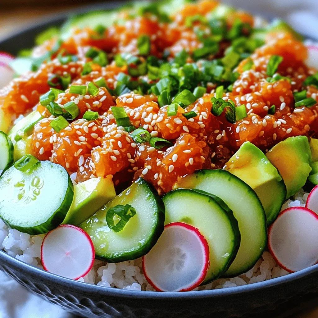 ![- 1 cup sushi rice - 1 ¼ cups water - 1 tablespoon rice vinegar - 1 teaspoon sugar - ½ teaspoon salt - 8 ounces sushi-grade tuna, diced - 2 tablespoons mayonnaise (preferably Kewpie) - 1 tablespoon sriracha (adjust for spice level) To make a great spicy tuna sushi bowl, you need sushi rice and sushi-grade tuna. The rice is the base of the dish. You cook it with water until it’s fluffy. Season it with rice vinegar, sugar, and salt for that perfect taste. The tuna is the star. Make sure it’s sushi-grade for safety and flavor. - 1 avocado, sliced - 1 small cucumber, thinly sliced - 1 radish, thinly sliced - 2 tablespoons sesame seeds - 2 green onions, chopped - Seaweed sheets, cut into strips (for garnish) Toppings add color and flavor. Avocado gives creaminess. Cucumber and radish add crunch. Sesame seeds and green onions bring extra taste. Seaweed strips are perfect for garnish. They also add a unique texture and flavor. - Soy sauce - Sriracha mayonnaise Condiments are key to flavor. Soy sauce adds umami and saltiness. Sriracha mayonnaise gives creaminess and spice. You can adjust the amount of sriracha to control heat. For the full recipe, make sure to follow the steps carefully. - Rinsing the rice: Start by rinsing 1 cup of sushi rice under cold water. Keep rinsing until the water runs clear. This step helps remove extra starch and makes the rice less sticky. - Cooking the rice: In a medium saucepan, add the rinsed rice and 1 ¼ cups of water. Bring it to a boil. Then, reduce the heat to low, cover it, and cook for 18-20 minutes. The rice will be ready when all the water is absorbed. - Mixing vinegar, sugar, and salt: After cooking, let the rice sit covered for 10 minutes. In a small bowl, combine 1 tablespoon of rice vinegar, 1 teaspoon of sugar, and ½ teaspoon of salt. Heat this mixture slightly to dissolve the sugar and salt. - Fluffing and cooling the rice: Use a fork to fluff the rice gently. Pour the vinegar mixture over the rice and mix well. Let it cool to room temperature. - Combining tuna with sauces: In a medium bowl, take 8 ounces of diced sushi-grade tuna. Add 2 tablespoons of mayonnaise and 1 tablespoon of sriracha. Mix everything until the tuna is well coated. - Adjusting spice levels: You can add more sriracha if you like it spicier. Taste as you go to find your perfect heat level. - Dividing rice into bowls: Take the seasoned sushi rice and divide it into four bowls. This base will hold all the tasty toppings. - Adding toppings: On top of the rice, add the spicy tuna mixture. Then, layer sliced avocado, thin cucumber slices, and radish. - Final touches with sesame seeds: Sprinkle 2 tablespoons of sesame seeds and some chopped green onions on each bowl. This adds flavor and crunch. - Serving recommendations: Serve with strips of seaweed for an extra bite. Put soy sauce on the side for dipping. Enjoy your delicious spicy tuna sushi bowls! For a full recipe, check the details above. Cooking sushi rice requires care. Start by rinsing the rice well. This removes extra starch. Use cold water until it runs clear. This step prevents clumping. After rinsing, cook the rice with the right water ratio. For one cup of rice, use one and a quarter cups of water. Bring it to a boil, then reduce the heat. Cover and cook for 18 to 20 minutes. Common mistakes include using too much water or lifting the lid while cooking. Avoid this to keep the rice fluffy. Sriracha brings heat to the dish. You can adjust the amount based on your taste. If you want more heat, add more sriracha. If you prefer less, use less. You can also try other condiments. Chili garlic sauce or spicy mayo are good alternatives. They add a unique kick. Experiment to find what you love best. Add extra flavor to your sushi bowl. Consider toppings like pickled ginger or wasabi for zing. Fresh herbs like cilantro can brighten the dish. For a crunch, try adding crispy onions or tempura flakes. Presentation is key, too. Use colorful toppings to make your bowl pop. Arrange avocado and cucumber nicely for an eye-catching look. A well-presented bowl makes the meal even more enjoyable. For the full recipe, check the main section. {{image_2}} You can switch up the protein in your sushi bowl. Salmon is a great choice. It has a rich taste and pairs well with the same flavors. If you want a plant-based option, try tofu. Firm tofu can soak up the flavors well. Just marinate it like you would the tuna. This works well for vegetarian and vegan diets. Not a fan of sushi rice? You can use quinoa or brown rice instead. They add a unique taste and texture. For toppings, feel free to mix and match. Use seasonal vegetables like bell peppers or radishes. You can also add fruits like mango or pineapple for a sweet twist. Don't stop at the basics! Consider adding extra toppings like pickled ginger or edamame. These add color and flavor. You can also try different sauces. A drizzle of ponzu or spicy mayo can elevate the dish. Experiment with what you like best for a personal touch. For the full recipe, check out [Full Recipe]. Store your leftover rice and tuna in separate containers. Keep the rice in an airtight container. It stays fresh for about three days in the fridge. For the tuna, place it in a sealed container, too. Use leftover tuna within two days for the best taste. To reheat sushi rice, add a splash of water and cover it. Microwave it for 30 seconds. Stir and heat again if needed. For tuna, do not microwave. Instead, let it sit at room temperature for 15 minutes. This keeps the texture nice. Yes, you can freeze portions of the rice and tuna. However, rice can lose its texture when thawed. If you freeze tuna, use it within a month. Wrap it tightly in plastic wrap, then place it in a freezer bag. For meal prep, make sure to label your bags with dates. The best sushi-grade tuna is bright red or deep pink. Look for fresh, firm flesh. It should have a clean smell, not fishy. The belly cut, called toro, is the most tender. When buying