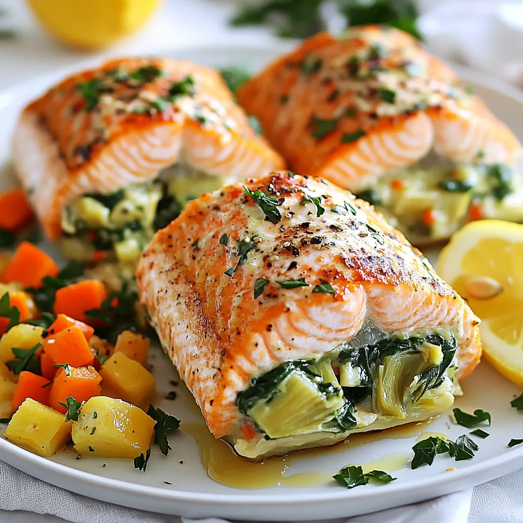 - 4 salmon fillets, skinless - 1 cup fresh spinach, chopped - 1 cup canned artichoke hearts, drained and chopped - 1/2 cup cream cheese, softened - 1/4 cup grated Parmesan cheese - 1/4 cup shredded mozzarella cheese - 2 cloves garlic, minced - 1 tablespoon lemon juice - 1/2 teaspoon dried oregano - Salt and pepper to taste - Olive oil for drizzling To make spinach artichoke stuffed salmon, you need fresh and tasty ingredients. The main star is the salmon, which is rich in omega-3 fatty acids. You want skinless salmon fillets for easy stuffing. Next, fresh spinach adds color and nutrients. Canned artichoke hearts bring a unique flavor. Cream cheese makes the filling creamy, while Parmesan and mozzarella give it a cheesy kick. Garlic adds a lovely aroma, and lemon juice brightens the taste. Dried oregano gives the dish an herbal note. Don’t forget salt and pepper for seasoning. Finally, a drizzle of olive oil helps everything cook nicely. Gather all these ingredients before you start cooking. You’ll see how easy and fun it is to make this dish. Each bite will be packed with flavor! {{ingredient_image_1}} 1. Preheat the oven: Set your oven to 375°F (190°C). This helps cook the salmon evenly. 2. Prepare the spinach-artichoke mixture: In a large bowl, mix together: - 1 cup fresh spinach, chopped - 1 cup canned artichoke hearts, drained and chopped - 1/2 cup cream cheese, softened - 1/4 cup grated Parmesan cheese - 1/4 cup shredded mozzarella cheese - 2 cloves garlic, minced - 1 tablespoon lemon juice - 1/2 teaspoon dried oregano - Salt and pepper to taste Make sure to blend everything well. This mixture adds a rich flavor to the salmon. 3. Prepare the salmon fillets: Take your 4 skinless salmon fillets and lay them on a parchment-lined baking tray. Use a sharp knife to create a pocket in each fillet. Cut lengthwise, but do not slice all the way through. This pocket will hold the tasty filling. 1. Stuff the salmon fillets: Fill each pocket with the spinach-artichoke mixture. Press the edges gently. This keeps the filling inside while cooking. 2. Drizzle and season the salmon: Pour a little olive oil over each stuffed fillet. Then, season the outside with salt and pepper. This adds taste and helps the salmon brown. 3. Bake and optional broil: Place the tray in the oven. Bake for 20-25 minutes. The salmon should flake easily with a fork. If you want a golden top, broil the salmon for the last 2-3 minutes. Watch it closely to avoid burning. Enjoy your flavorful, stuffed salmon! To make a great filling, focus on the texture. You want it creamy but not too runny. Mix the cream cheese well with the spinach and artichoke. This helps hold the filling together. Use fresh spinach for a bright flavor. If you want a chunkier mix, chop the artichokes less finely. Balancing flavors is key. Add enough salt and pepper to enhance the taste. The lemon juice adds a nice brightness, so don’t skip it. I like to taste the filling before stuffing the salmon. This way, you can adjust the seasoning. A little extra garlic can also add depth. To check for doneness, look for the salmon to flake easily with a fork. The internal temperature should reach 145°F (63°C). If your fillets are thicker, you may need to bake them a bit longer. Keep an eye on them to avoid overcooking. If your salmon is thinner, reduce the cooking time. Start checking at 15 minutes if they are about an inch thick. Oven temperatures can vary, so adjust as needed. For a crispy top, broil for the last 2-3 minutes. Just watch it closely to prevent burning. Pro Tips Fresh Ingredients: Use fresh spinach and artichoke hearts for the best flavor and texture. Canned or frozen options might work, but fresh provides a vibrant taste. Perfectly Cooked Salmon: Keep an eye on the cooking time. Salmon is perfectly cooked when it flakes easily with a fork. Overcooking can make it dry. Experiment with Cheeses: Feel free to experiment with different types of cheese for stuffing. Feta or goat cheese can add a unique twist to the flavor profile. Serve with Sides: Pair the stuffed salmon with a fresh salad or roasted vegetables for a complete meal that balances flavors and textures. {{image_2}} You can switch up the cheese for new flavors. Try feta cheese for a tangy kick. Goat cheese adds creaminess and depth. Even cheddar works well if you like a sharper taste. Adding herbs can enhance the dish. Fresh basil or parsley gives a bright taste. You can also try dill for a fresh, herby flavor. A pinch of red pepper flakes adds a nice heat. Pair your stuffed salmon with tasty sides. Roasted asparagus or sautéed green beans make a great match. A light salad with mixed greens and a lemon vinaigrette complements the salmon well. For sauces, a simple garlic butter sauce adds richness. Tzatziki sauce brings a cool, refreshing touch. You can also serve it with a squeeze of fresh lemon for extra brightness. To keep your spinach artichoke stuffed salmon fresh, follow these tips: - Refrigerating leftovers: Place any leftover stuffed salmon in an airtight container. This keeps the flavors intact. Store it in the fridge for up to three days. If you want to eat it later, cool it first before sealing. - Freezing stuffed salmon: You can freeze this dish for up to three months. Wrap the stuffed salmon tightly in plastic wrap, then place it in a freezer bag. Remove as much air as possible. Label the bag with the date for easy tracking. When it’s time to enjoy your salmon again, use these methods: - Best methods for reheating: The oven is the best choice for reheating stuffed salmon. Preheat the oven to 350°F (175°C). Place the salmon in a baking dish and cover it with foil. Heat for about 15-20 minutes. This keeps it warm and tender. - Tips to retain moisture: To keep your salmon moist, add a splash of broth or water to the baking dish before reheating. Covering it with foil helps trap steam, which keeps it juicy. Can I use frozen salmon? Yes, you can use frozen salmon for thi