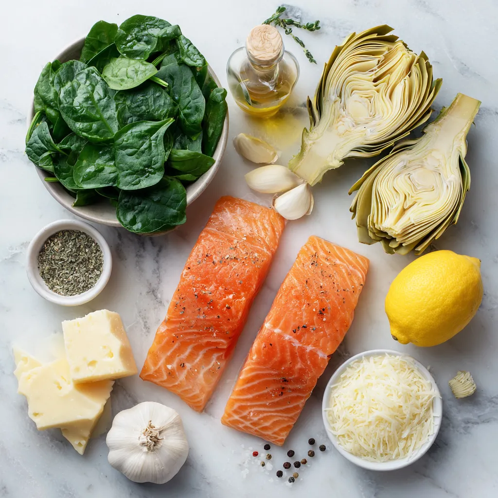 To make spinach artichoke stuffed salmon, you need fresh and tasty ingredients. The main star is the salmon, which is rich in omega-3 fatty acids. You want skinless salmon fillets for easy stuffing. Next, fresh spinach adds color and nutrients. Canned artichoke hearts bring a unique flavor. Cream cheese makes the filling creamy, while Parmesan and mozzarella give it a cheesy kick.
