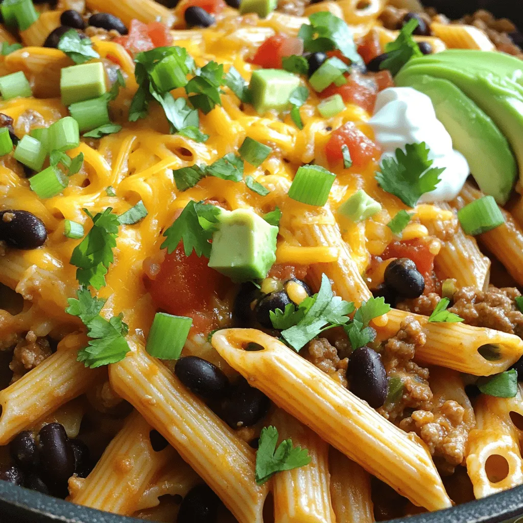 ![- 8 oz pasta (penne or rotini) - 1 lb ground beef or turkey - 1 packet taco seasoning - 1 can (15 oz) black beans, rinsed and drained - 1 can (15 oz) diced tomatoes with green chilies - 1 cup corn (fresh or frozen) - 1 cup shredded cheddar cheese - Salt and pepper to taste - Avocado and sour cream for topping (optional) When I make Taco Pasta Skillet, I focus on simple yet tasty ingredients. The main ingredients are crucial for flavor. You need 8 oz of pasta, like penne or rotini. I prefer these shapes as they hold sauce well. Choose 1 lb of ground beef or turkey. Both options work great, but turkey is leaner. For spices, grab a packet of taco seasoning. This mix brings that classic taco flavor to the dish. Beyond the basics, I add extra ingredients for texture and taste. One can of black beans (15 oz) adds protein and fiber. Rinse and drain them first. I also use a can of diced tomatoes with green chilies (15 oz). This adds a nice kick and juiciness. Lastly, use 1 cup of corn, either fresh or frozen. Corn adds sweetness and color. Toppings make the dish even better. I like to sprinkle 1 cup of shredded cheddar cheese on top. It melts nicely and adds creaminess. Season with salt and pepper to taste. For a fun twist, you can add avocado slices and a dollop of sour cream on top. These add rich flavors and coolness to balance the spices. For the full recipe, check out the details on how to combine these ingredients for a quick and savory meal. - First, heat 1 tablespoon of olive oil in a large skillet over medium heat. - Once hot, add 1 pound of ground beef or turkey. Cook it for about 5-7 minutes. - Break the meat apart as it cooks. It should brown nicely. - Now, sprinkle in 1 packet of taco seasoning. Stir and cook until you smell the spices, about 1-2 minutes. - Next, add 8 oz of pasta, 2 cups of chicken or vegetable broth, 1 can of diced tomatoes, 1 can of black beans, and 1 cup of corn. - Stir everything well to combine. Make sure the pasta is covered in liquid. - Bring the mixture to a boil. Once boiling, reduce the heat to low. - Cover the skillet and let it simmer for 12-15 minutes. The pasta should be cooked al dente. - After that, remove the skillet from heat. Sprinkle 1 cup of shredded cheddar cheese on top. - Cover again for a few minutes to let the cheese melt. - Fluff the pasta with a fork, then season with salt and pepper to taste. This method will give you a delicious and hearty Taco Pasta Skillet. For the full recipe, check out the previous section. How to perfectly brown ground meat Begin by using a large skillet. Heat olive oil over medium heat. Add your ground beef or turkey. Break it apart as it cooks. Stir it every few minutes. This helps the meat cook evenly. Cook until it is brown, which should take about 5-7 minutes. Achieving the right pasta consistency Use penne or rotini pasta for best results. Once you add the pasta to the skillet, let it simmer in the broth. This helps the pasta absorb flavor. Check the pasta after 12 minutes. It should be al dente, firm but not hard. Recommended skillet types for even cooking A non-stick or cast-iron skillet works best. These types of pans allow for easy cleanup. They also help prevent sticking. Make sure your skillet is large enough to hold all your ingredients. How to avoid mushy pasta Do not overcook the pasta. Keep an eye on the cooking time. Add enough liquid, but don’t drown the pasta. Stir the mixture occasionally to prevent sticking. If you see extra liquid, remove the lid to let it evaporate. Garnishing suggestions for serving Top your Taco Pasta Skillet with fresh ingredients. Chopped green onions and cilantro are great choices. If you like creaminess, add avocado slices. A dollop of sour cream adds richness. Creating a colorful plate with toppings Use a mix of toppings for a vibrant look. Bright green cilantro and green onions pop against the cheese. Add a sprinkle of red chili flakes for color and heat. A colorful plate makes your meal more fun and inviting. {{image_2}} You can change the meat in Taco Pasta Skillet. Ground chicken or turkey work well. For a meatless option, try plant-based protein. This keeps the dish light while still tasty. You can also switch the beans. Black beans are great, but kidney beans or pinto beans add a nice twist. Different pasta shapes can change the plate too. While penne or rotini are great choices, shell pasta or even spaghetti can work. The shape can change how the sauce clings to the pasta, adding to the flavor. To make your dish pop, add extra spices. Cumin brings warmth, while smoked paprika gives a nice smoky taste. You can also toss in some garlic powder or onion powder for more depth. Adding vegetables makes this dish even better. Bell peppers add sweetness and crunch. Zucchini is another good choice, adding moisture and texture. You can mix in any veggies you love, making it colorful and healthy. Pair your Taco Pasta Skillet with a fresh salad. A simple green salad with a light dressing works well. You can also serve it with tortilla chips for some crunch. If you want to turn it into a casserole, pour it into a baking dish. Sprinkle extra cheese on top and bake until bubbly. This adds a fun twist and is perfect for sharing at gatherings. For the full recipe, check out the detailed instructions above! To keep your Taco Pasta Skillet fresh, place leftovers in an airtight container. This helps retain moisture and flavor. Store it in the fridge for up to three days. Always check for any changes in smell or texture before eating. You can freeze Taco Pasta Skillet for later use. First, let it cool completely. Then, transfer it to freezer-safe containers. Seal tightly to prevent freezer burn. It will last up to three months in the freezer. To eat, thaw it in the fridge overnight. Reheat it on the stove over low heat until warmed through. Stir occasionally to ensure even heating. If you want to make cooking easier, prep ingredients ahead of time. Chop onions and cilantro, and 