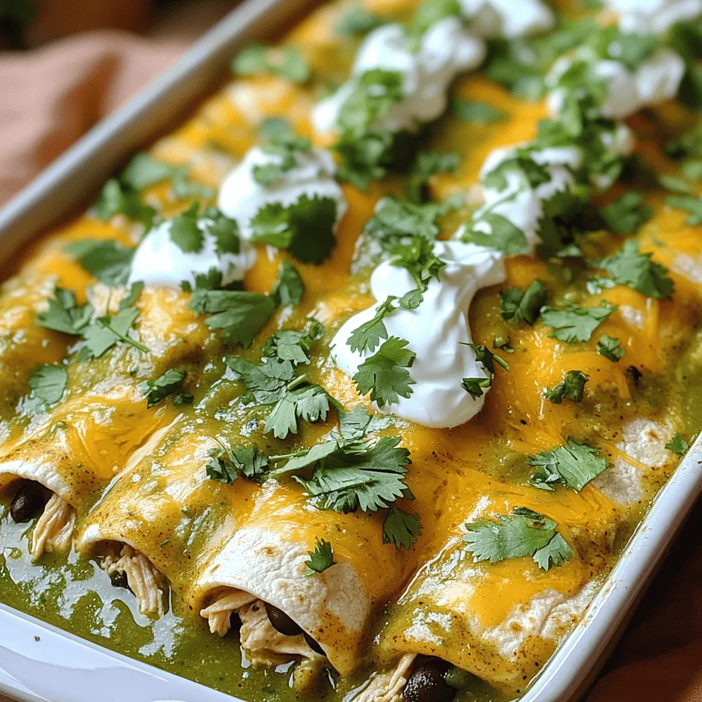 To create these tasty salsa verde chicken enchiladas, gather your ingredients. You need shredded chicken, salsa verde, and black beans. Monterey Jack cheese adds a creamy touch. Don’t forget the corn tortillas, sour cream, and fresh cilantro for garnish. Cumin and garlic powder give a nice flavor boost. Use salt and pepper to taste. Finally, have some olive oil ready for cooking.