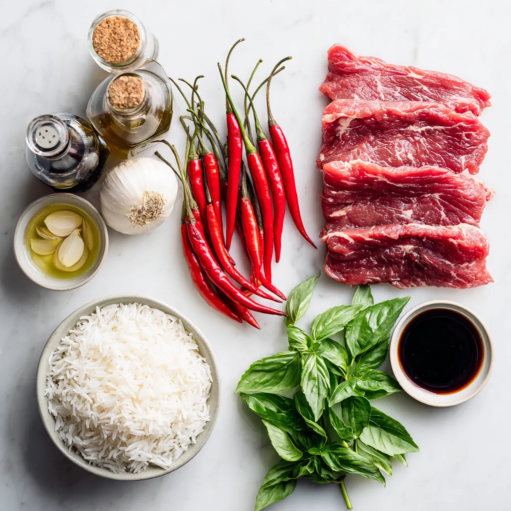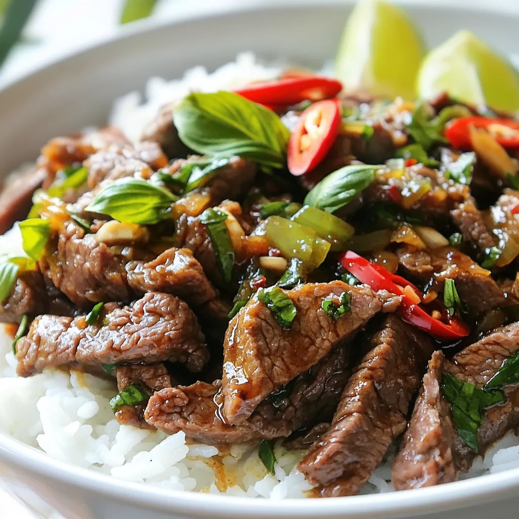 - 1 lb (450g) sirloin or flank steak, thinly sliced against the grain - 4 cloves garlic, minced - 2 shallots, thinly sliced - 2 Thai bird's eye chilies, finely sliced (or to taste) - 1 cup fresh Thai basil leaves - 2 tablespoons vegetable oil - 2 tablespoons soy sauce - 1 tablespoon oyster sauce - 1 tablespoon fish sauce - 1 tablespoon sugar - Cooked jasmine rice - Lime wedges for garnish {{ingredient_image_1}} Start by getting your steak ready. I like to freeze the beef for about 30 minutes. This makes it easier to slice. Use a sharp knife and cut against the grain. Aim for thin, bite-sized pieces. This way, the beef cooks evenly and stays tender. Next, mix the sauces for extra flavor. In a small bowl, combine soy sauce, oyster sauce, fish sauce, and sugar. Set this sauce aside. Now, heat vegetable oil in a large skillet or wok. Turn the heat to medium-high until the oil shimmers. Add minced garlic, sliced shallots, and chopped chilies to the hot oil. Stir-fry these for about 30 seconds. You want to smell the amazing aroma! Now it’s time to add the beef. Turn the heat up to high. Quickly add your sliced beef to the skillet. Stir-fry for about 2-3 minutes. Cook until the beef is just browned. Pour the sauce mix over the beef and stir well. Cook for an additional minute. This lets all the flavors meld together. Finally, remove the skillet from the heat. Add fresh Thai basil leaves to the beef. Toss gently until the basil wilts. Serve the tasty Thai basil beef over jasmine rice. Enjoy every bite! To get the best texture in your Thai basil beef, slice the meat correctly. Use sirloin or flank steak for great flavor. Freeze the steak for about 30 minutes. This makes it firm and easier to cut. Always slice against the grain. This helps the meat stay tender. Aim for thin slices, around 1/4 inch thick. This way, the beef cooks quickly and evenly. If you like it spicy, use more bird's eye chilies. Start with two, then taste the dish. You can add more if you want extra heat. For a milder dish, remove the seeds from the chilies. This reduces the spice without losing flavor. The sauce mix has soy sauce, oyster sauce, and fish sauce. Feel free to tweak these to match your taste. Add a bit more sugar if you like a sweeter dish. When serving Thai basil beef, make it look great! Start with a bed of jasmine rice. Spoon the beef mixture over the rice. For a pop of color, add extra Thai basil leaves on top. You can also place lime wedges on the side. This adds zest and freshness to each bite. A beautiful plate makes the meal more enjoyable. Enjoy your tasty creation! Pro Tips Use Fresh Ingredients: Fresh Thai basil makes a significant difference in flavor; try to source it from an Asian grocery store for the best taste. Control the Heat: Adjust the number of bird's eye chilies based on your spice tolerance to customize the dish to your liking. Quick Cooking: Ensure your skillet or wok is very hot before adding the beef; this helps to achieve a nice sear without overcooking. Let it Rest: After cooking, let the dish sit for a minute before serving to allow the flavors to develop further. {{image_2}} You can easily make a vegetarian version of Thai basil beef. Start with tofu or tempeh. Both soak up flavors well. Slice them into bite-sized pieces. Use the same sauce mix from the original recipe. Stir-fry the tofu or tempeh like you would the beef. Add fresh Thai basil at the end. You can also try seitan for a meaty texture. Feel free to switch out the beef for other proteins. Chicken or pork works well with this sauce. Thinly slice chicken breast or pork tenderloin. Follow the same cooking steps. Shrimp is another great option. It cooks quickly and adds a nice taste. Just be careful not to overcook the shrimp. Customize your dish with extra veggies for nutrition. Bell peppers, carrots, or snap peas add color and crunch. Slice them thin, so they cook fast. Add these veggies after the aromatics. Stir-fry for a couple of minutes before adding the meat. You can also toss in some baby corn or mushrooms for more flavor. After enjoying your Thai basil beef, let it cool first. Place leftovers in an airtight container. This helps keep the flavors fresh. Store the container in the fridge. Use the leftovers within 3 days for best taste. To reheat, use a skillet over medium heat. Add a splash of water or oil to keep it moist. Stir often for even heating. You can also use the microwave. Heat in short bursts of 30 seconds. Stir in between until hot. If you want to save some for later, freezing works well. Let the beef cool completely. Place it in a freezer-safe bag or container. Remove as much air as possible before sealing. It can last up to 2 months in the freezer. When ready to eat, thaw it in the fridge overnight. Reheat as described above for best results. For Thai Basil Beef, I recommend using sirloin or flank steak. Both cuts are tender and juicy. They slice well when cut against the grain. This makes them perfect for stir-frying. Thin slices cook quickly and keep their flavor. You can use dried basil, but fresh is best. Fresh Thai basil adds a bright flavor. It also gives a nice aroma. If you must use dried, use less. A teaspoon of dried basil can work in a pinch. Thai Basil Beef comes from Thailand. It is a popular street food dish. Chefs use fresh Thai basil and chili for flavor. This dish highlights the balance of sweet, salty, and spicy. It reflects the rich culture of Thai cooking. Serve Thai Basil Beef with jasmine rice. The rice soaks up the sauce and balances the meal. You can also add a fresh salad. A cucumber salad with lime is a great choice. It adds a crunchy texture and freshness. Thai Basil Beef is quick and easy to make. We explored key ingredients, sauces, and sides. I shared step-by-step cooking instructions to ensure success. Tips on slicing and spice levels improve your dish. Plus, you learned about tasty variations and storage methods. Try these ideas to make your meal special. Enjoy experimen