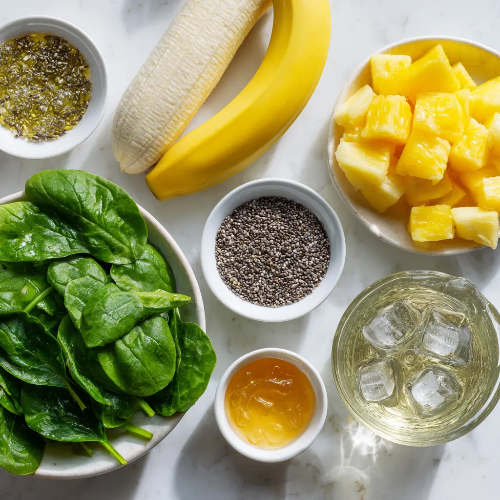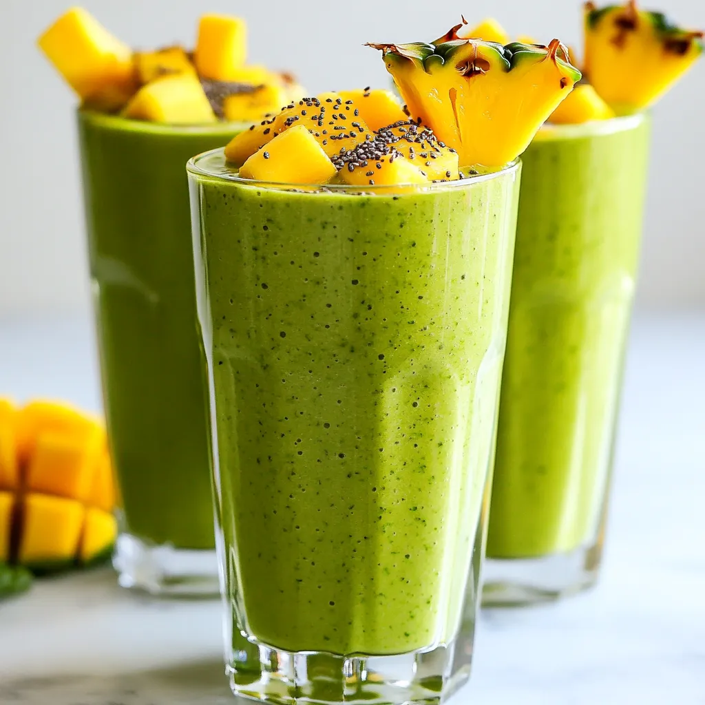 - 1 cup fresh spinach - 1 ripe banana - 1/2 cup diced mango - 1/2 cup pineapple chunks - 1 cup coconut water - Regular water alternative - 1 tablespoon chia seeds - 1 tablespoon honey or agave syrup - Ice cubes For the Tropical Green Smoothie, fresh produce is key. Spinach packs a punch of vitamins. It blends well and adds a rich color. You need a ripe banana for sweetness and creaminess. Diced mango and pineapple bring that tropical flair. Next, let’s talk about liquids. Coconut water gives your smoothie a refreshing taste. It hydrates and adds a hint of sweetness. If you prefer, regular water works just fine too. You can also make it special with optional additions. Chia seeds add healthy omega-3s and fiber. Honey or agave syrup sweetens it more if you like. Ice cubes can make your drink extra cold and refreshing. Gather these ingredients, and you’re ready to make a delicious Tropical Green Smoothie! {{ingredient_image_1}} 1. Start with fresh spinach. Wash it well to get rid of dirt. 2. Next, take your banana. Peel it and slice it into pieces. 3. For the mango, if you have fresh fruit, peel and dice it. If not, frozen works too! 4. Finally, cut the pineapple into chunks. Fresh is best, but you can use frozen. 1. In your blender, add the spinach, banana, mango, and pineapple. 2. Toss in the chia seeds for extra nutrition. 3. Pour in one cup of coconut water or regular water. You can adjust this based on how thick you like your smoothie. 4. If you want a sweeter taste, add honey or agave syrup here. 1. Add a handful of ice cubes to make it cold and refreshing. 2. Blend everything on high until it is smooth and creamy. 3. If it's not sweet enough, taste it and add more sweetener if you want. 4. Blend again for a few seconds to mix it well. 5. Pour the smoothie into bright glasses for a fun presentation. Enjoy your Tropical Green Smoothie! To make your smoothie just right, pay attention to the texture. If it feels too thick, add more liquid. Coconut water gives a nice flavor, but regular water works too. If you like it chilled, toss in a handful of ice cubes. This adds a refreshing touch that makes it perfect for hot days. When blending, it is key to scrape down the sides. This helps mix all the ingredients well. Start your blender on low speed, then switch to high. This way, all fruits and greens blend evenly. If you have a high-power blender, it can handle tough greens like spinach easily. A smoothie is not just about taste; it should look good too. Garnish your drink with a slice of fresh fruit. A mango or pineapple slice adds a nice touch. Serve it in bright glasses to make it pop. This makes your drink fun and inviting, perfect for sharing! Pro Tips Ripeness Matters: Choose ripe bananas and mangoes for optimal sweetness and creaminess in your smoothie. Chill Factor: For a colder smoothie, use frozen pineapple and mango instead of fresh, or add more ice cubes. Boost Nutrition: Add a scoop of protein powder or a tablespoon of nut butter for an extra boost of nutrition. Layering Flavors: Try adding a squeeze of lime juice to enhance the tropical flavors in your smoothie. {{image_2}} You can switch up the greens in your Tropical Green Smoothie. Try using kale instead of spinach. Kale adds a nice, earthy flavor and packs extra nutrients. You can also add leafy greens like Swiss chard. This green has a mild taste and can blend well with fruits. Fruits are fun to mix and match. Instead of mango or pineapple, use other tropical fruits. Papaya or passion fruit can add new flavors. You can also experiment with berries like strawberries or blueberries. Seasonal fruits can make your smoothie fresh and exciting. If you want to change the sweetness, try natural options. Maple syrup or stevia can give a sweet touch without extra calories. If you prefer a low-sugar drink, skip the sweeteners altogether. Your smoothie will still taste great with all the fruit flavors. To keep your Tropical Green Smoothie fresh, store any leftovers in the refrigerator. Use a glass container for the best results. Glass helps keep the smoothie cold and does not affect the taste. If you use plastic, make sure it is BPA-free. You can freeze smoothie portions for later. Pour the smoothie into ice cube trays or freezer bags. This way, you can grab just what you need. When you're ready to enjoy it, thaw the smoothie in the fridge overnight. You can also blend it straight from the freezer for a thicker texture. Your smoothie will stay fresh for about 24 hours in the fridge. After that, it can lose flavor and nutrients. Watch for signs that it has gone bad, such as an off smell or unusual texture. If it separates, just stir it well before drinking. A Tropical Green Smoothie is packed with nutrients. Here are some key benefits: - Spinach: Full of vitamins A, C, and K. It helps with eye health and skin. - Banana: Provides potassium and fiber. It helps with heart health and digestion. - Mango: Rich in vitamin C. It boosts your immune system and skin health. - Pineapple: Contains bromelain, which aids digestion. It also has anti-inflammatory properties. - Chia seeds: A great source of omega-3 fatty acids. They support heart health and provide energy. - Coconut water: Hydrates and replenishes electrolytes. It keeps you refreshed and energized. Together, these ingredients create a smoothie that not only tastes great but also fuels your body. Yes, you can prep this smoothie in advance. Here are some tips: - Pre-cut fruits: Chop the banana, mango, and pineapple ahead of time. Store them in airtight bags. - Spinach: Wash and dry the spinach. Keep it in a container in the fridge. - Blend and store: Blend the smoothie and store it in a mason jar. It stays fresh for 1-2 days. - Shake before serving: Give it a good shake before you drink it. This mixes up any settled ingredients. These steps save you time and make healthy eating easy. A good blender makes a big difference. Here are some features to look for: - Powerful motor: A motor wi