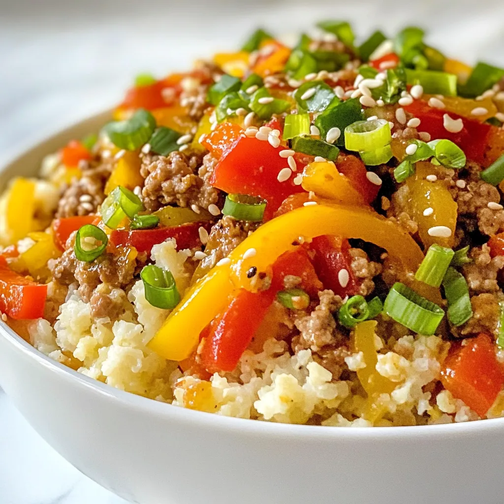 A healthy and delicious bowl featuring ground turkey and riced cauliflower, perfect for a quick meal.