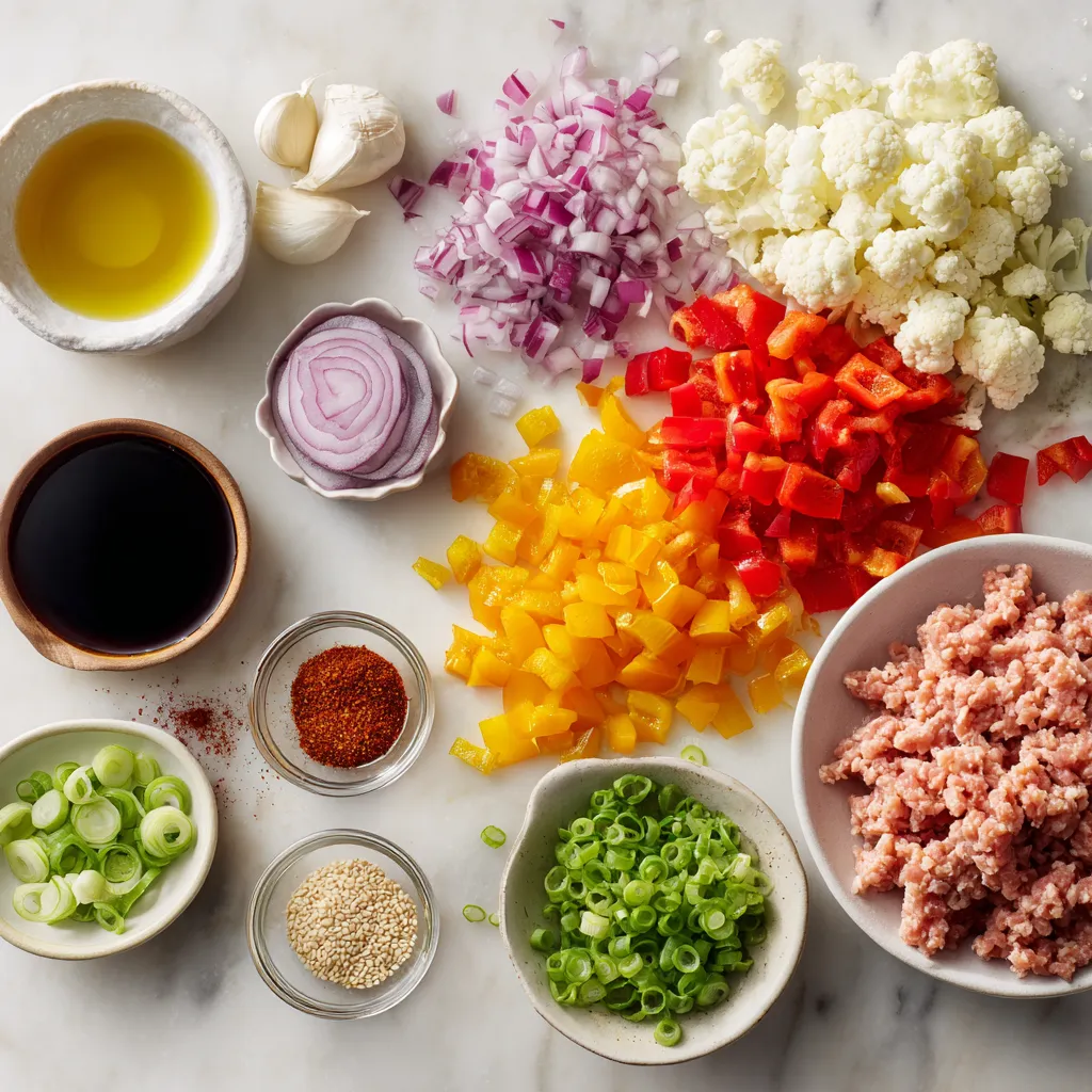 The turkey cauliflower rice bowl is full of flavor and nutrition. First, you need ground turkey. It adds protein and keeps the dish hearty. Then, riced cauliflower is a great low-carb base. It gives you that nice, fluffy texture.