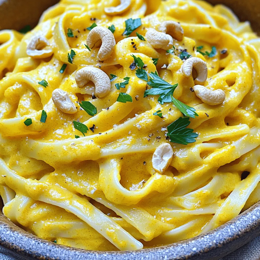 To make a smooth sauce, I use soaked cashews. Soaking them for four hours makes them soft. This step helps create a creamy base without dairy. When you blend the soaked cashews, mix them with pumpkin puree and almond milk. A high-speed blender works best. If your sauce seems thick, add more almond milk. Blend until it’s silky and thick.