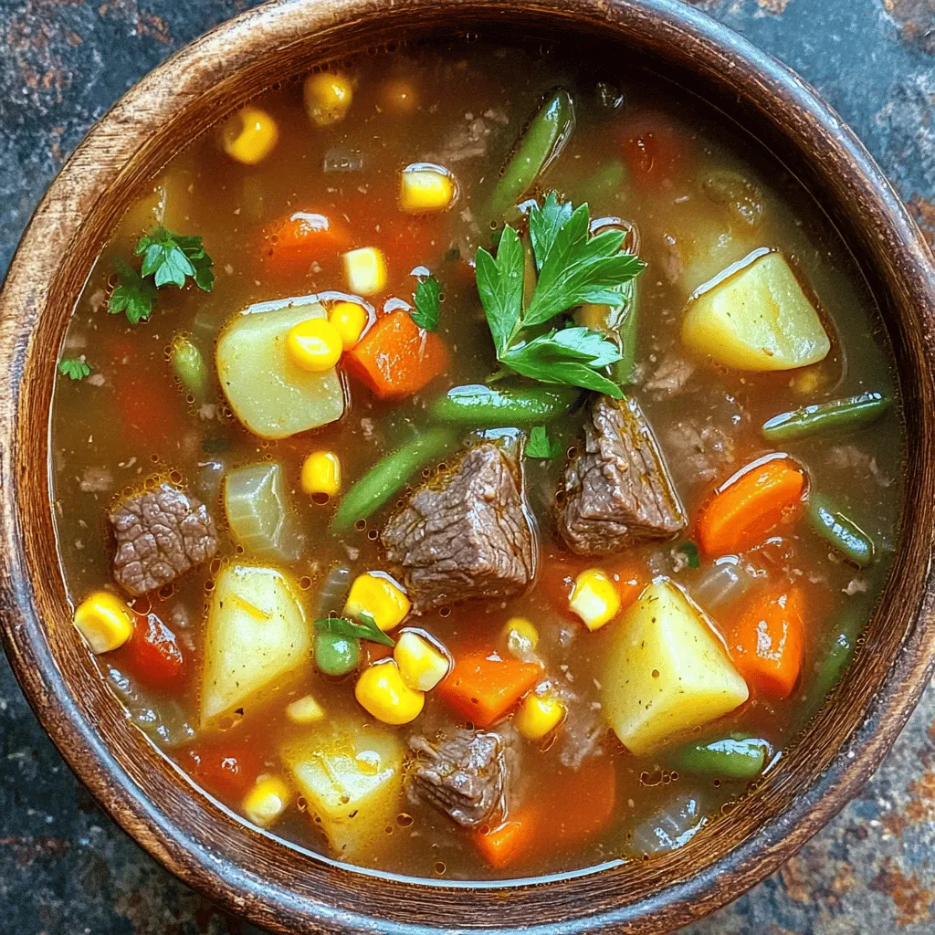 - Beef and Broth - 1 pound lean beef stew meat, cut into cubes - 4 cups low-sodium beef broth - Vegetables - 2 cups diced carrots - 2 cups peeled and cubed potatoes - 1 cup trimmed green beans, cut into 1-inch pieces - 1 cup corn kernels (fresh, frozen, or canned) - 1 cup diced tomatoes (canned or fresh) - 1 medium chopped onion - 3 cloves minced garlic - Seasonings and Extras - 2 tablespoons tomato paste - 1 teaspoon dried thyme - 1 teaspoon dried rosemary - 1 teaspoon paprika - Salt and pepper to taste - 1 tablespoon olive oil - Fresh parsley for garnish (optional) When you gather these ingredients, you set the stage for a warm, hearty meal. Each element plays a role in the soup's rich flavor. The beef stew meat provides a savory base, while the broth brings depth. The mix of vegetables adds color and nutrition. With the right seasonings, you’ll create a comforting bowl of goodness. This recipe is flexible. Feel free to swap vegetables based on what you have. You can also adjust the seasonings to match your taste. Enjoy the process of making this soup; it’s all about bringing warmth to your kitchen! Start with one pound of lean beef stew meat. Cut it into small cubes. Season the beef with salt and pepper. Heat one tablespoon of olive oil in a skillet over medium heat. Add the beef to the skillet. Brown the meat on all sides for about five to seven minutes. This step helps seal in the juices and adds flavor. Once browned, transfer the beef to the slow cooker. In the same skillet, add one chopped medium onion and three minced garlic cloves. Sauté these until the onion turns translucent. This should take about three to four minutes. The aroma will fill your kitchen! Once ready, move the sautéed onion and garlic to the slow cooker with the beef. Now it’s time to add the vegetables! Dice two cups of carrots and peel, then cube two cups of potatoes. Trim and cut one cup of green beans into one-inch pieces. You can also use one cup of corn kernels, fresh, frozen, or canned. Don't forget one cup of diced tomatoes, either canned or fresh. Add all these to your slow cooker. Stir in two tablespoons of tomato paste, one teaspoon each of dried thyme, dried rosemary, and paprika. Finally, pour in four cups of low-sodium beef broth. Mix everything well to combine. Cover the slow cooker with its lid. Cook on low for six to eight hours or on high for three to four hours. Check the soup when the time is up. The beef should be tender, and the vegetables cooked through. Taste and adjust seasoning with more salt and pepper if needed. Your warm, hearty vegetable beef soup is ready to enjoy! To boost the flavor of your soup, use fresh herbs. Fresh parsley adds a bright touch. You can also add a splash of Worcestershire sauce for depth. A squeeze of lemon juice brightens flavors too. Don’t skip the salt; it brings everything together. Taste as you go to find that perfect balance. Tender beef makes the soup rich and warm. Start by browning your meat well; this adds great flavor. Cook it in the slow cooker on low for a long time. This method breaks down tough fibers and keeps it juicy. You can also use a lean cut for health benefits. If your soup is too thick, add more broth. A little water works too. For a thicker soup, mash some potatoes in the pot. This adds creaminess without extra calories. Stir well to mix everything evenly. Always check before serving to get your desired texture. {{image_2}} You can mix up the veggies in your soup. Use what you like or have on hand. Zucchini, bell peppers, or peas work great. Just remember, softer veggies like zucchini need less time to cook. Add them in the last hour of cooking. This way, they stay bright and fresh. While beef is the star of this soup, feel free to swap it out. Chicken or turkey can be tasty options too. Just cut the meat into small pieces. If you use ground meat, brown it first to build flavor. Adjust the cooking time for smaller pieces. They will cook faster than beef. If you crave some heat, spice it up! Add red pepper flakes or diced jalapeños. Stir them in with the veggies. You can also use spicy sausage for a kick. Just remember, start with a small amount. You can always add more if you want extra heat later. After you enjoy your hearty vegetable beef soup, let it cool down. Use an airtight container to store the leftovers. Place the soup in the fridge. It can last for about 3 to 4 days. Make sure to label the container with the date. This is a simple way to keep track of how fresh it is. If you want to save soup for later, freezing is a great option. Use freezer-safe containers or bags. Leave some space at the top for expansion. The soup can freeze well for up to 3 months. When you're ready to eat, just thaw it overnight in the fridge. Remember, always freeze the soup before adding any dairy. This keeps it fresh and tasty. Reheating your soup is easy. You can do it on the stove or in the microwave. If using the stove, heat over medium-low until warm. Stir it often to keep it from sticking. In the microwave, use a microwave-safe bowl. Heat in short bursts, stirring in between to ensure even warming. Always check the temperature before serving. Enjoy your warm soup just like the first time! To make this soup vegetarian, you can replace the beef with hearty veggies or beans. Try using mushrooms for a meaty texture or lentils for protein. Use vegetable broth instead of beef broth. You can add more vegetables, like bell peppers or zucchini, for extra flavor. This way, you keep the taste and heartiness of the soup while making it plant-based. Yes, frozen vegetables work great in this soup. They save time and still taste good. Just add them straight to the slow cooker without thawing. Frozen veggies often retain their nutrients and flavor. They make the soup quick to prepare while keeping it healthy and tasty. Vegetable beef soup lasts about 3 to 4 days in the fridge. Be sure to store it in an airtight container to keep it fresh. If you want 
