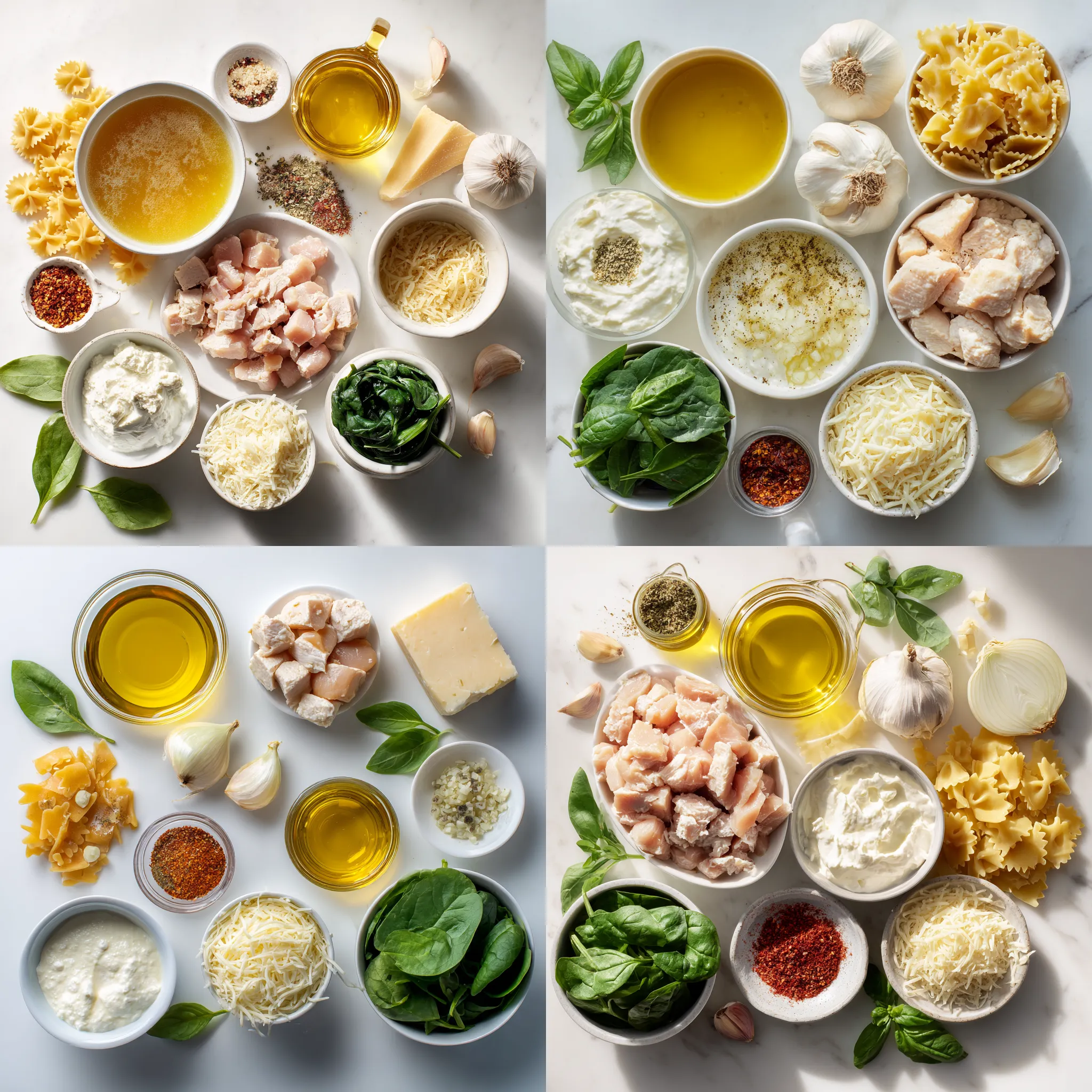 To make this dish, gather all your ingredients. You will need boneless, skinless chicken, olive oil, onion, garlic, chicken broth, lasagna noodles, Italian seasoning, red pepper flakes, ricotta cheese, heavy cream, spinach, mozzarella cheese, Parmesan cheese, salt, pepper, and fresh basil. Prepare your workspace by chopping the chicken, dicing the onion, and mincing the garlic. This makes cooking smooth and quick.