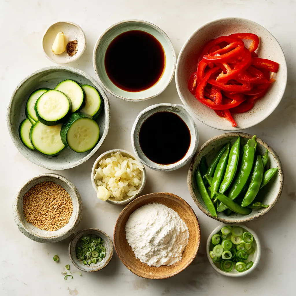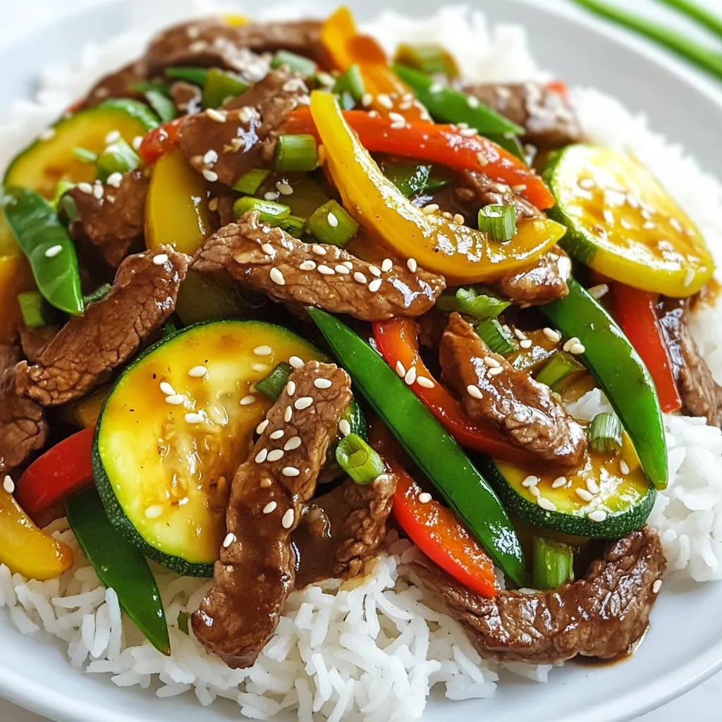 - 1 pound beef sirloin - 2 medium zucchinis - 1 red bell pepper - 1 cup snap peas - Soy sauce - Oyster sauce - Sesame oil - Cornstarch - Sesame seeds - Sliced green onions When I make zucchini beef stir fry, I love using fresh and vibrant ingredients. The beef sirloin adds a rich taste. The zucchinis provide a nice crunch. Red bell peppers bring a sweet flavor. Snap peas add a pop of color and texture. For seasoning, soy sauce and oyster sauce are key. They create a tasty, savory base. Sesame oil adds a nutty finish that brings all the flavors together. I thicken the sauce with cornstarch mixed with water for a silky texture. Finally, I love to garnish my dish with sesame seeds and sliced green onions. They add a beautiful touch. Plus, they boost the flavor and make the dish look special. Gather these ingredients, and you're on your way to a quick and delicious meal! {{ingredient_image_1}} - Marinate the beef Start by slicing 1 pound of beef sirloin thinly. In a bowl, mix the beef with 2 tablespoons of soy sauce and a pinch of black pepper. Let it sit for 15 minutes. This helps the beef soak up flavor. - Prepare vegetables While the beef marinates, wash and slice 2 medium zucchinis into half-moons. Slice 1 red bell pepper and trim 1 cup of snap peas. Have 3 cloves of garlic minced and 1 tablespoon of fresh ginger grated. - Heat the pan Place a large skillet or wok on medium-high heat. Add 1 tablespoon of vegetable oil. Heat until the oil shimmers. This means it’s ready for cooking. - Cook the beef Add the marinated beef to the hot skillet. Stir-fry for about 3-4 minutes. You want it to brown nicely. Once done, remove the beef and set it aside. - Sauté vegetables In the same skillet, add the minced garlic and grated ginger. Sauté for about 30 seconds until you smell the aroma. Then, toss in the zucchini, bell pepper, and snap peas. Stir-fry for 4-5 minutes until the veggies are tender but still crisp. - Combine beef and vegetables Return the cooked beef to the skillet. Pour in the remaining soy sauce and 1 tablespoon of oyster sauce. Stir everything well to mix the flavors. - Thicken the sauce Mix 1 teaspoon of cornstarch with 2 teaspoons of water in a small bowl. Pour this mixture into the stir fry. Cook for another 1-2 minutes, stirring to coat everything evenly. - Serve presentation tips Once done, stir in 1 tablespoon of sesame oil. Taste and adjust with salt and pepper if needed. Serve the stir fry hot over steamed jasmine rice or quinoa. Garnish with sesame seeds and sliced green onions for a lovely touch. - High heat for stir-frying: Use high heat to stir-fry your beef and veggies. This helps them cook fast and stay crisp. It also gives your dish a nice sear. - Use of fresh ingredients: Fresh produce makes a big difference. Use fresh zucchini, bell peppers, and snap peas for the best taste and texture. - Recommended seasonings: Soy sauce and oyster sauce add great flavor. Use them to coat your beef and veggies. - Adding spices for depth: Try adding garlic and ginger. They make the dish smell amazing and taste even better. A pinch of black pepper also boosts the flavor. - Overcooking vegetables: Keep an eye on your veggies. Stir-fry them until just tender to keep their crunch and bright color. - Not marinating the beef properly: Marinate the beef for at least 15 minutes. This helps it soak up flavor and stay juicy. Pro Tips Marinate for Flavor: Allow the beef to marinate for at least 15 minutes to enhance its flavor and tenderness. High Heat is Key: Use medium-high heat to ensure the beef gets a nice sear while keeping the vegetables crisp. Veggie Variety: Feel free to add your favorite vegetables like broccoli or carrots for more color and nutrients. Serving Suggestions: Serve over jasmine rice or quinoa, and don’t skip the garnish of sesame seeds and green onions for added texture and flavor. {{image_2}} You can switch out the beef for chicken or tofu. - Chicken: Use 1 pound of thinly sliced chicken breast. Cook it the same way you cook the beef. The chicken adds a lighter taste. - Tofu: For a vegan option, use firm tofu. Press the tofu to remove water, then cube it. Stir-fry until golden brown. Tofu soaks up flavors well. You can mix and match veggies in this stir fry. - Broccoli: Add small florets for a nice crunch. Broccoli pairs well with the sauces. - Carrots: Slice them thinly or use a peeler for ribbons. Carrots add sweetness and color to the dish. Try different sauces to change the flavor. - Teriyaki: This sweet sauce adds a nice glaze. Use it in place of soy sauce for a fun twist. - Hoisin: This sauce offers a sweet and spicy taste. It can replace the oyster sauce for a unique flavor. Feel free to mix and match these options. Each change can make the dish new and exciting! - In the refrigerator: Place any leftover stir fry in an airtight container. It stays fresh for up to three days. Make sure to cool it to room temperature before sealing. This helps keep it from getting soggy. - Freezer storage tips: If you want to keep it longer, freeze the stir fry. Use a freezer-safe bag or container. It can last for up to three months. Just remember to label it with the date. - Best methods for reheating: The best way to reheat your stir fry is on the stove. Use a non-stick pan over medium heat. Stir it often to warm it evenly. You can also use a microwave, but stir halfway through for even heating. - Preventing soggy vegetables: To avoid mushy veggies, add a splash of water when reheating. This keeps the moisture just right. If using the stove, heat quickly and avoid overcooking. Enjoy your tasty leftovers! You can serve this dish with several sides. Here are some great options: - Steamed jasmine rice - Brown rice or quinoa - Noodles, like rice noodles or soba - A fresh green salad - Stir-fried bok choy Each side adds a unique taste and texture. For example, jasmine rice soaks up flavors well. Quinoa provides a nutty flavor, while noodles add a fun twist. Cutting zucchini for